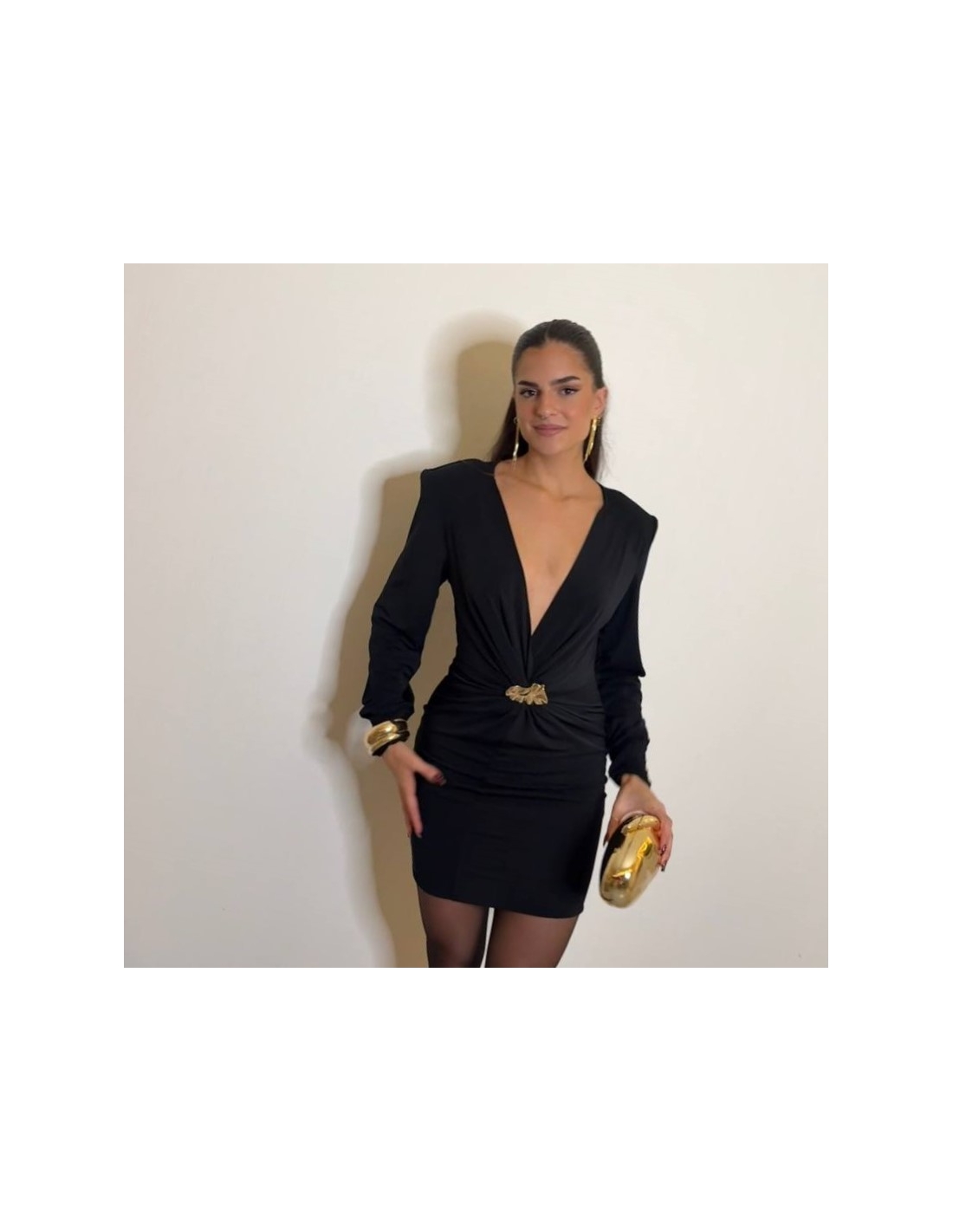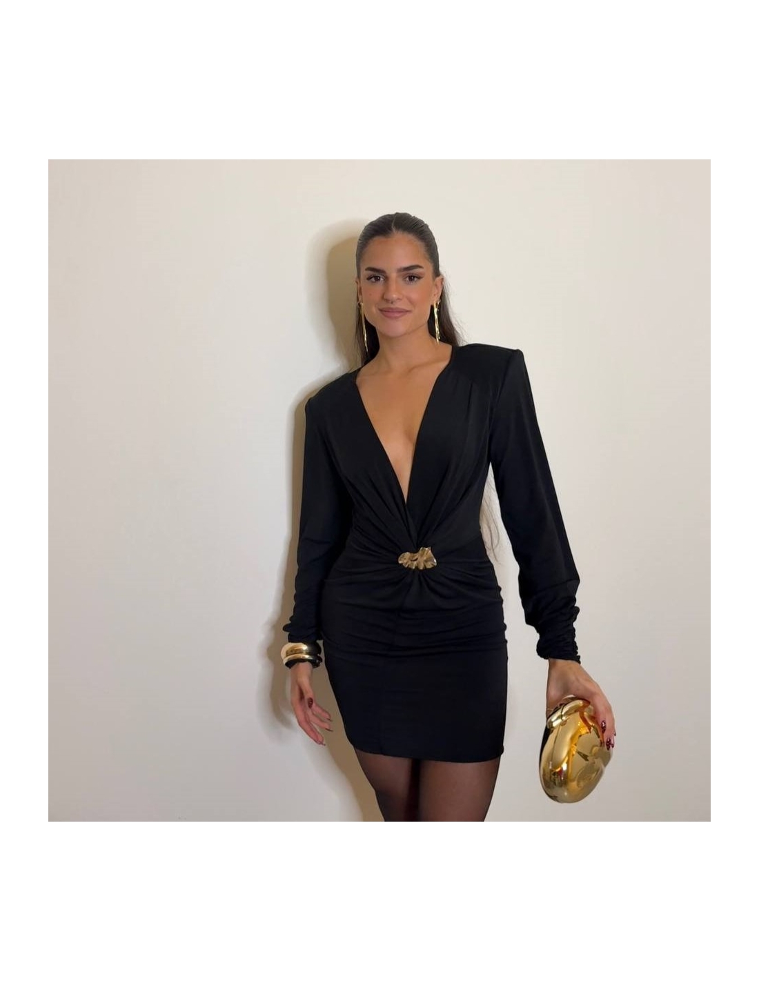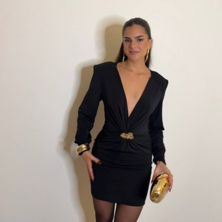 Vestido corto con hombreras en tono negro. De manga larga. Escote en V y joya en tono dorado. Talla única