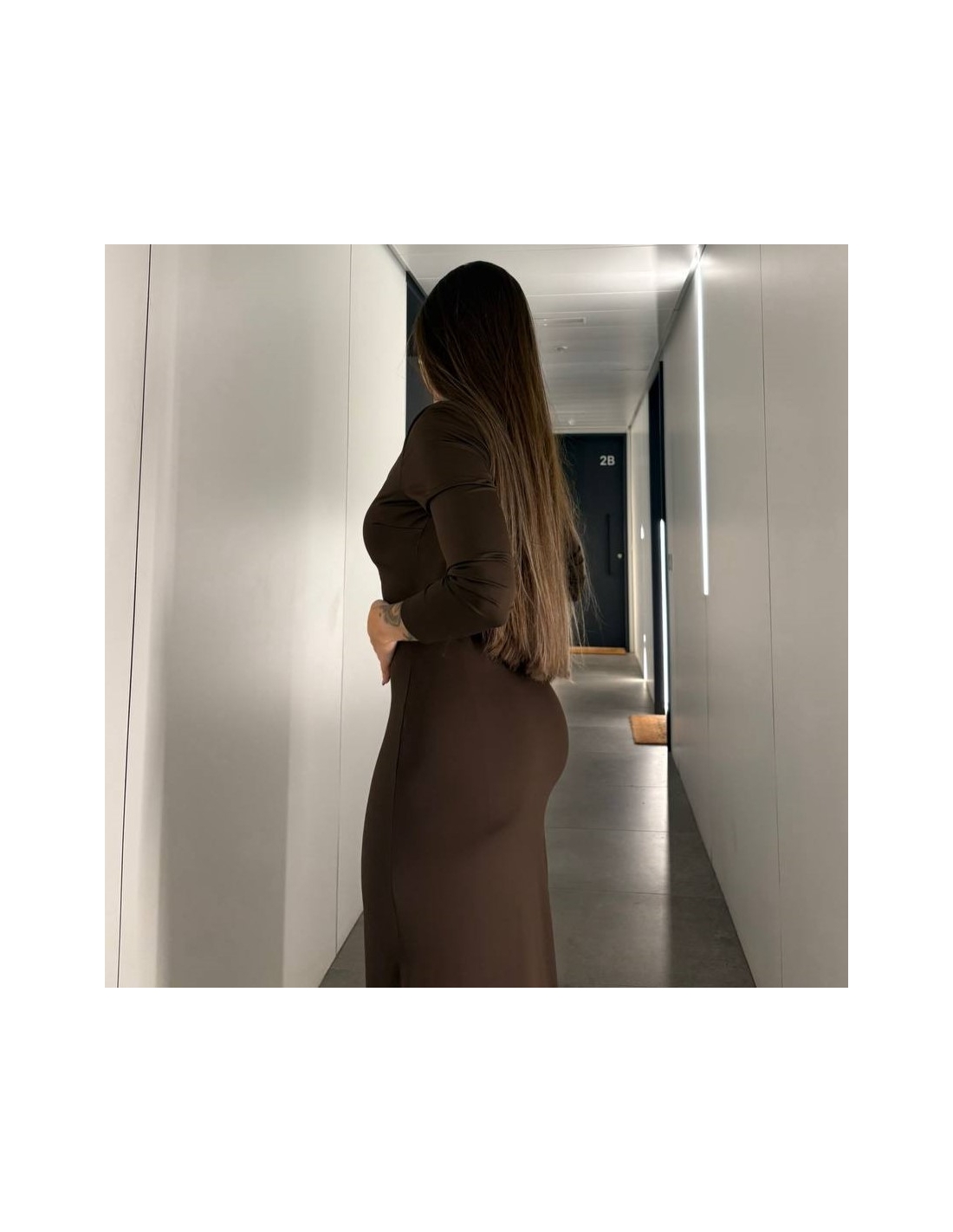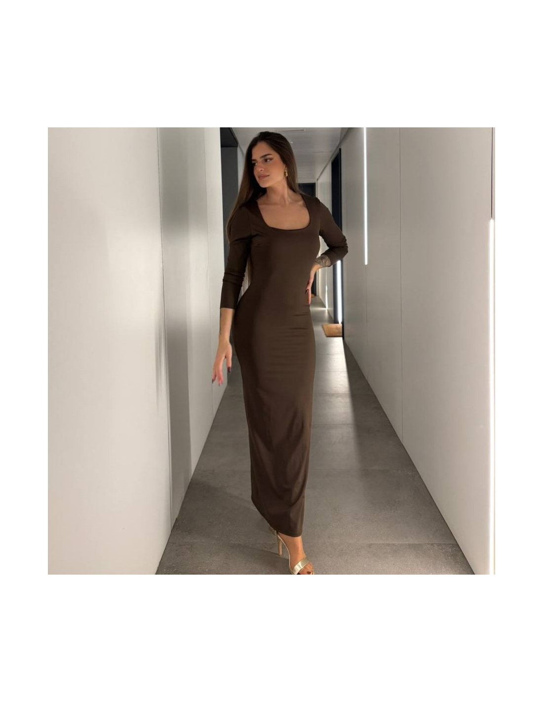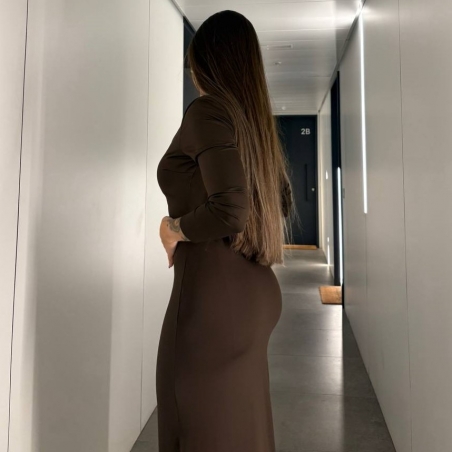 Vestido manga larga de tejido dovle licra en tono choco. Escote redondo. Talla única.