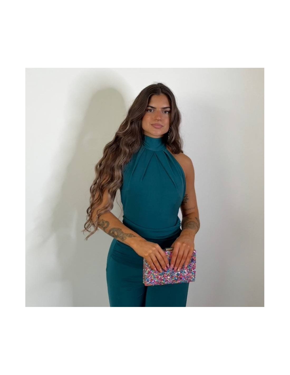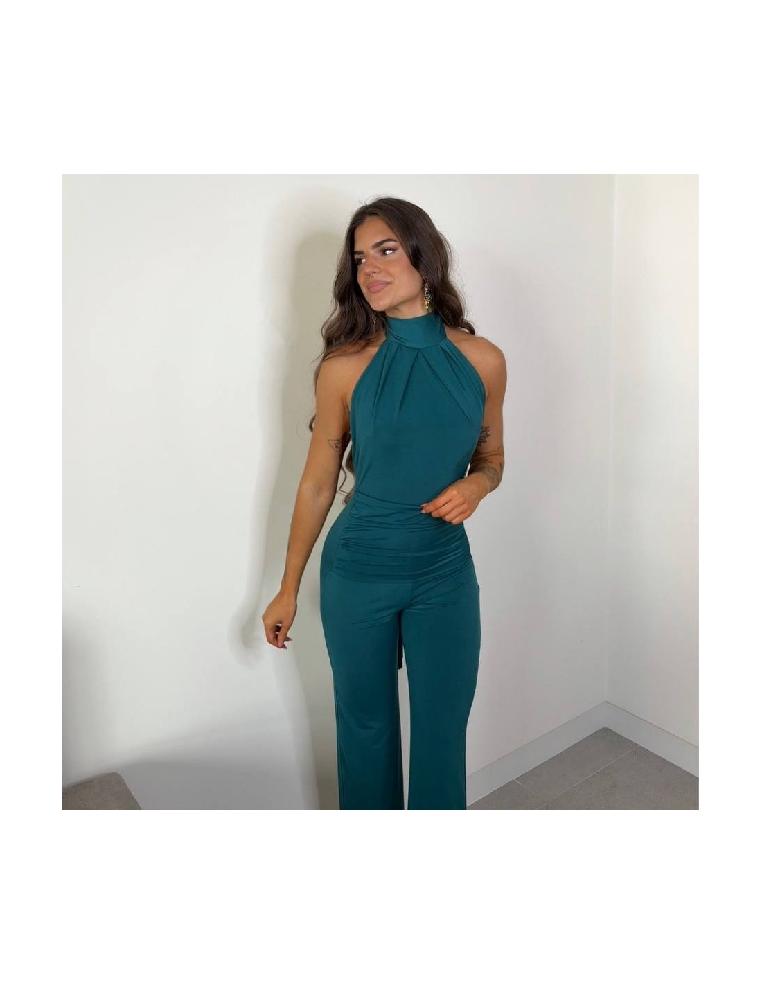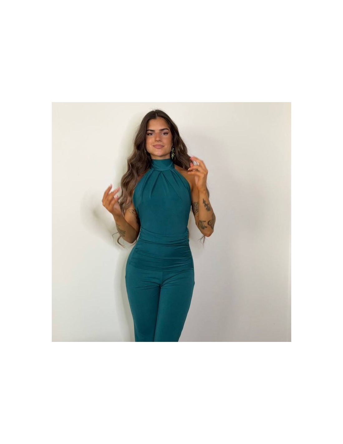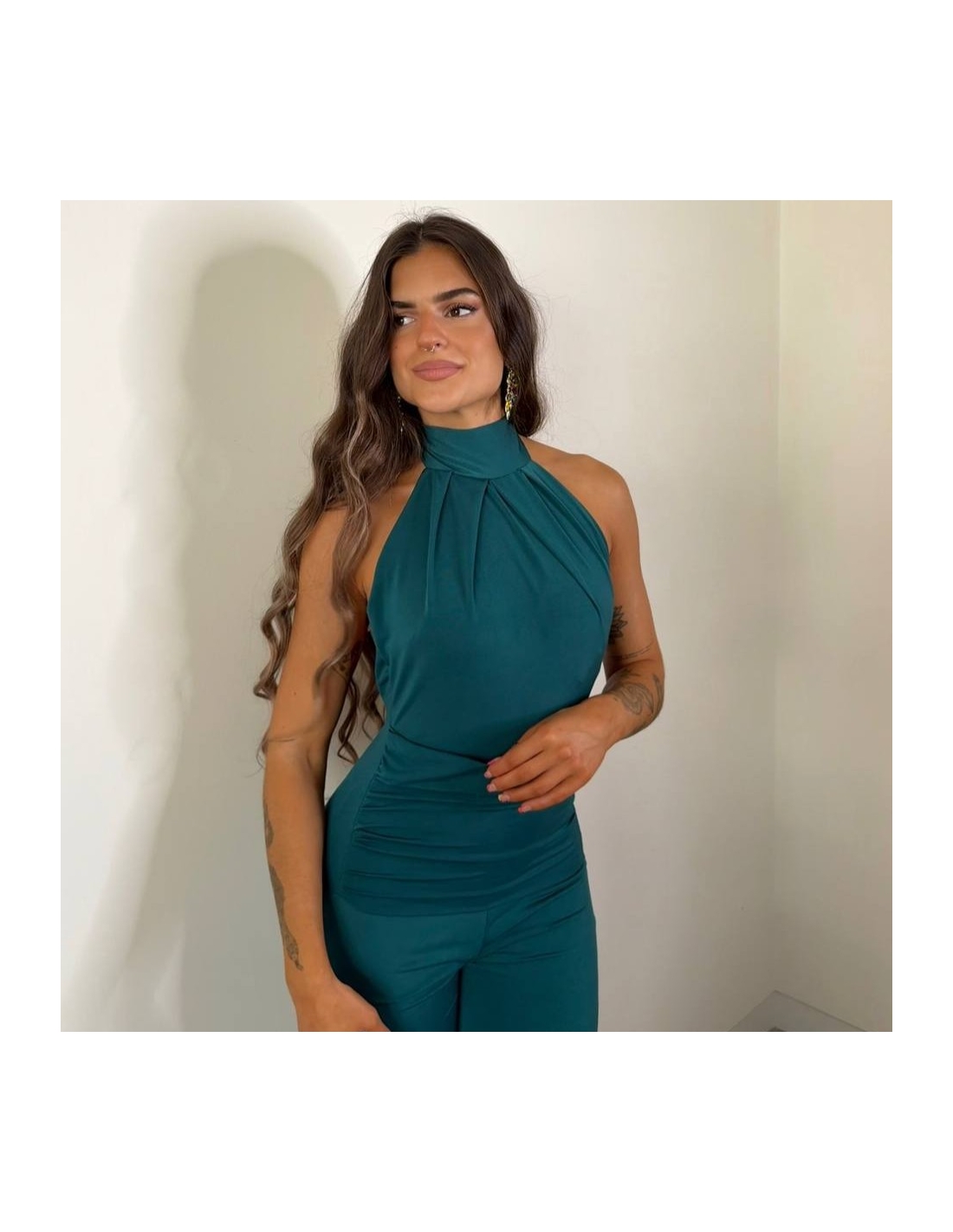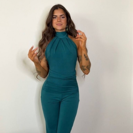 Mono halter regulable al cuello con lazada a tono. De campana. Fruncido en parte delantera. Elástico. Talla única