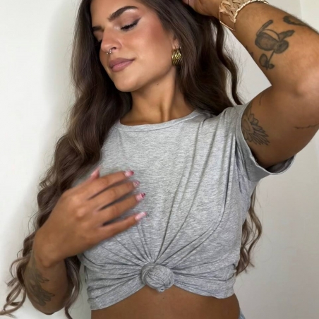 Camiseta corta en tono gris. Cuello redondo. De manga corta. Elástica. Cortita. Talla única