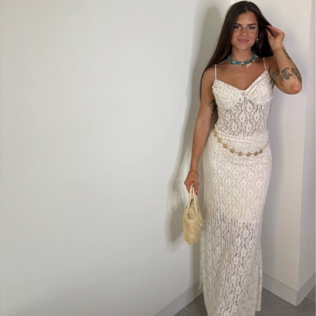 Falda encaje larga con forro mini interior a tono. Cintura elástica. De tiro alto. Talla única