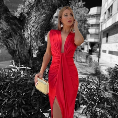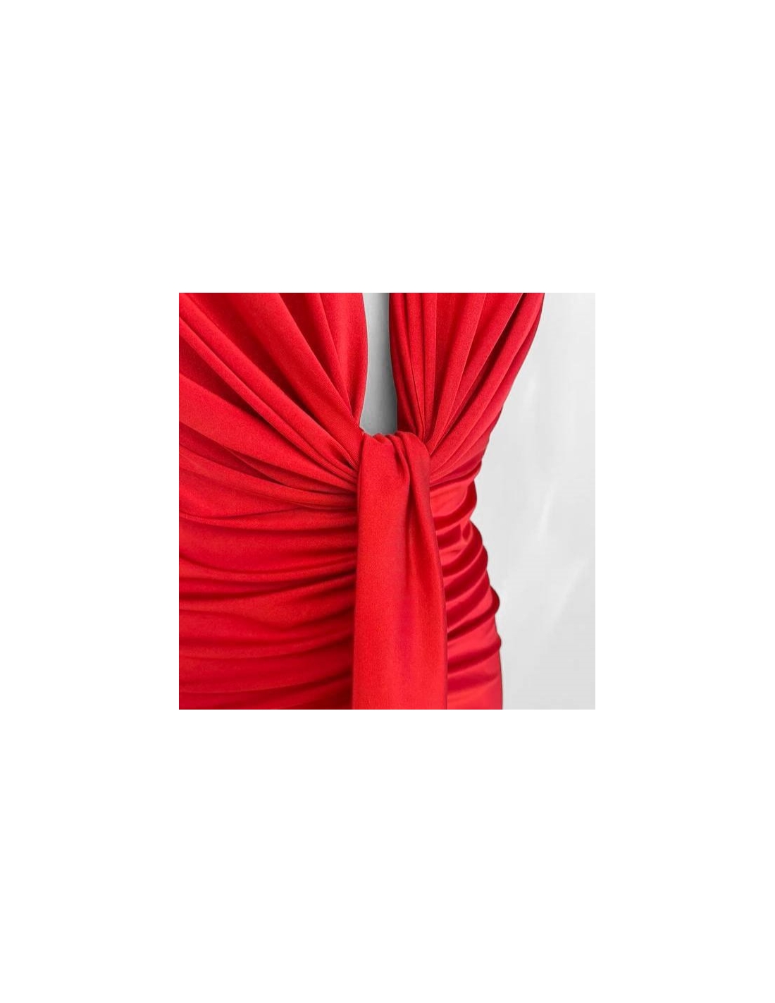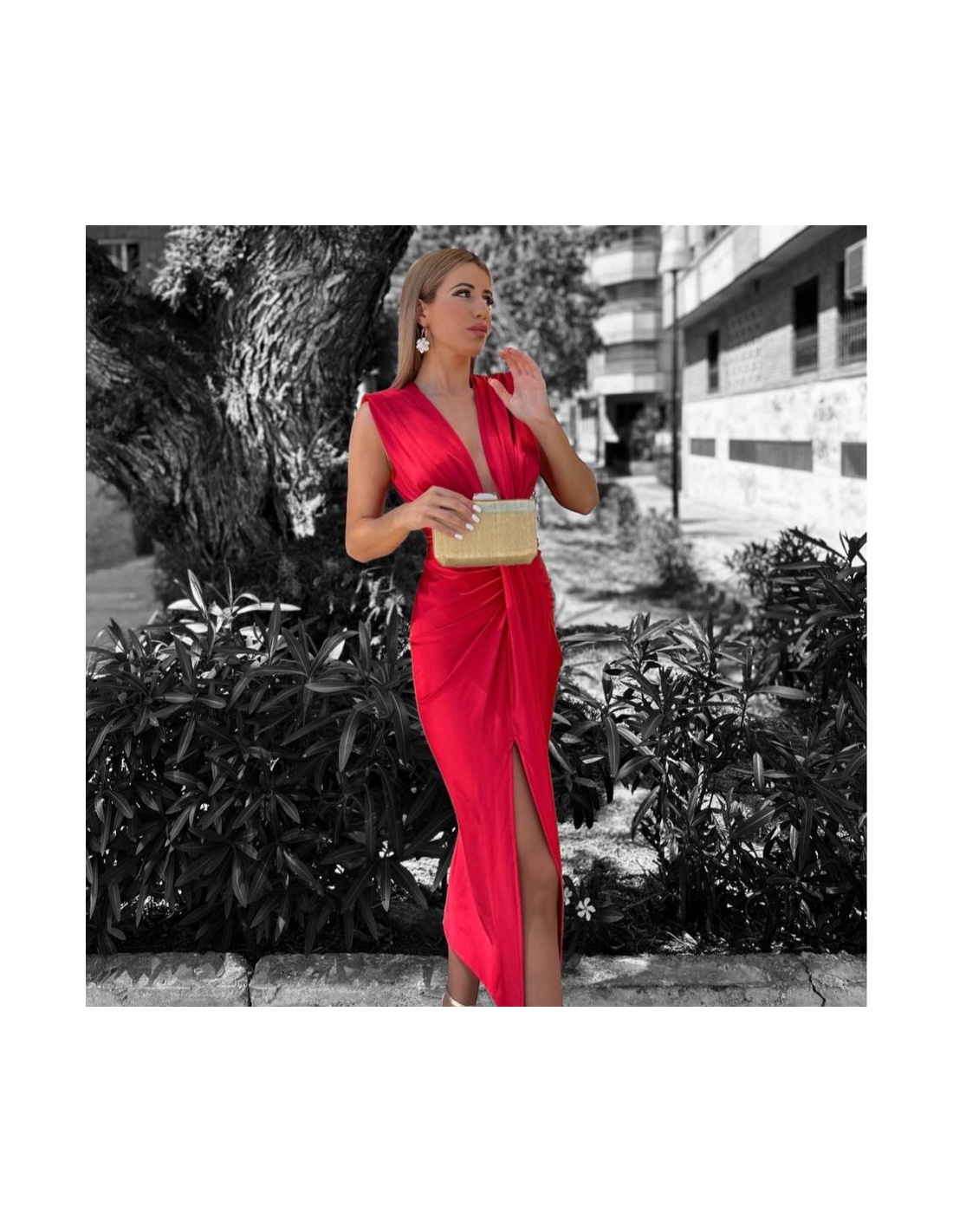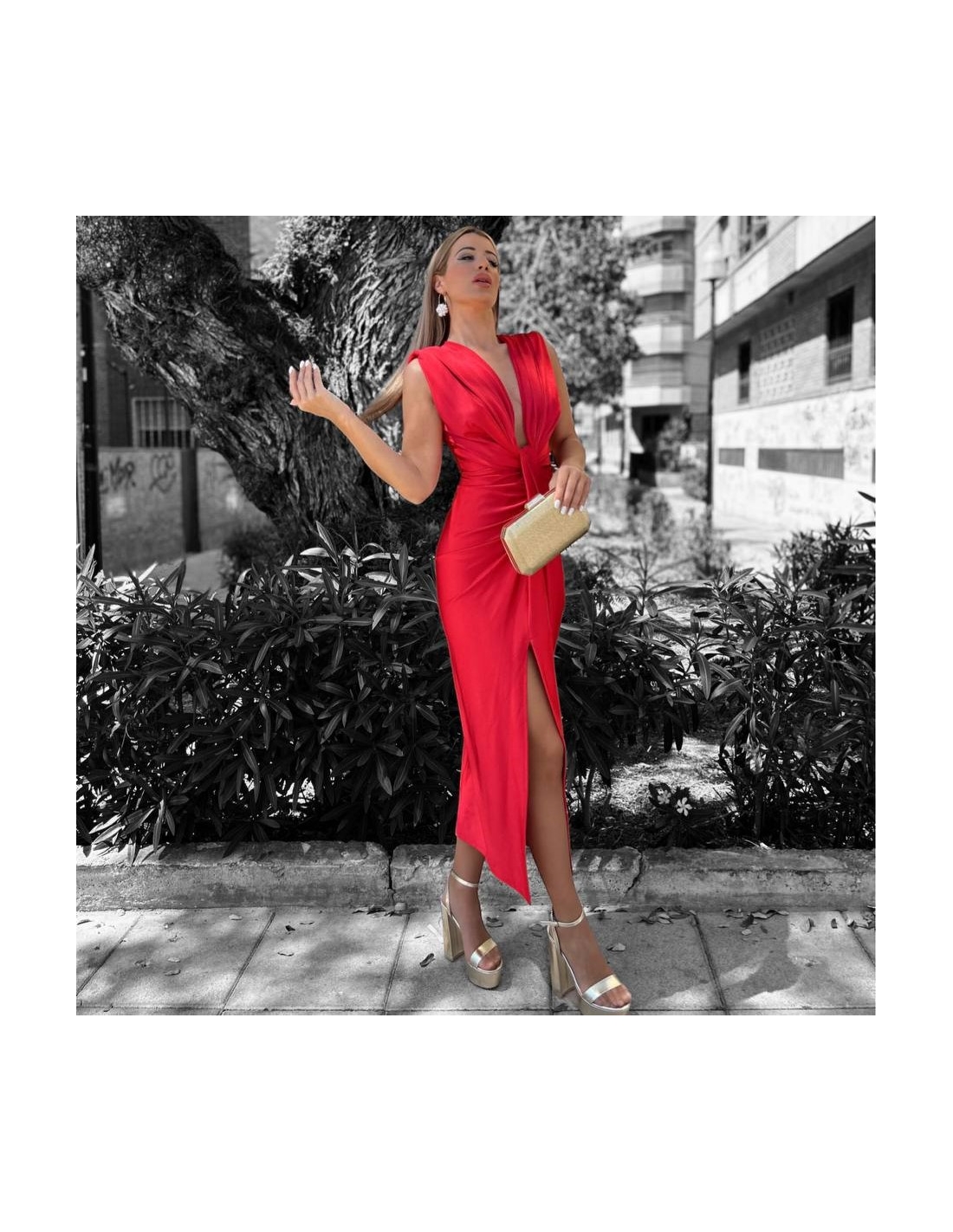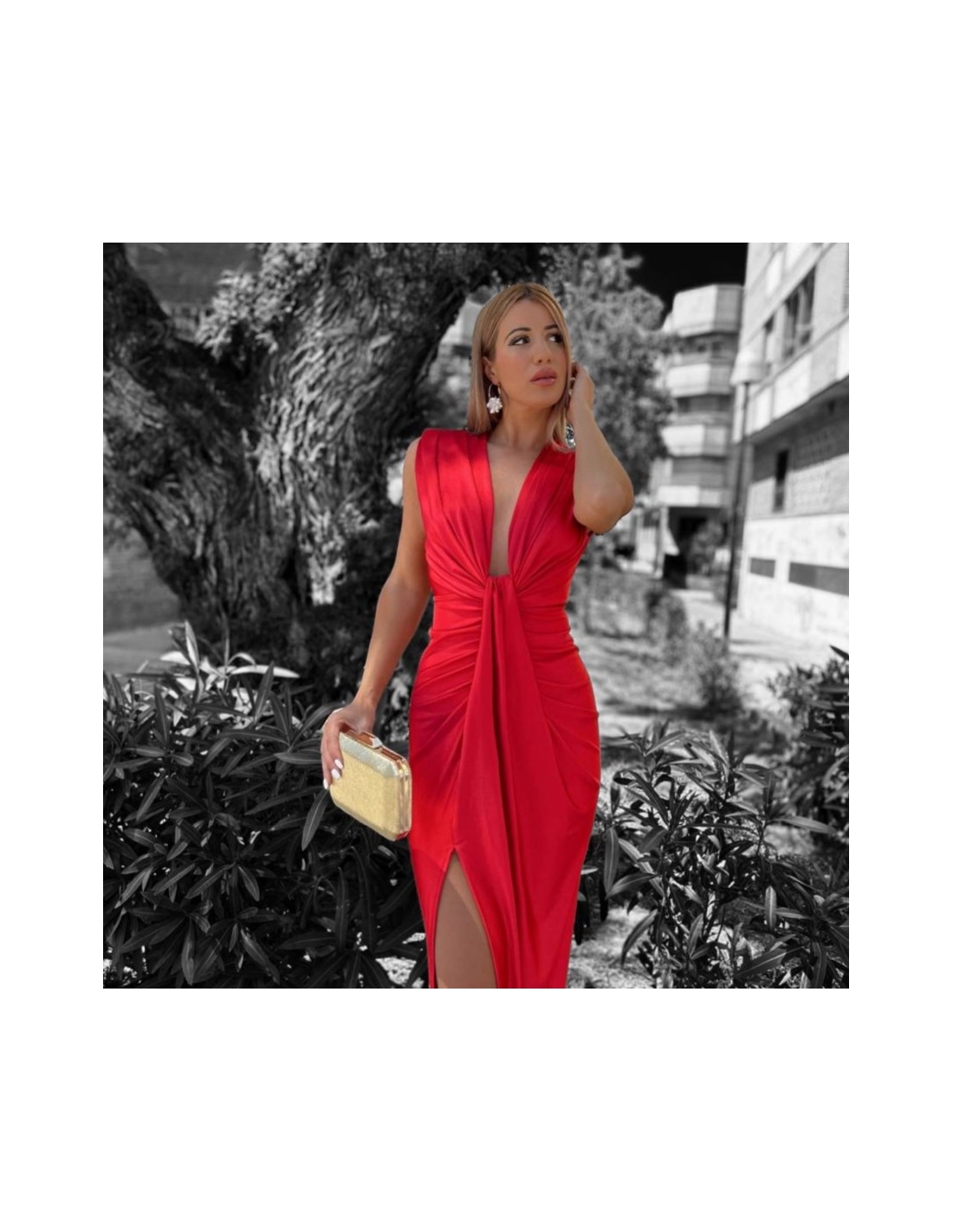 Vestido evento nudo. Con hombreras. Nudo en parte delantera y abertura. Midi. Fruncido. Talla única
