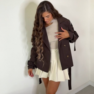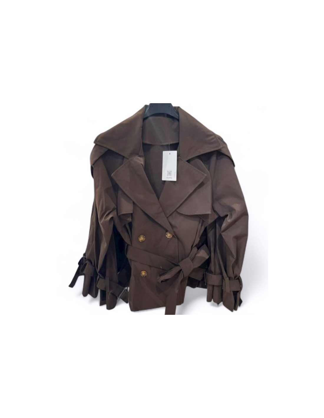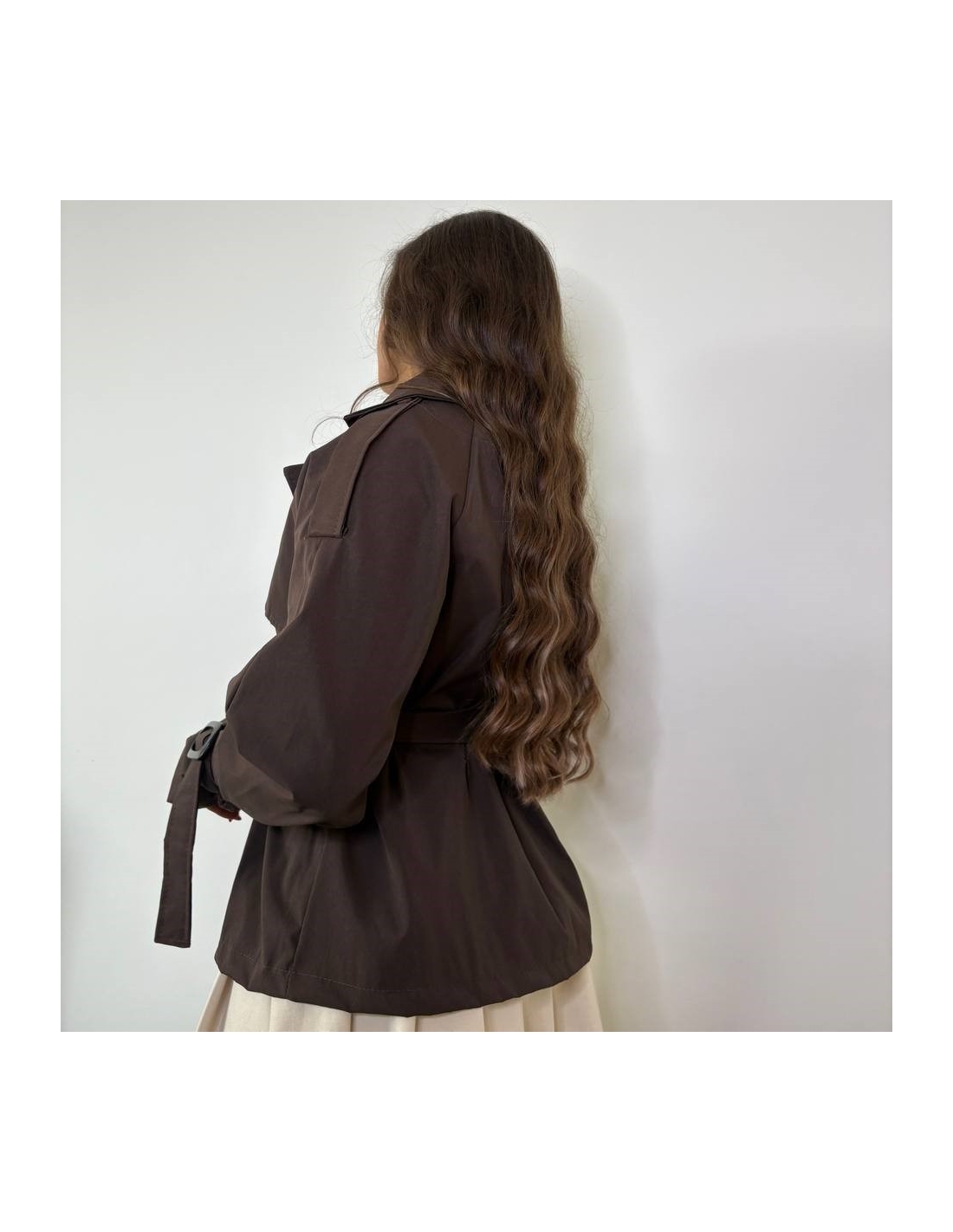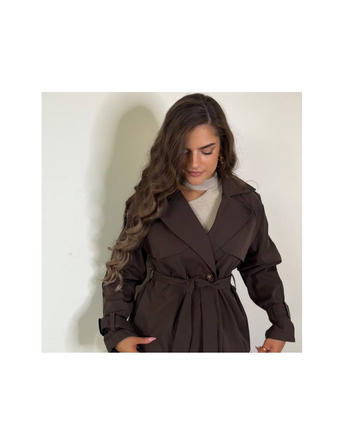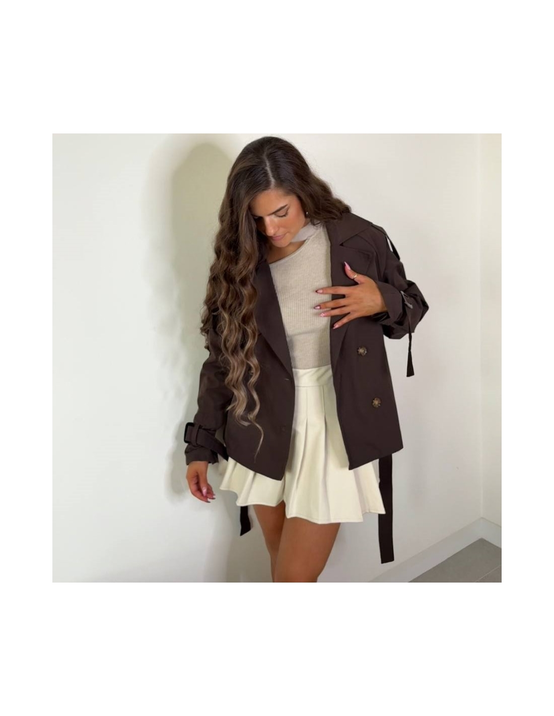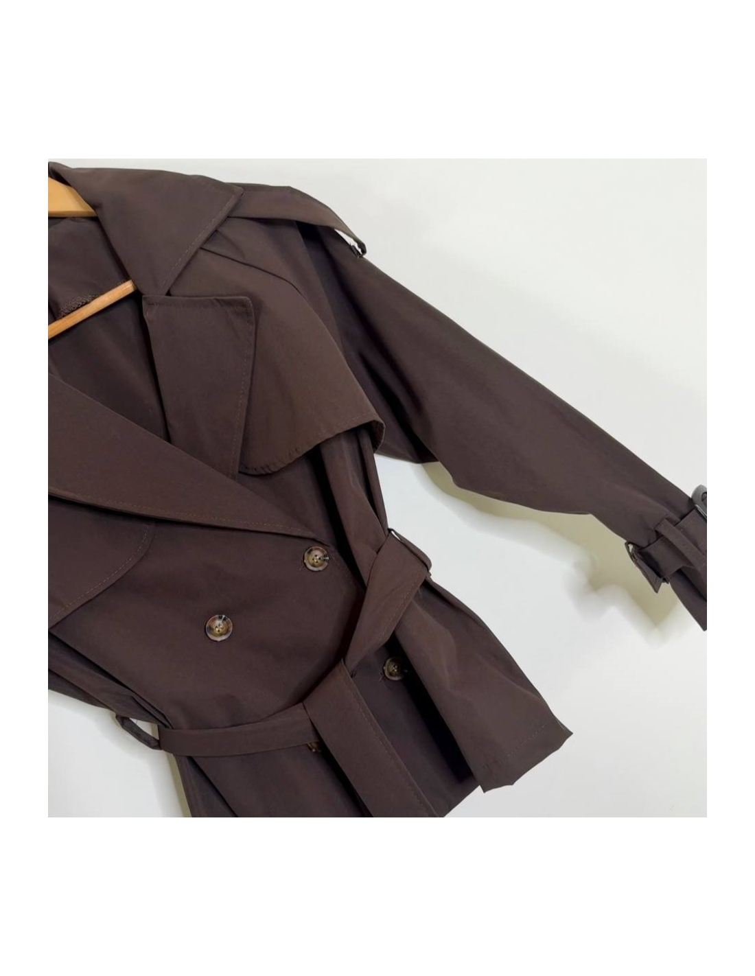Gabardina corta en tono choco. Cierre delantero abotonado. Cuello de solapa. Muñeca regulable. Talla única