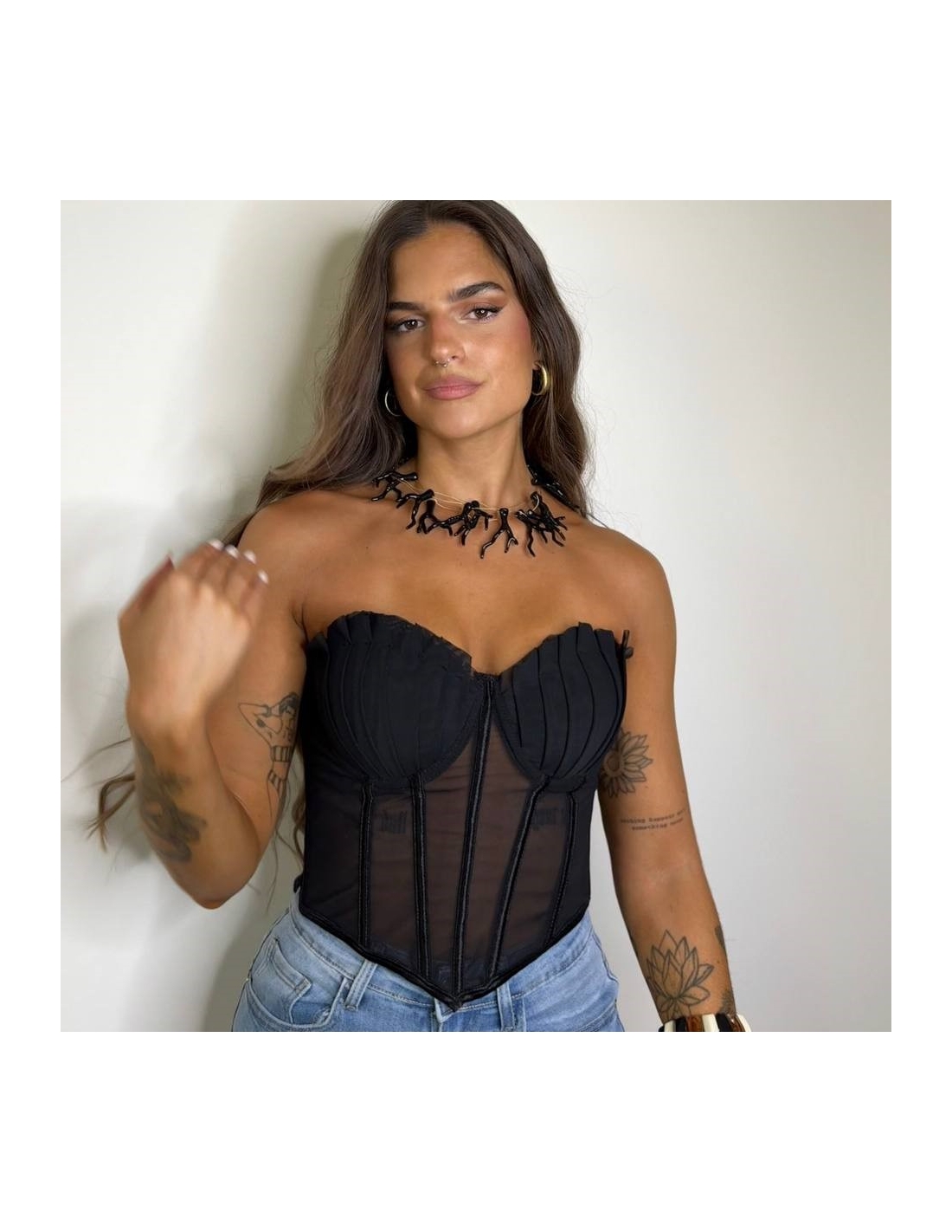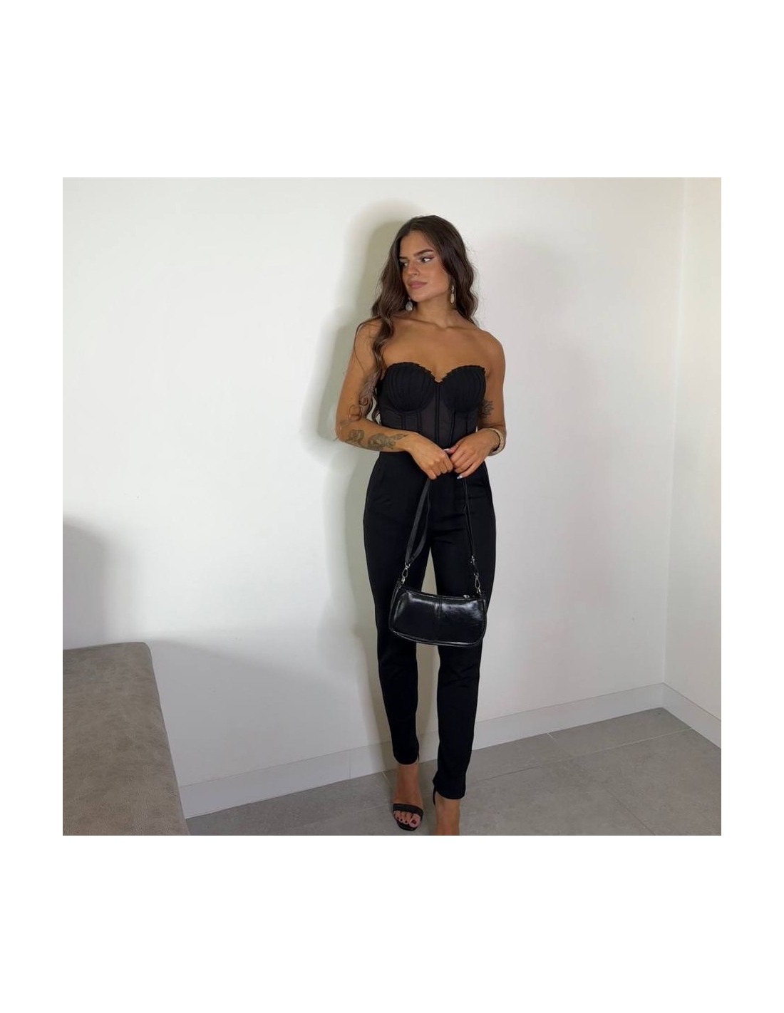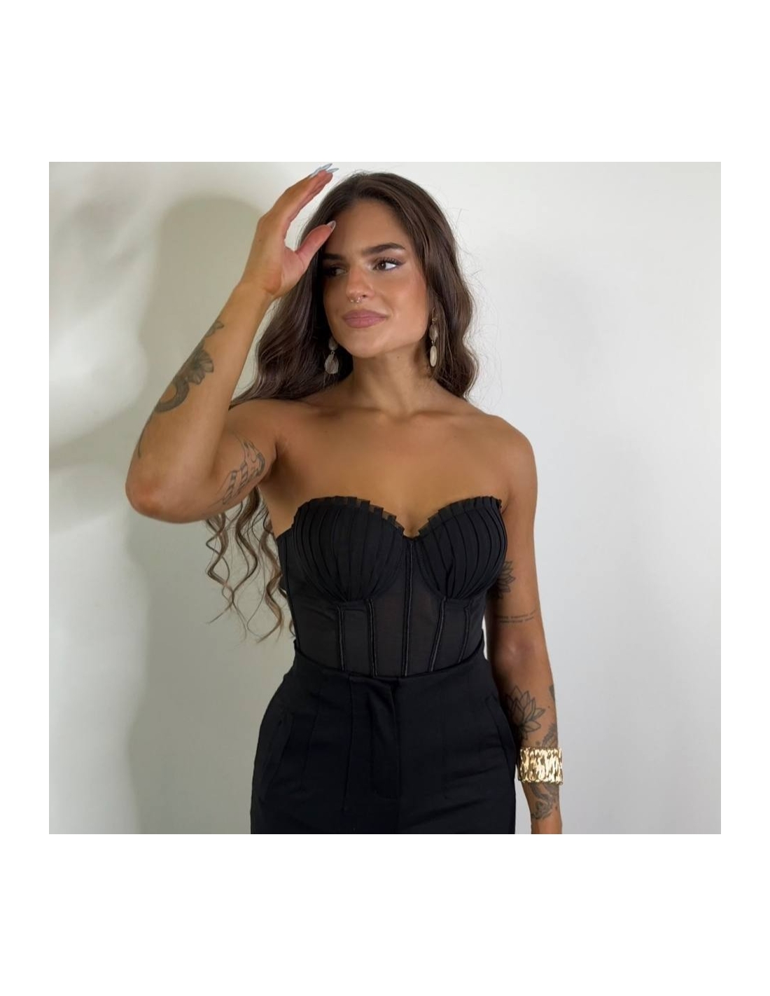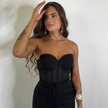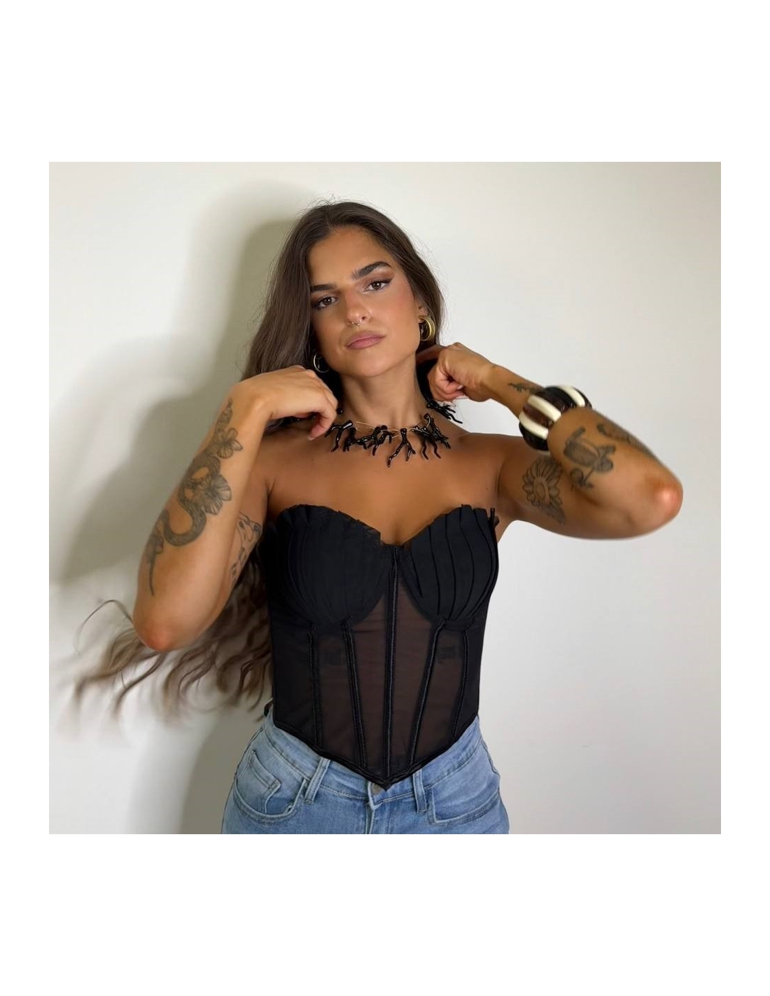 Coset varillas entono negro. Casco incorporado. Regulable con corchetes en parte trasera. Posibilidad de usar con tirantas regulables a tono.