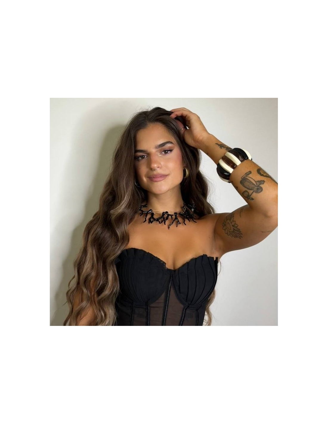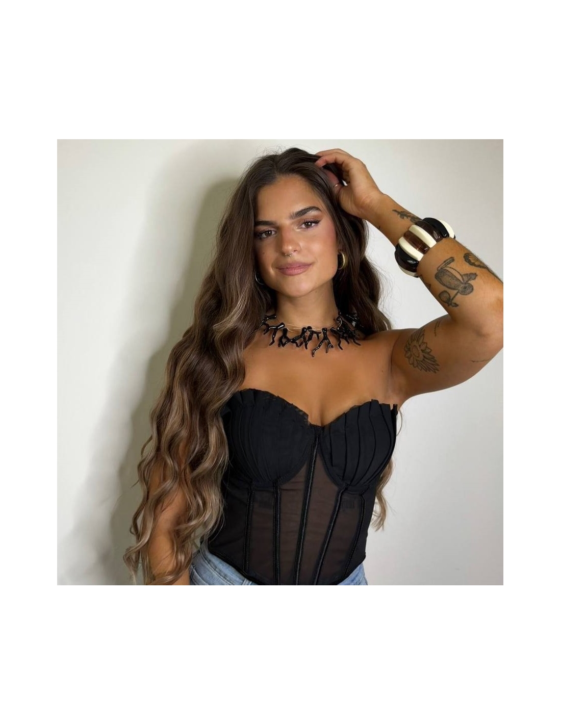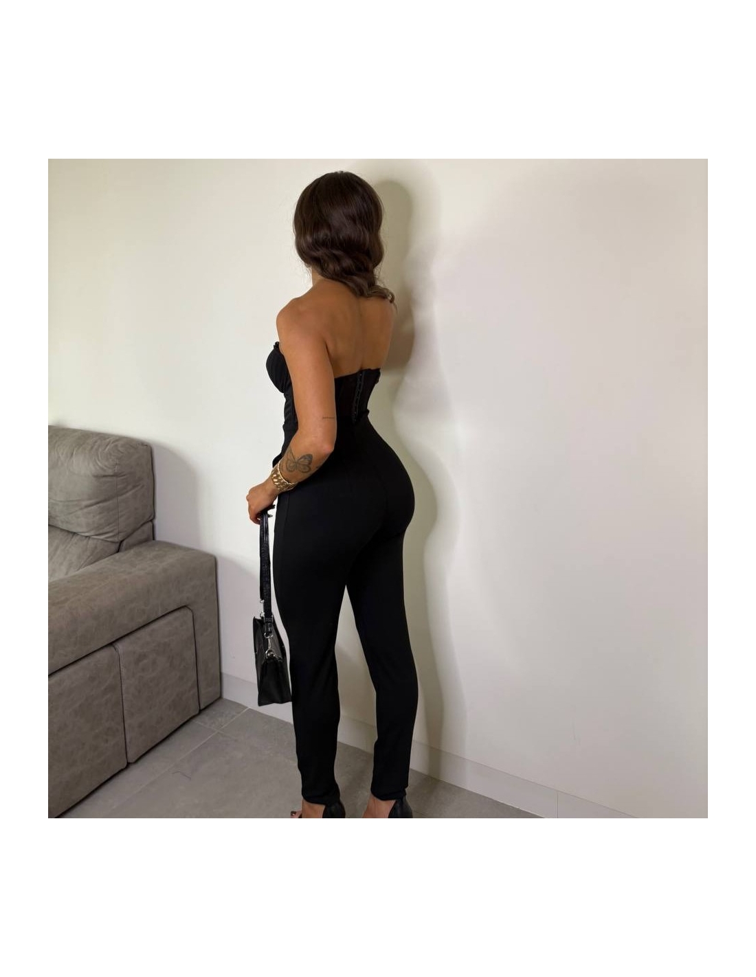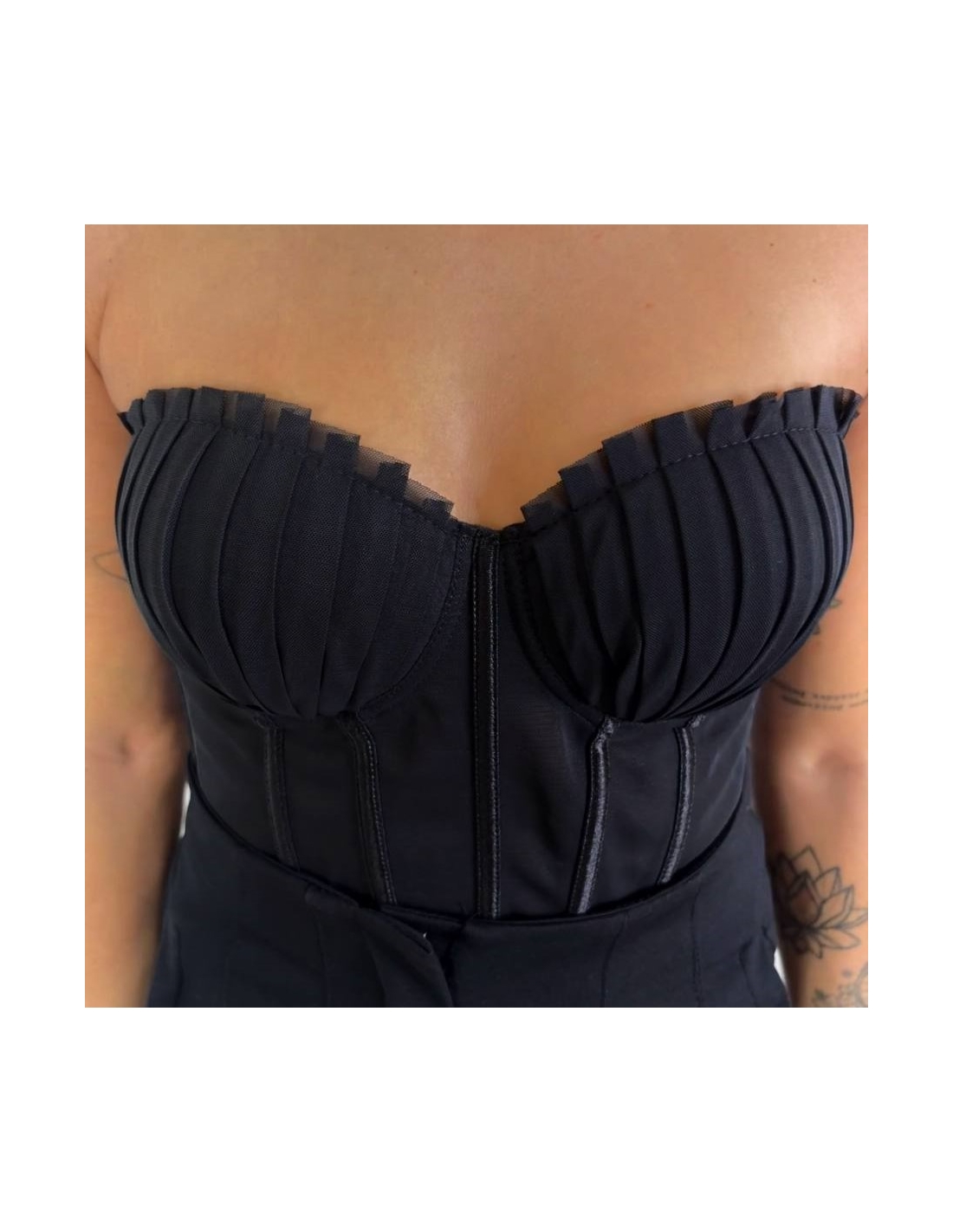 Coset varillas entono negro. Casco incorporado. Regulable con corchetes en parte trasera. Posibilidad de usar con tirantas regulables a tono.