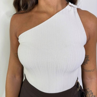 Body asimétrico de tejido elástico con detalle dorado en hombro. Talla única.