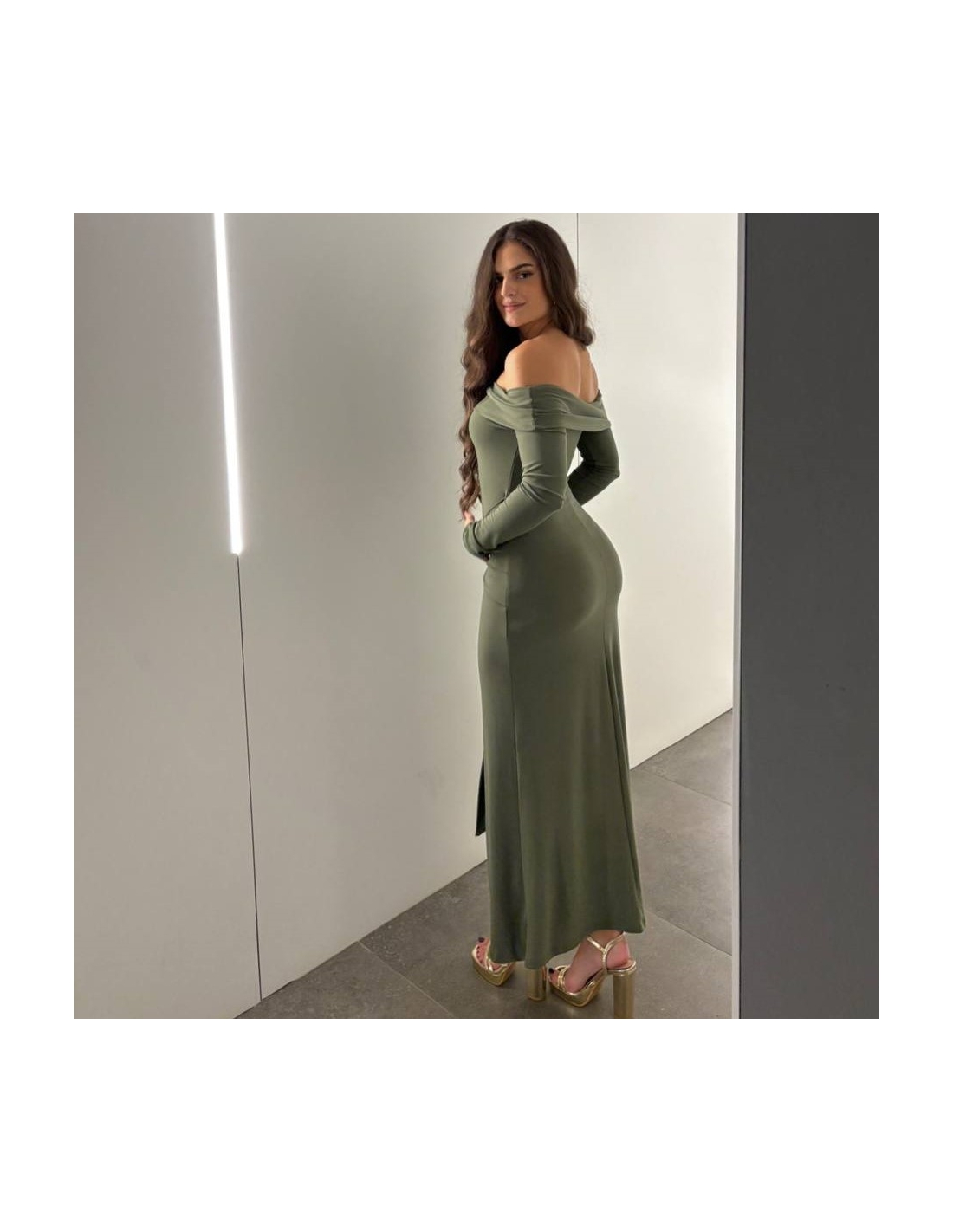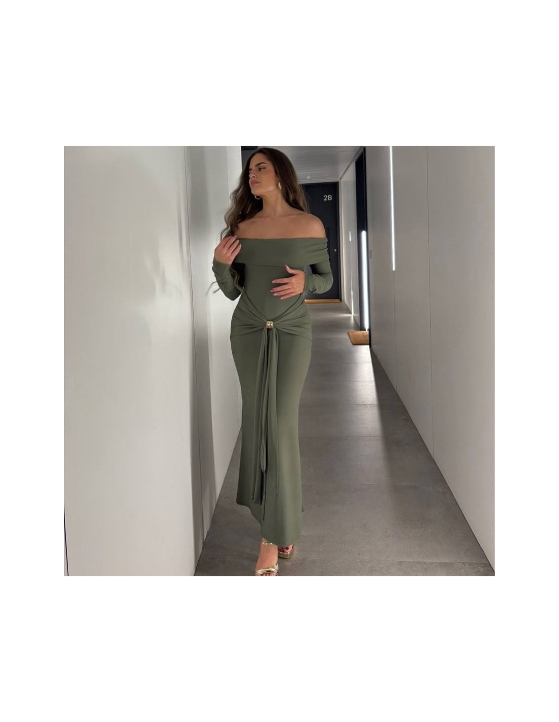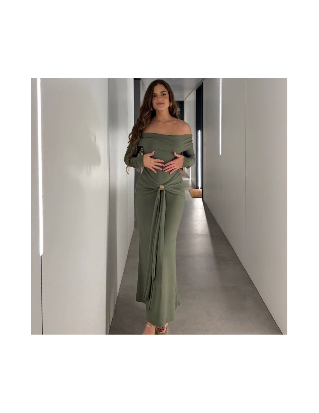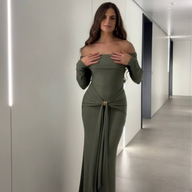 Vestido de palabra de honor en tono verde caqui con detalle hebilla dorada en parte delantera y fruncido. Talla única.