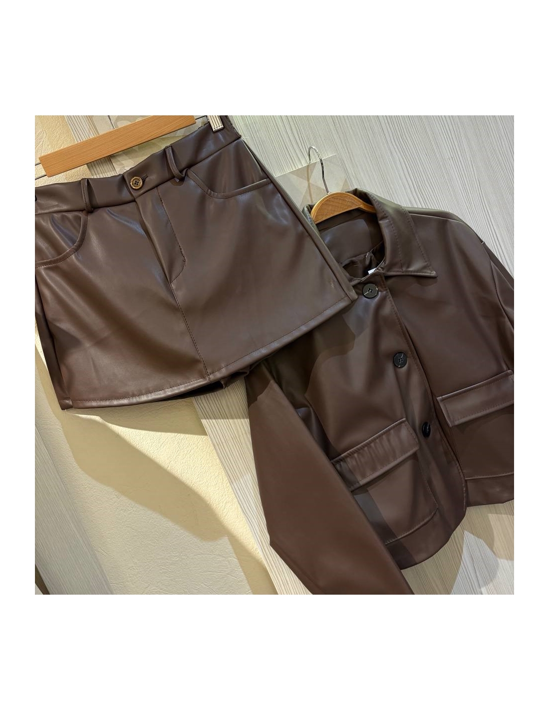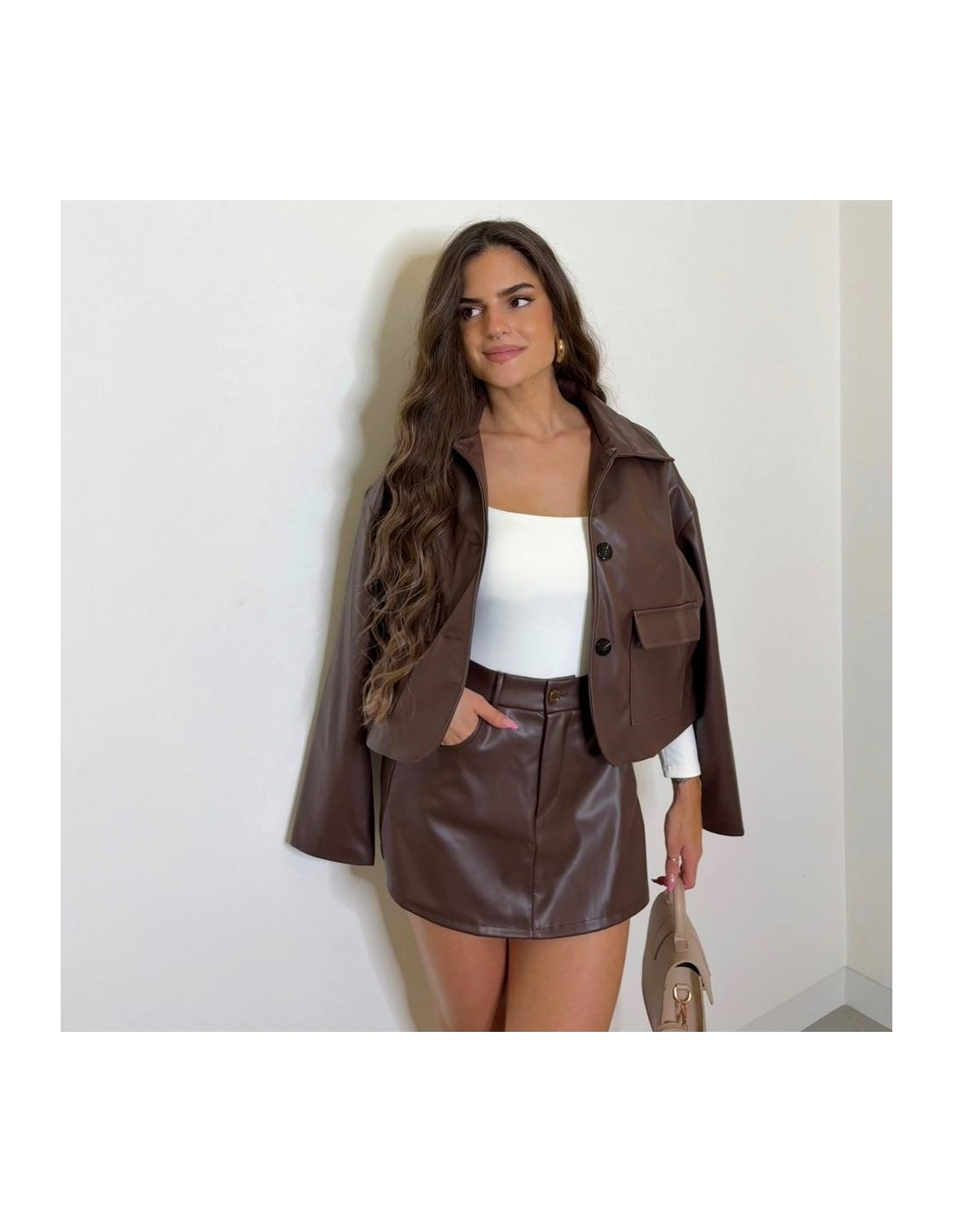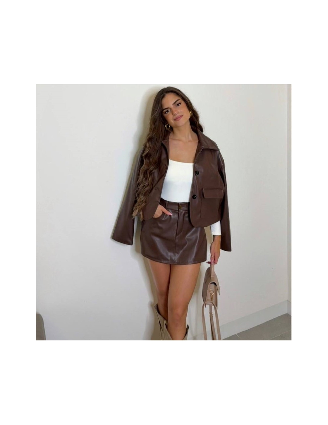 Conjunto efecto piel en tono choco. Cazadora de corte oversize con forro interior abotonada. Falda pantalón. Talla única. Calidad +++++++
