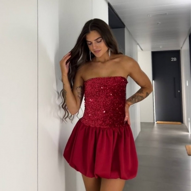 Vestido globo de lentejuelas con volantes en bajo. Con forro interior a tono. Elástico. Talla única