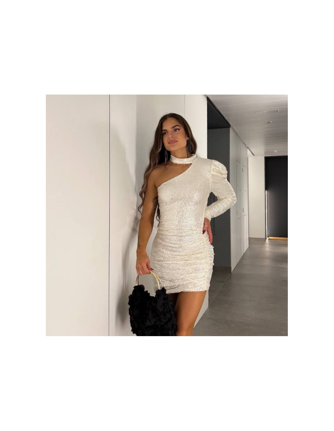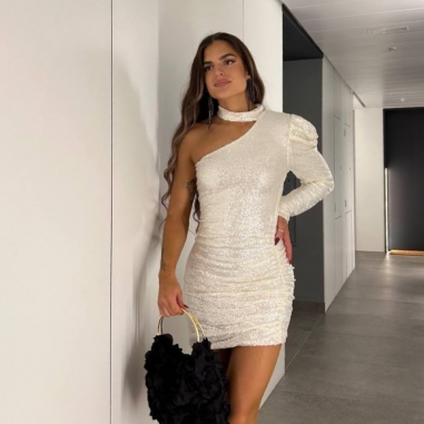 Vestido corto de lentejuelas en tono blanco perla. Con forro interior a tono. Con gargantilla. Talla única