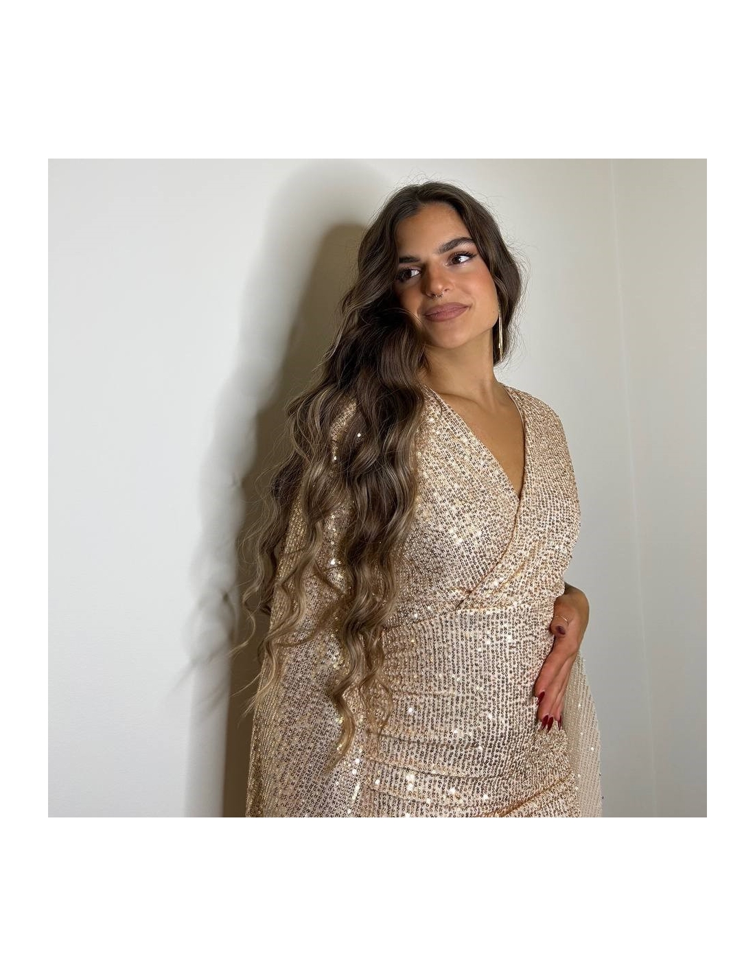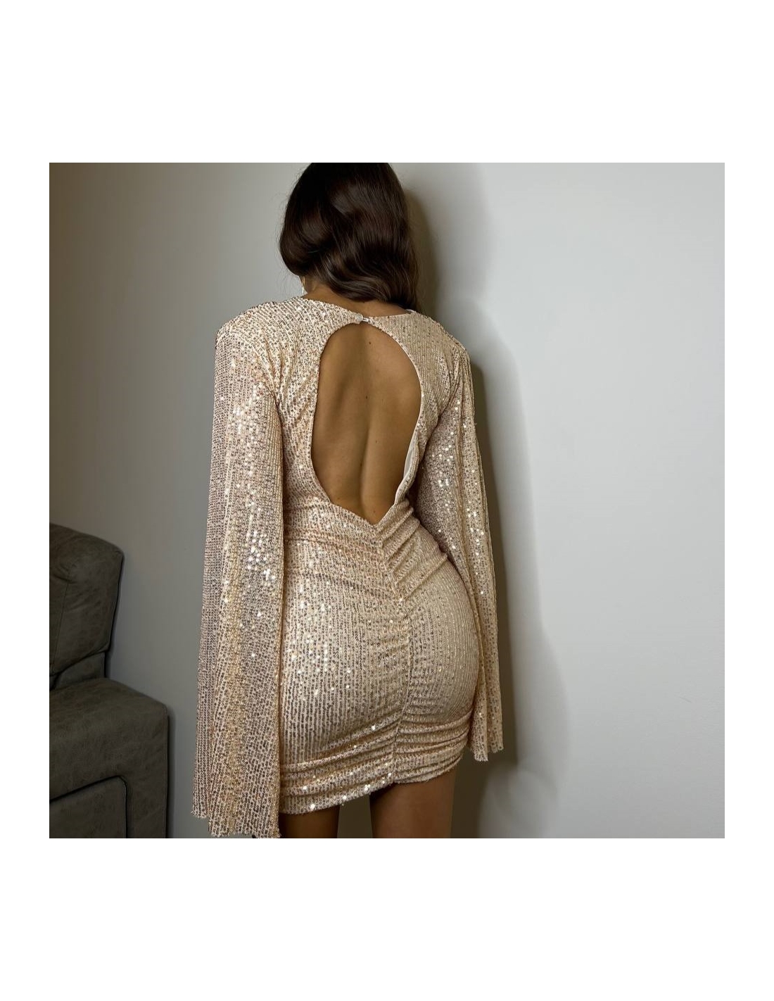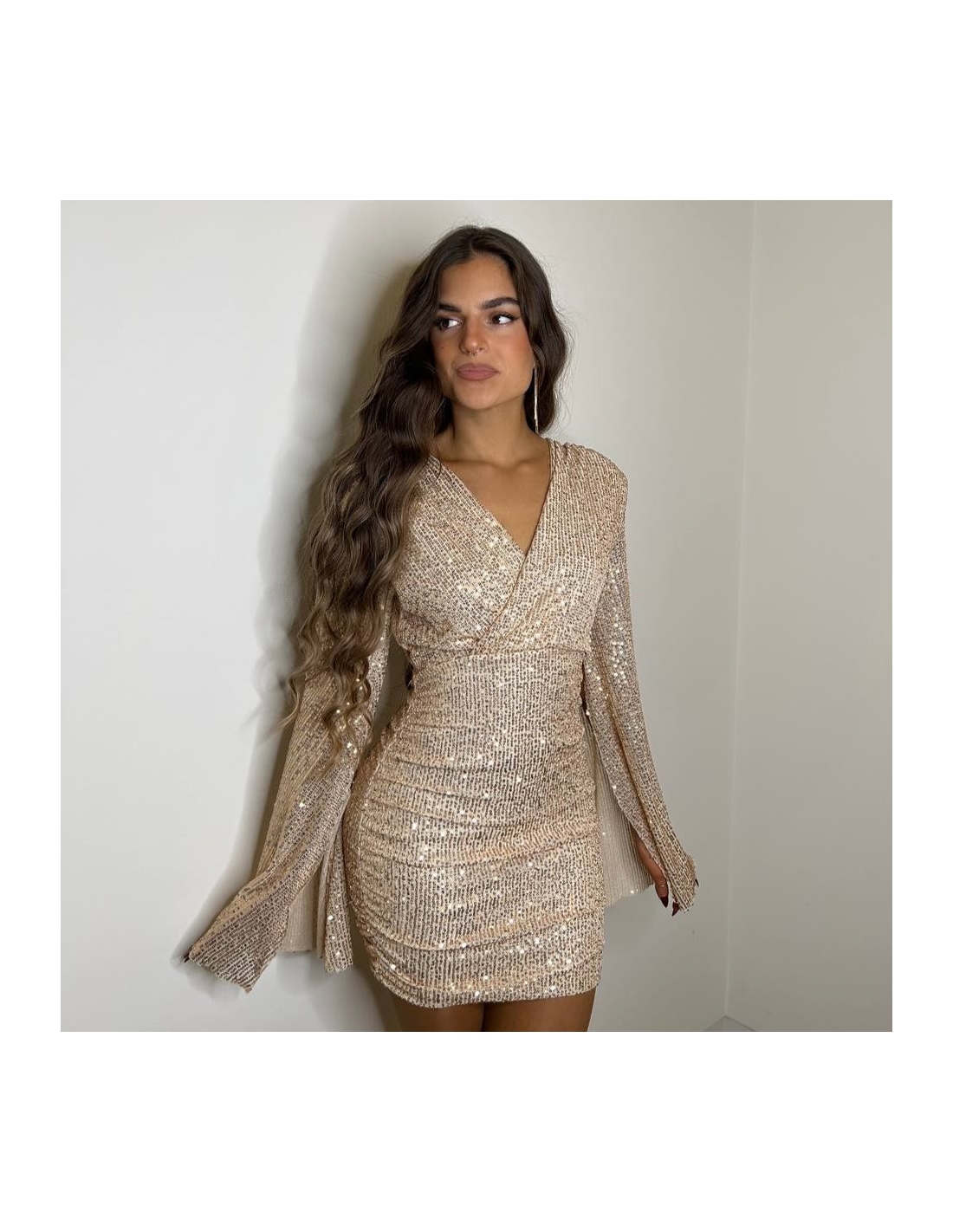 Vestido lentejuelas corto con aberturas en mangas. Escote en V. Escote pronunciado en parte trasera. Con forro interior a tono. Talla única