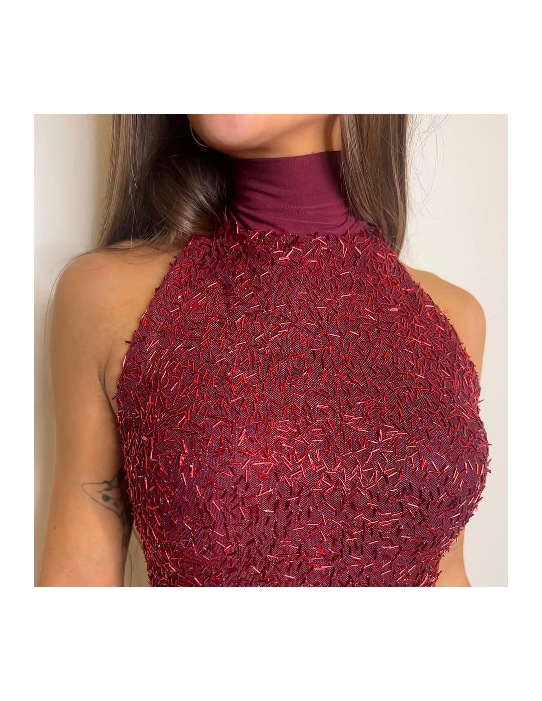 Vestido corto halter en tono vino. Con mini lentejuelas a tono. Con forro interior a tono. Lazada regulable al cuello. Talla única