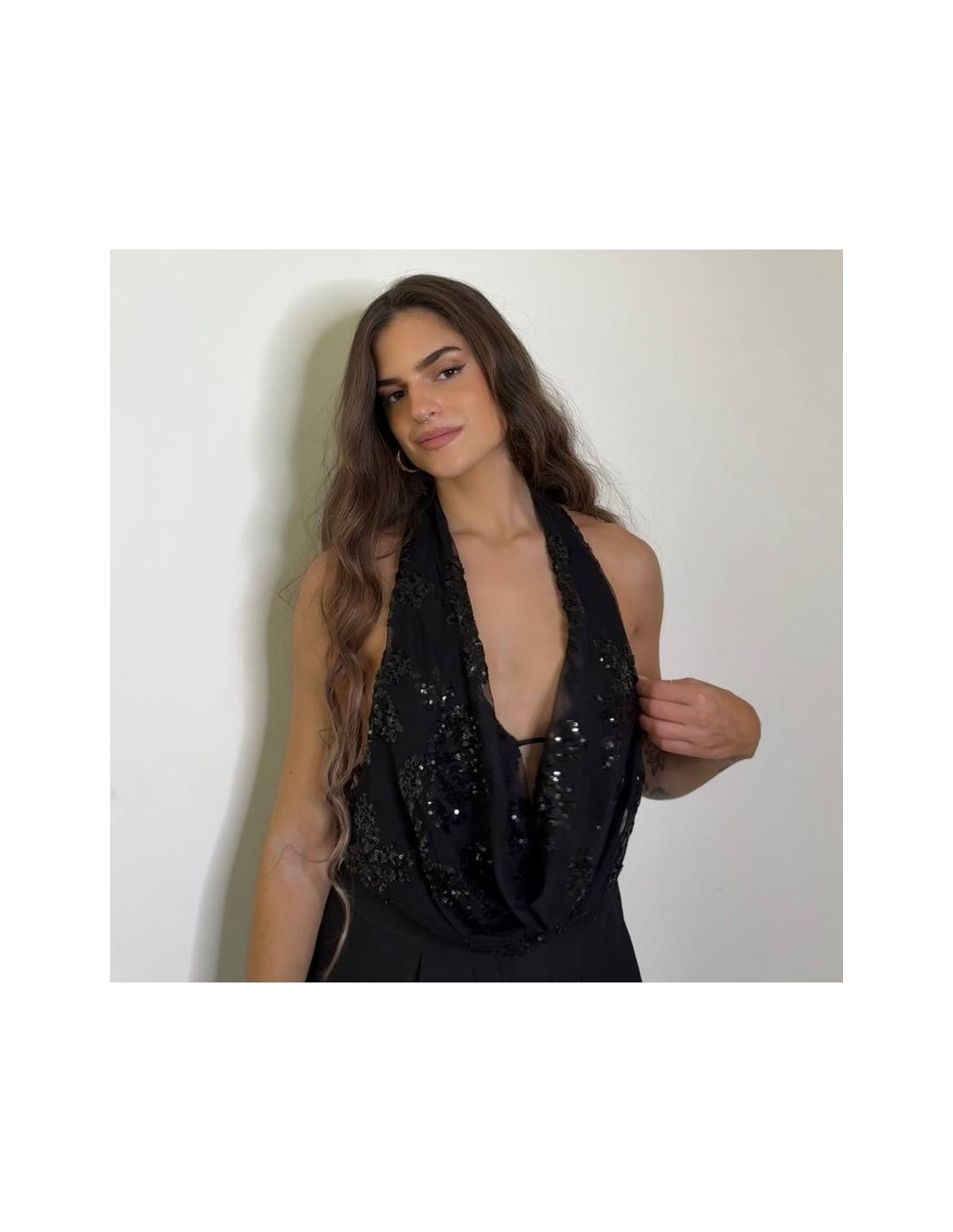 Top lentejuelas en tono negro. Escote fluido. Regulable con lazada a tono en espalda. Con forro interior a tono. Talla única