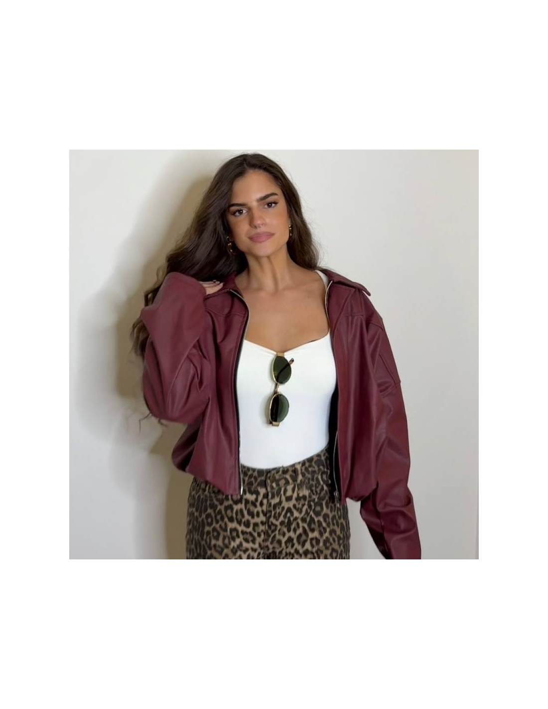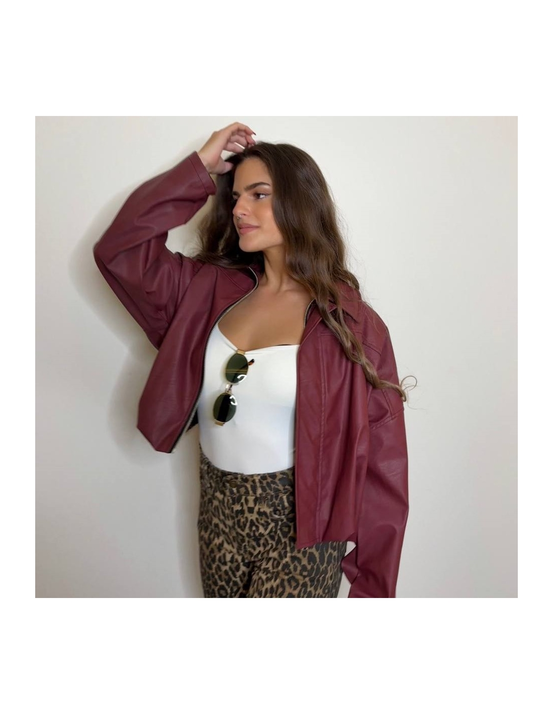 Bomber efecto piel burdeos. Con forro interior a tono. De manga larga. Cierre delanero con cremallera y botones. Talla única