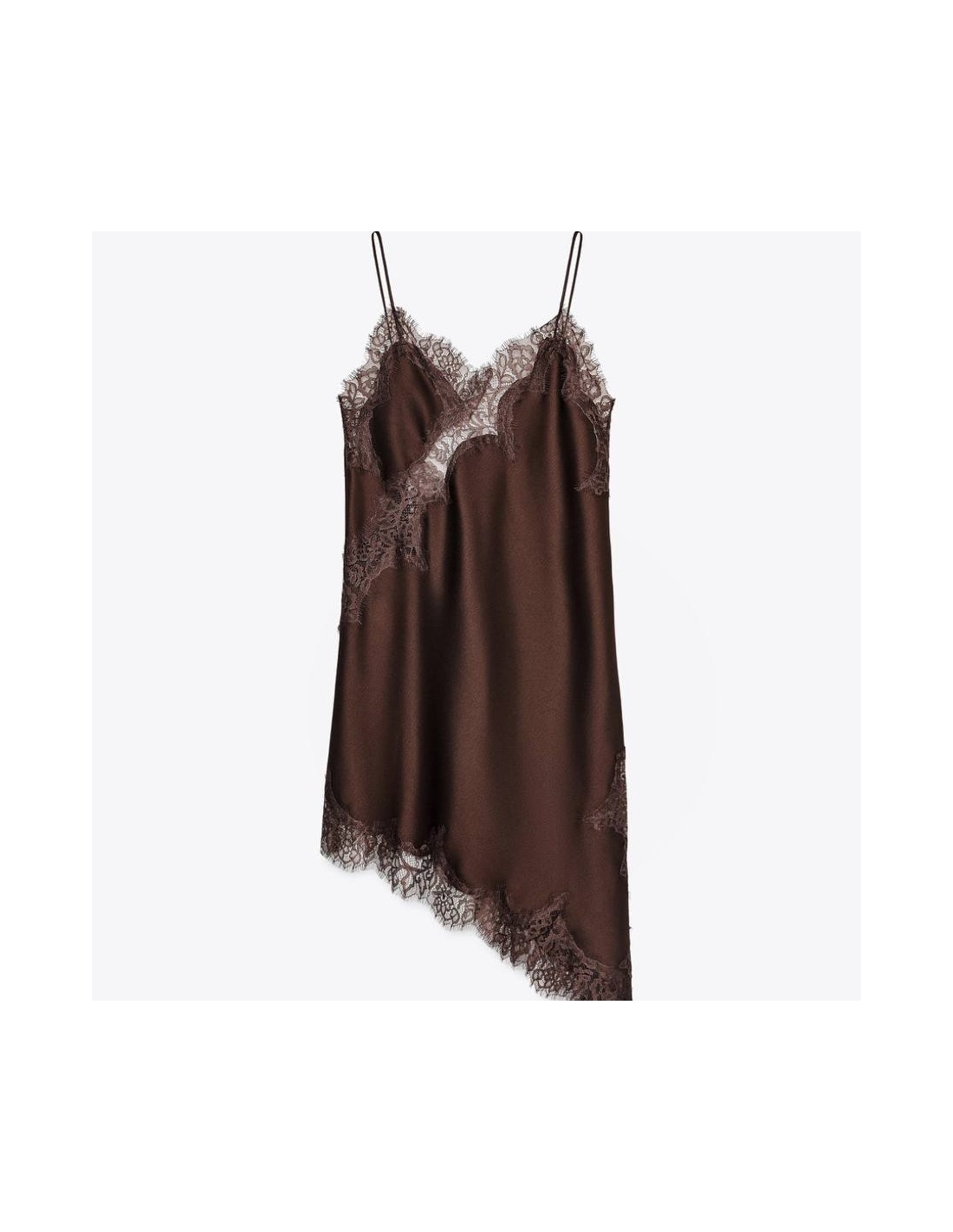 Vestido lencero midi. Tirantas finas a tono. Escote V con detalle encaje. Fluido. Talla única