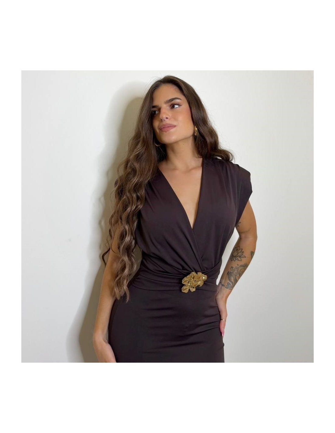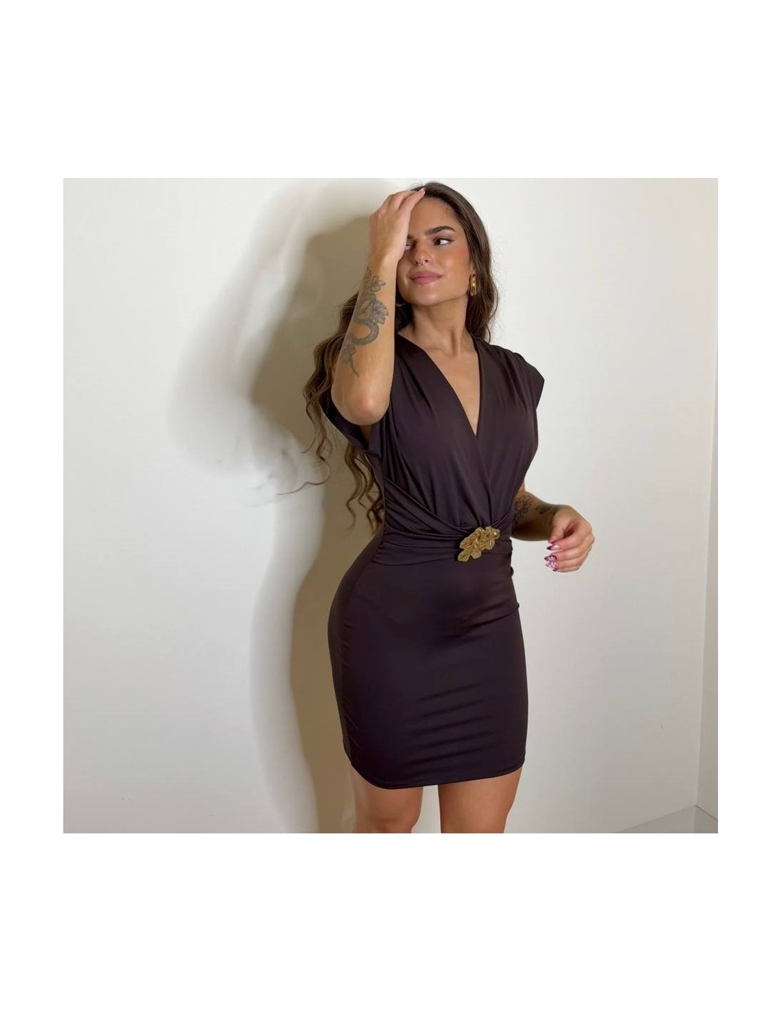 Vestido corto hombreras en tono choco con detalle dorado delantero. Talla única.