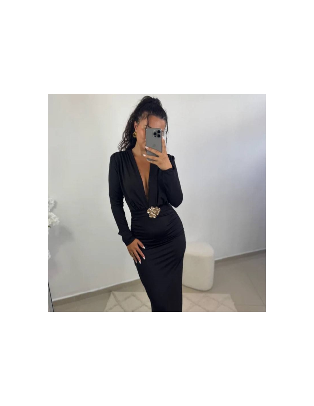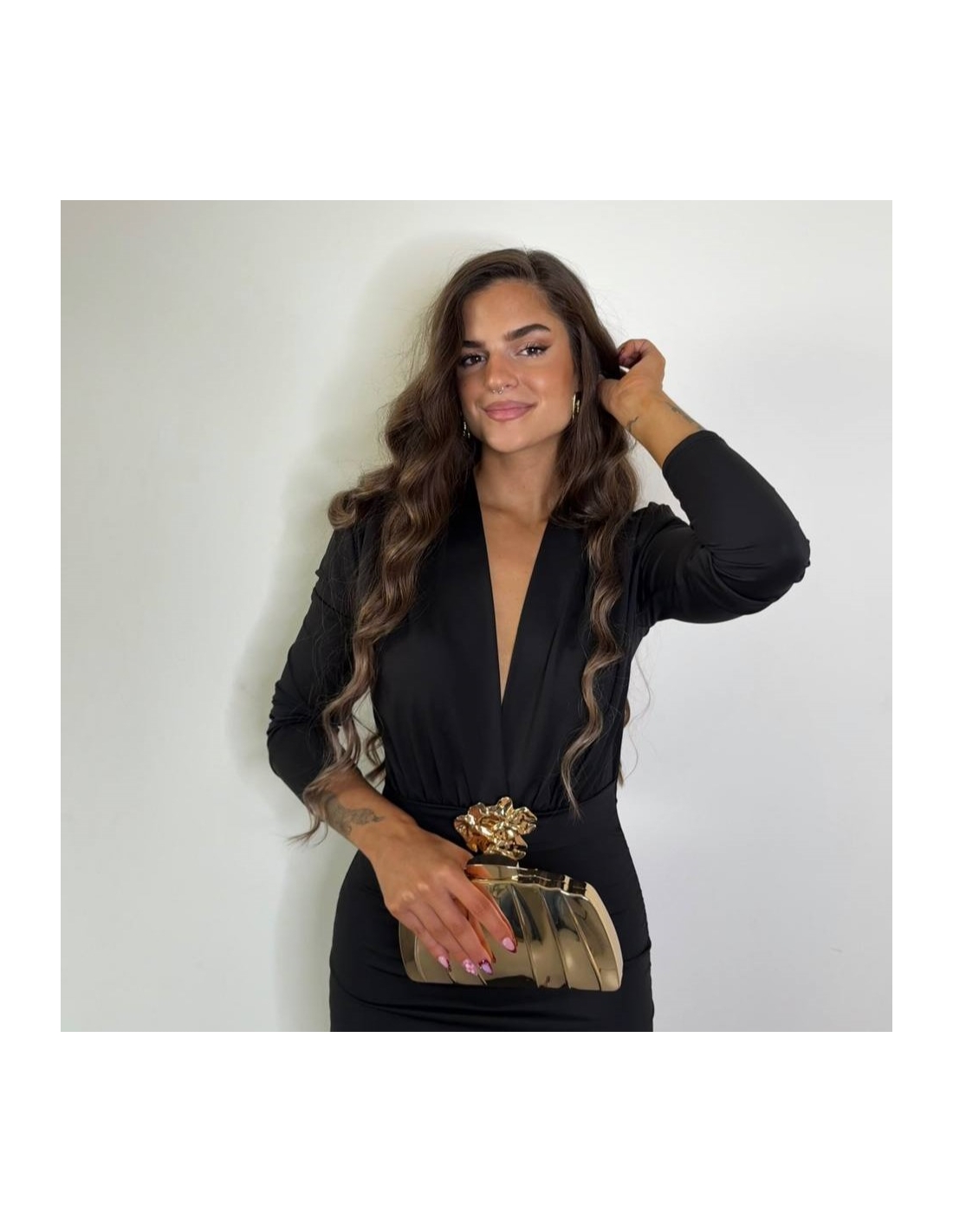 Vestido selene con detalle dorado delantero. Tejido doble licra grueso. Talla única.