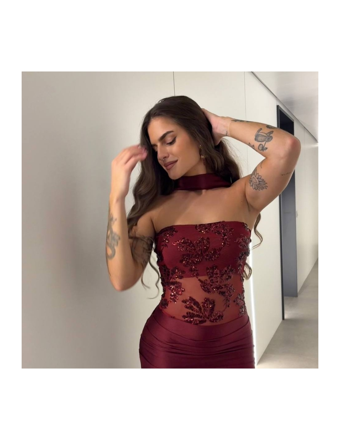 Vestido evento largo ajustado en tono vino. Corset con estampado lentejuelas a tono. Lazada a tono inluída. Talla única