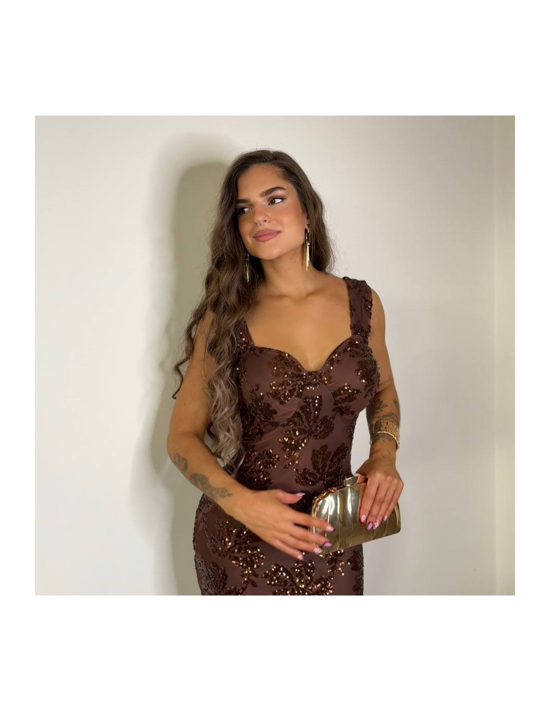 Vestido midi de lentejuelas en tono choco. Casco incorporado en el pecho. Con forro interior a tono. Escote de corazón. Tirantas a tono.