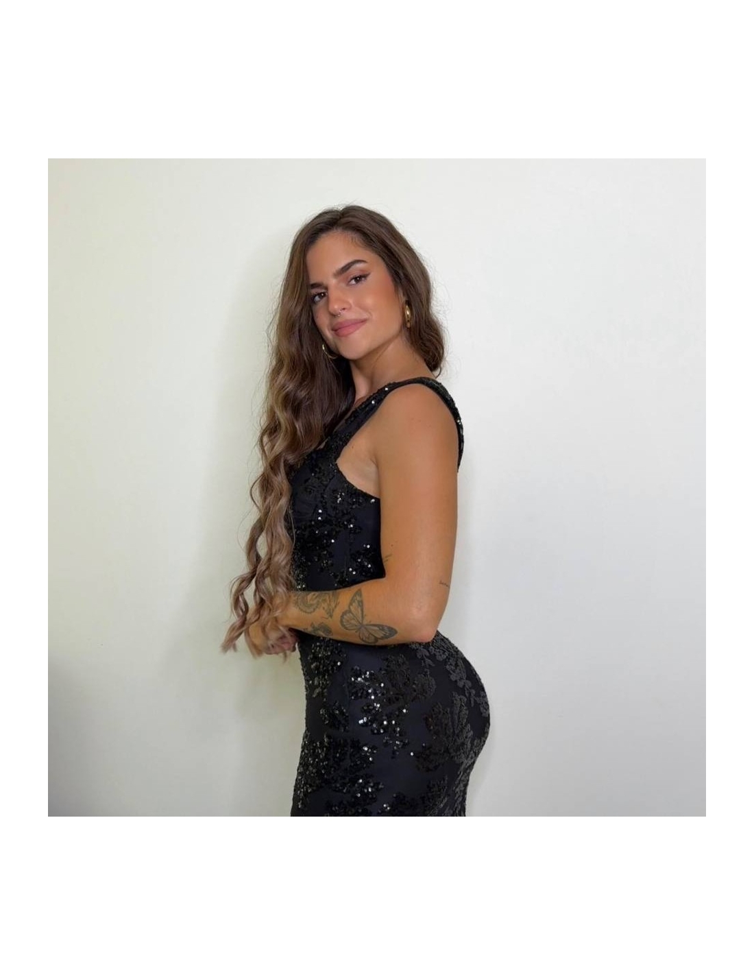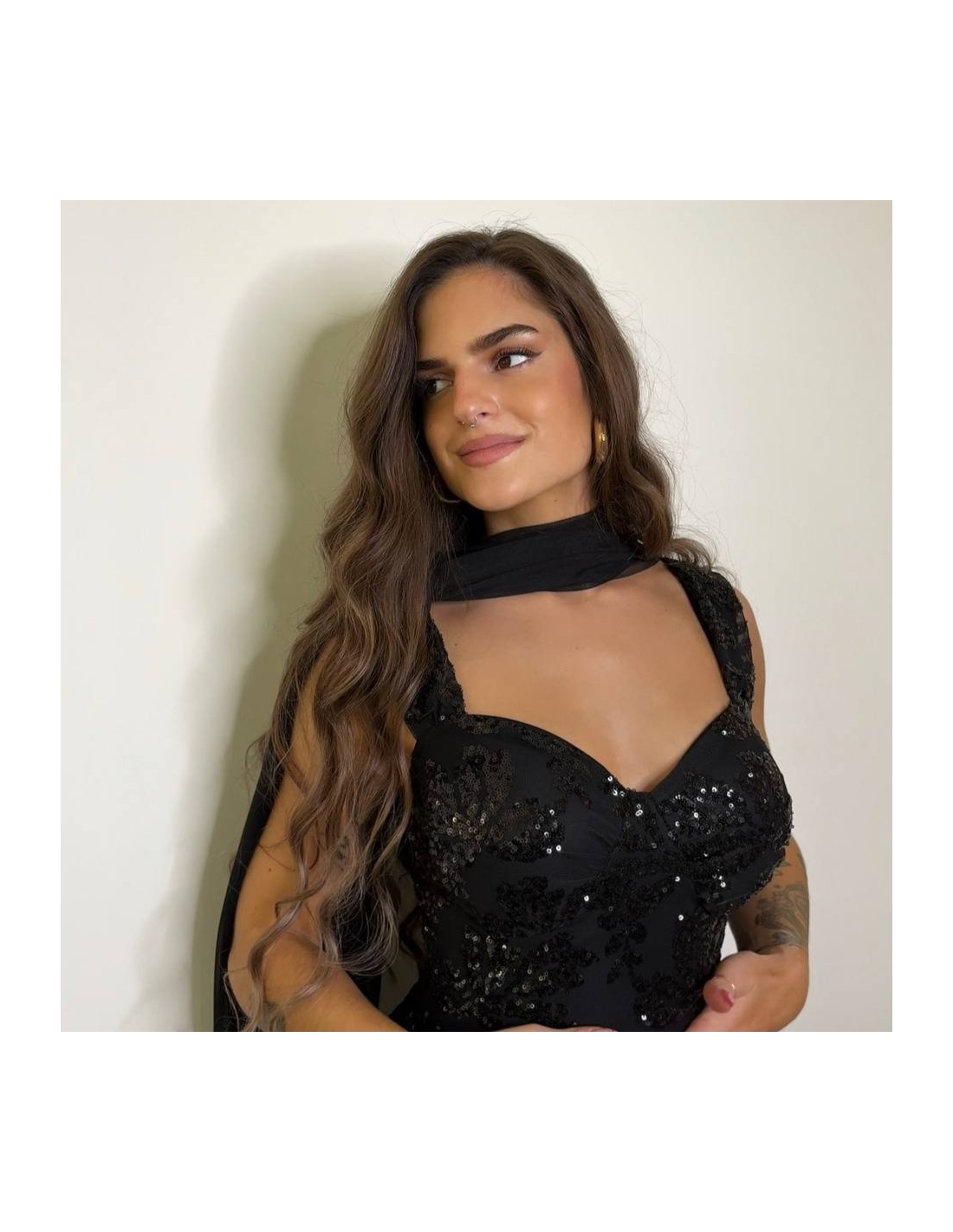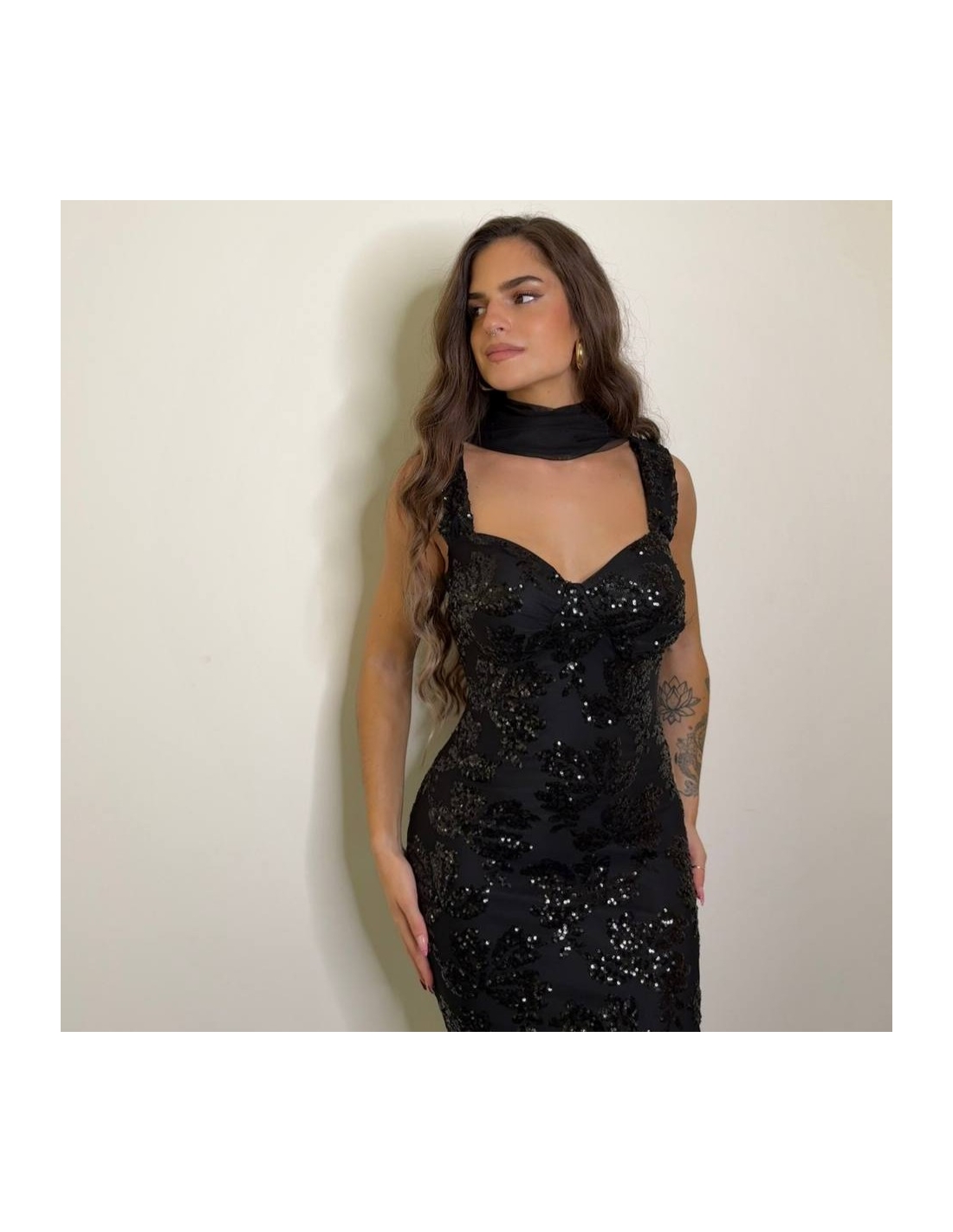 Vestido midi de lentejuelas en tono negro. Casco incorporado en el pecho. Con forro interior a tono. Escote de corazón. Tirantas a tono. Talla única