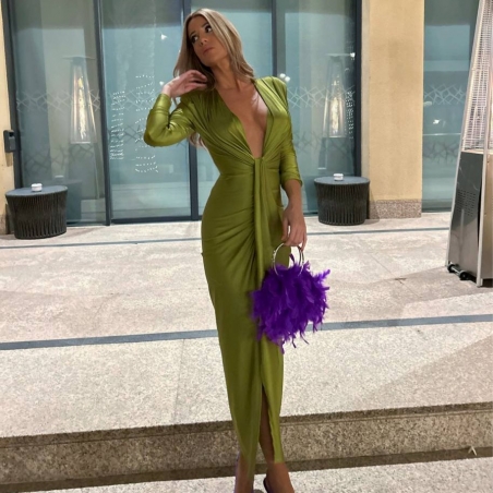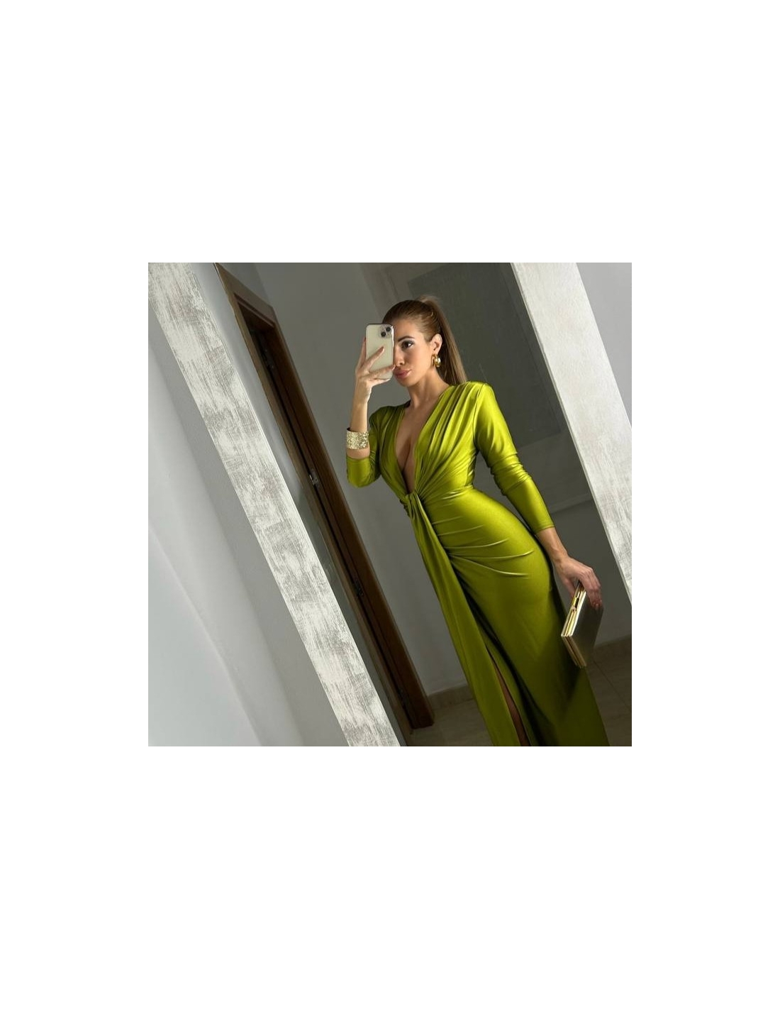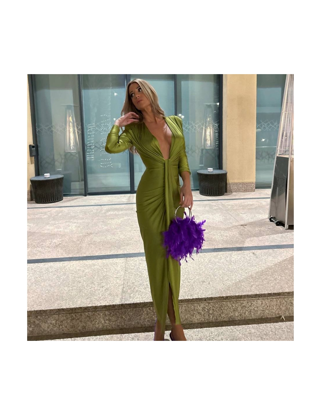 Vestido evento nudo con manga larga. Nudo en parte delantera y abertura. Midi. Fruncido. Talla única