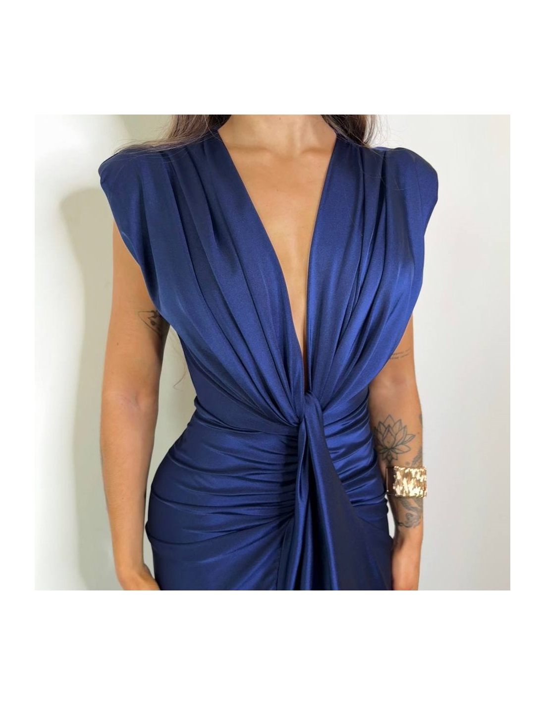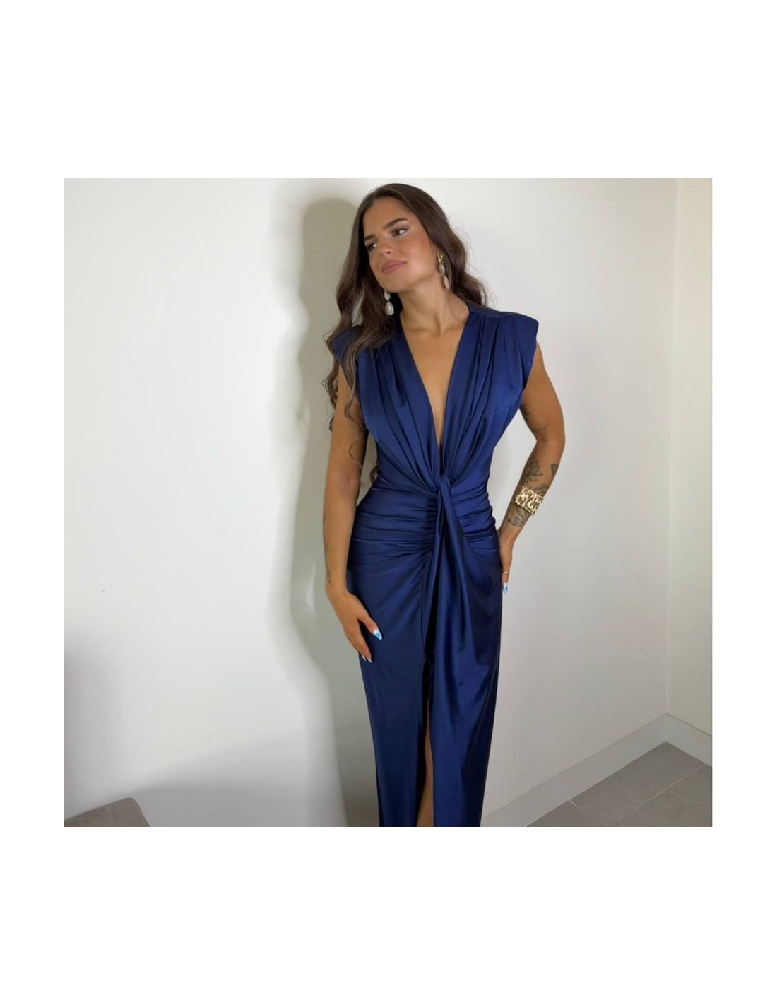 Vestido evento nudo. Con hombreras. Nudo en parte delantera y abertura. Midi. Fruncido. Talla única