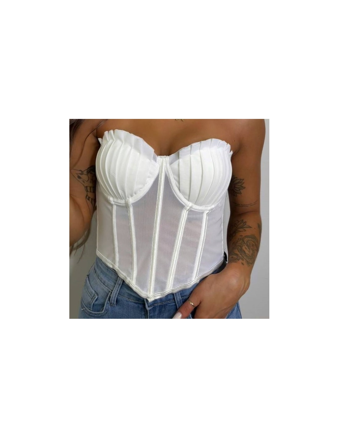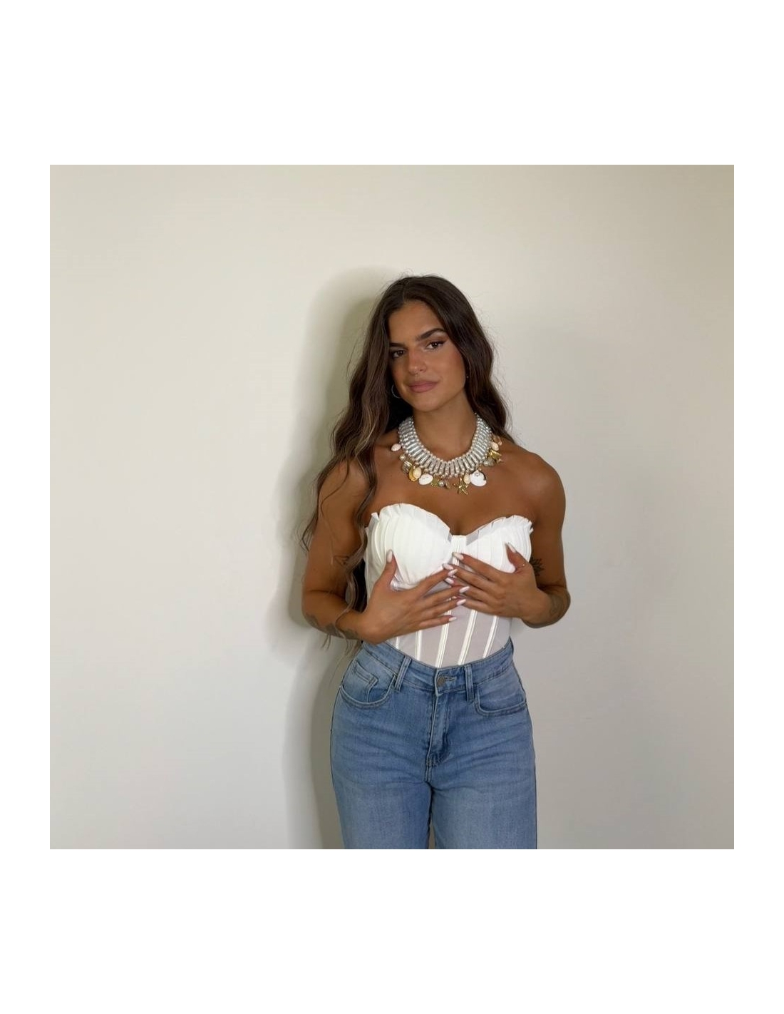 Coset varillas en tono blanco. Casco incorporado. Regulable con corchetes en parte trasera. Posibilidad de usar con tirantas regulables a tono.
