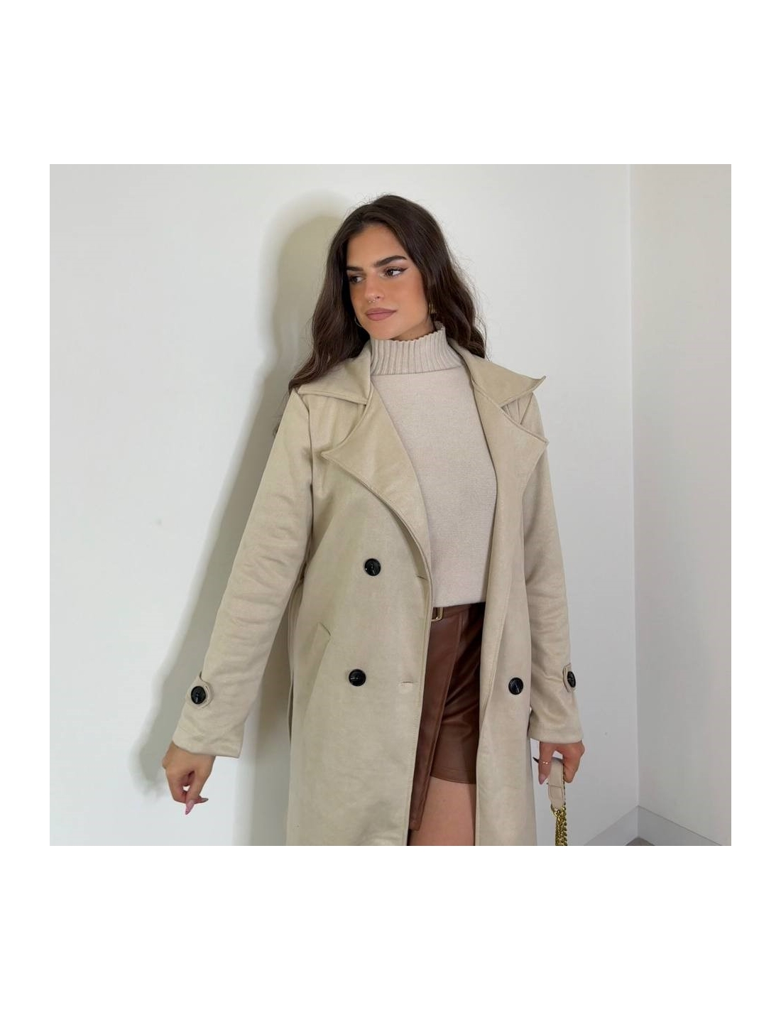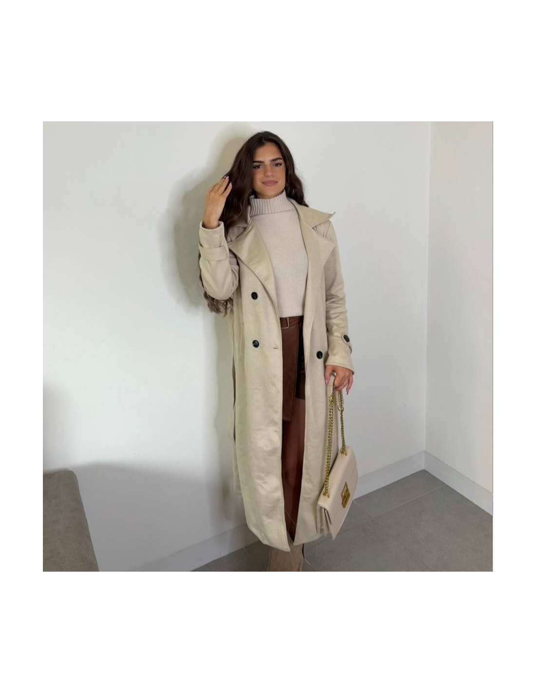 Abrigo largo en tono crema con cinturón a tono. Cuello de solapa. De manga larga. Talla única