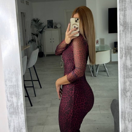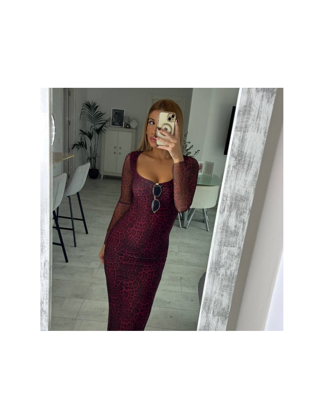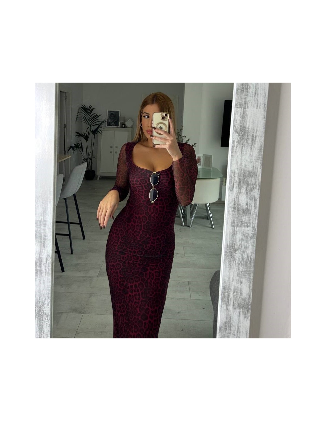 Vestido ajustado tul largo con estampado animal print en tono vino. Mangas con transparencias. Escote redondo. Talla única