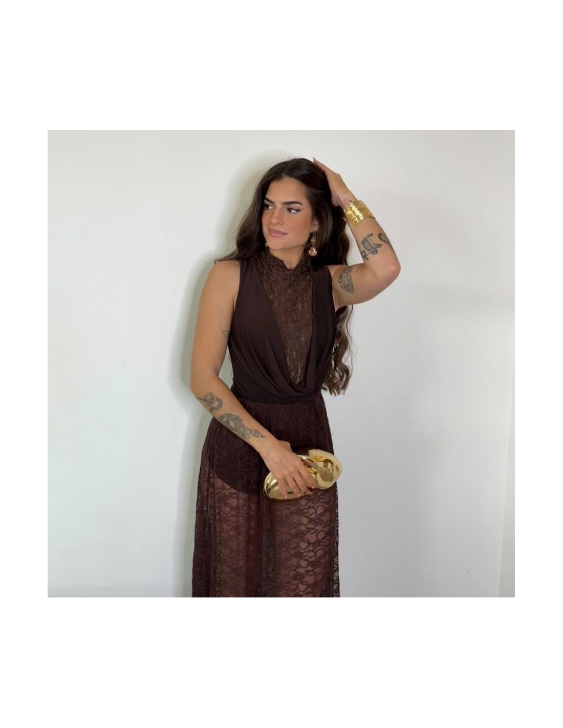 Falda midi encaje en tono choco. Cintura elástico. Braguita interior a tono incluida. Talla única