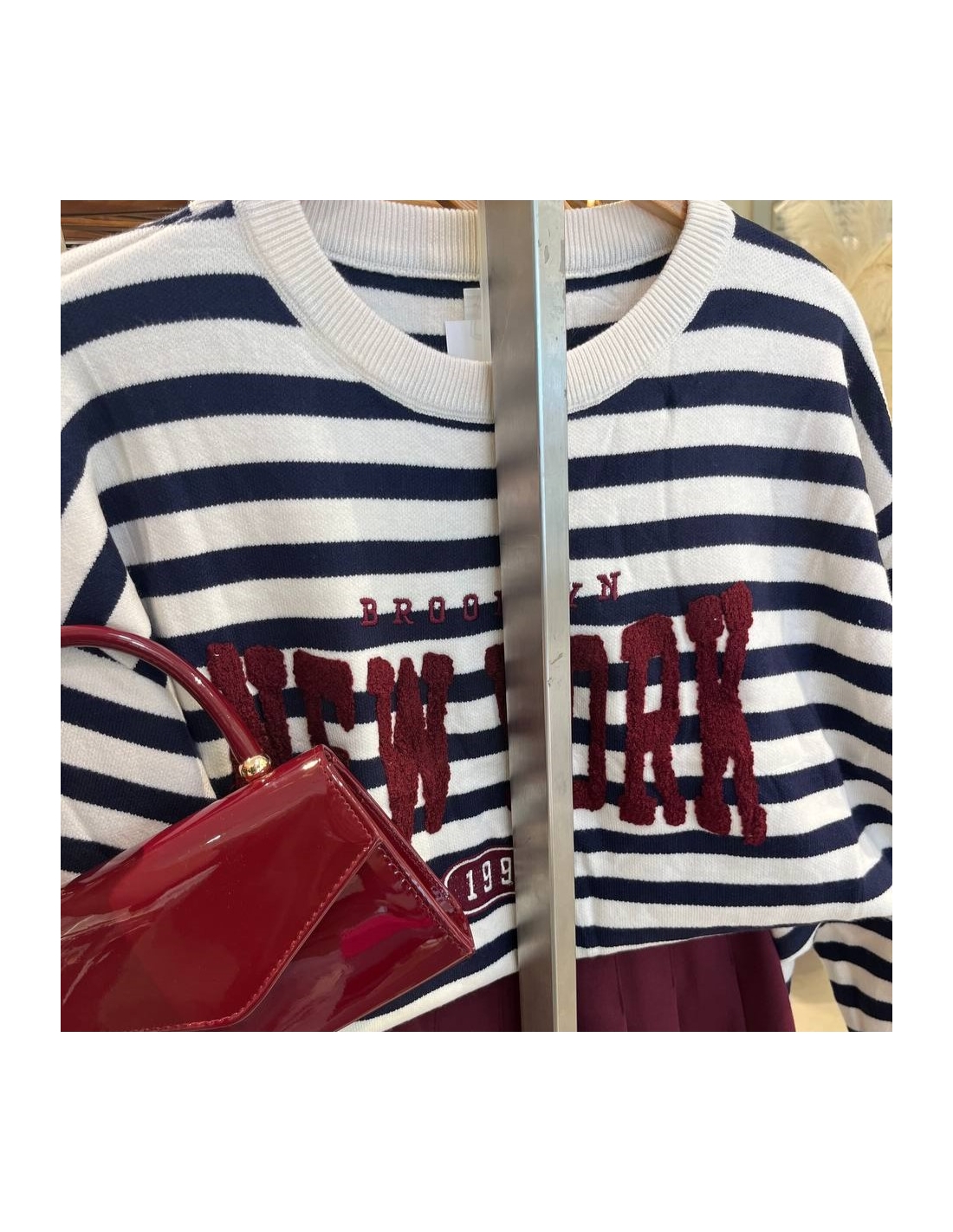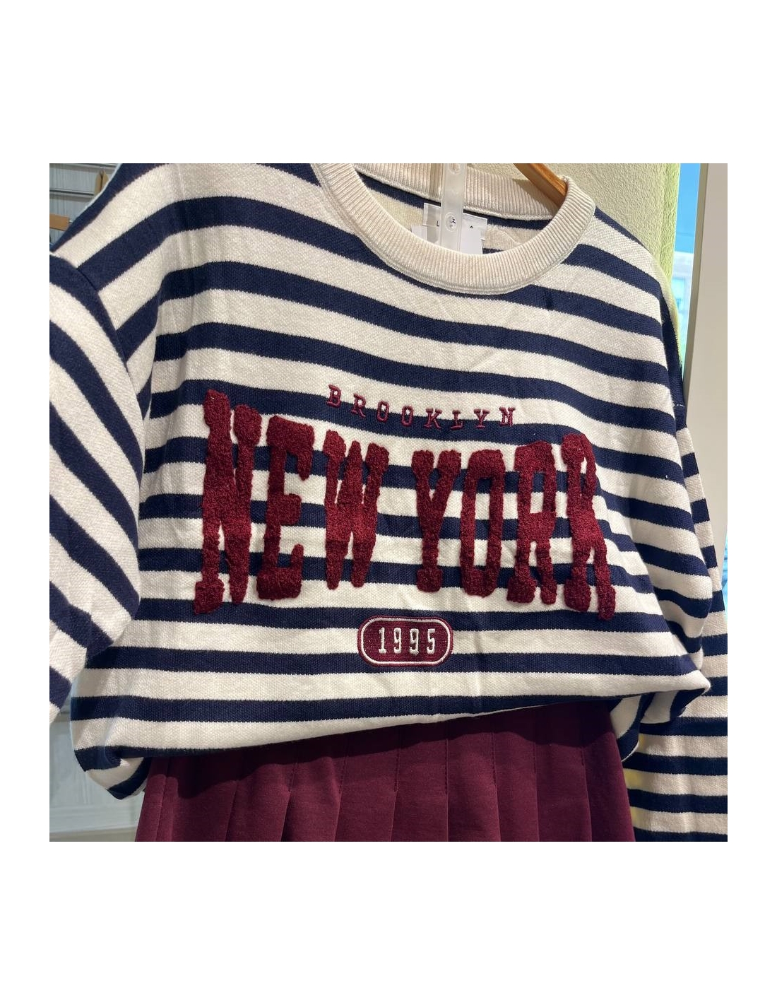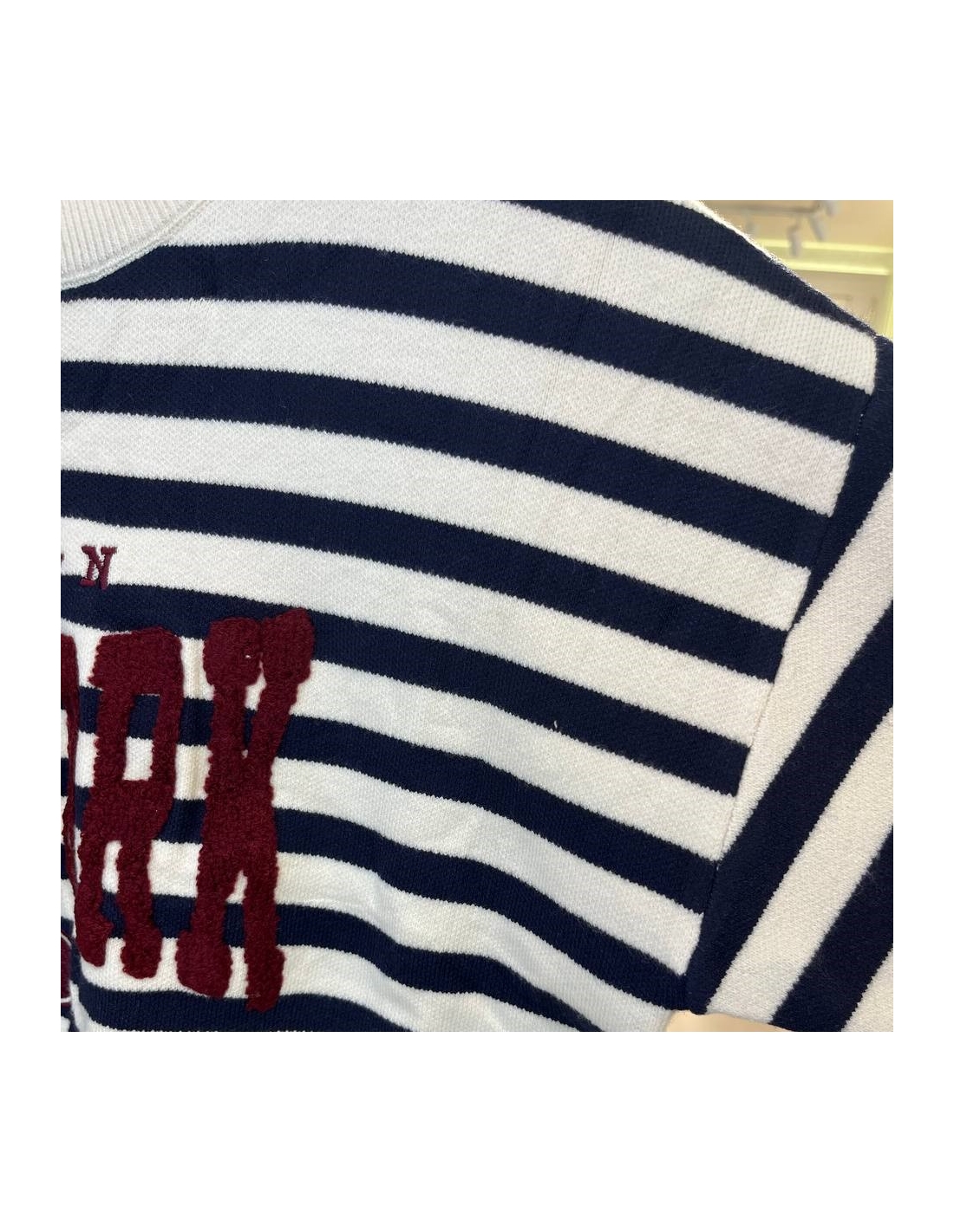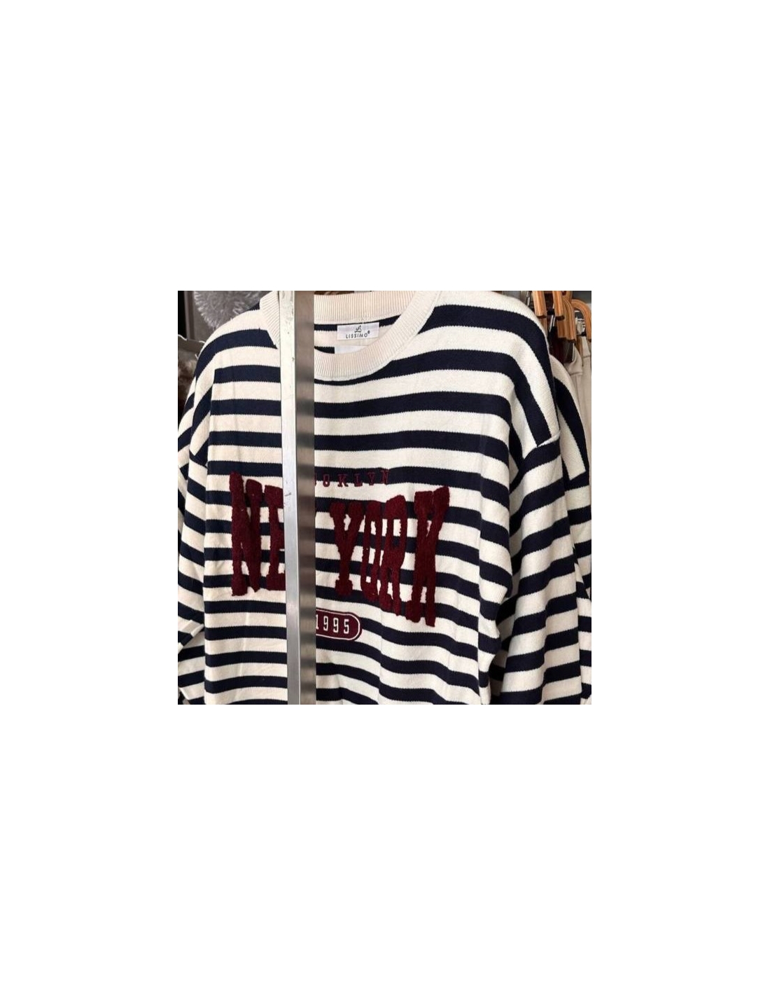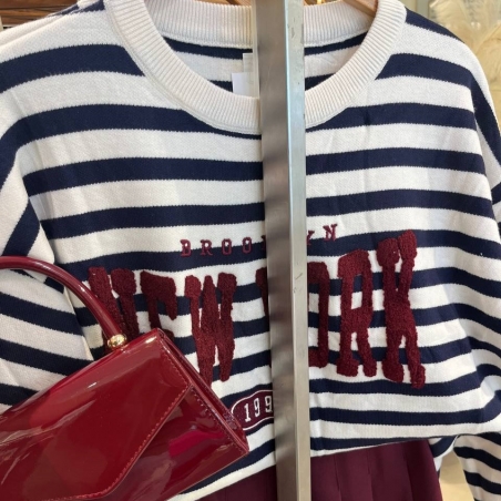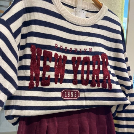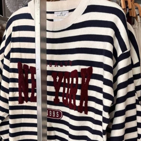 Jersey de cuello redondo rayas en tono beige y marino. Talla única.