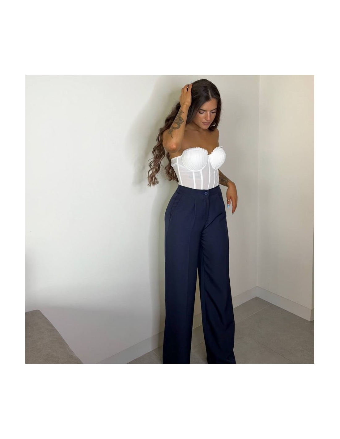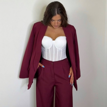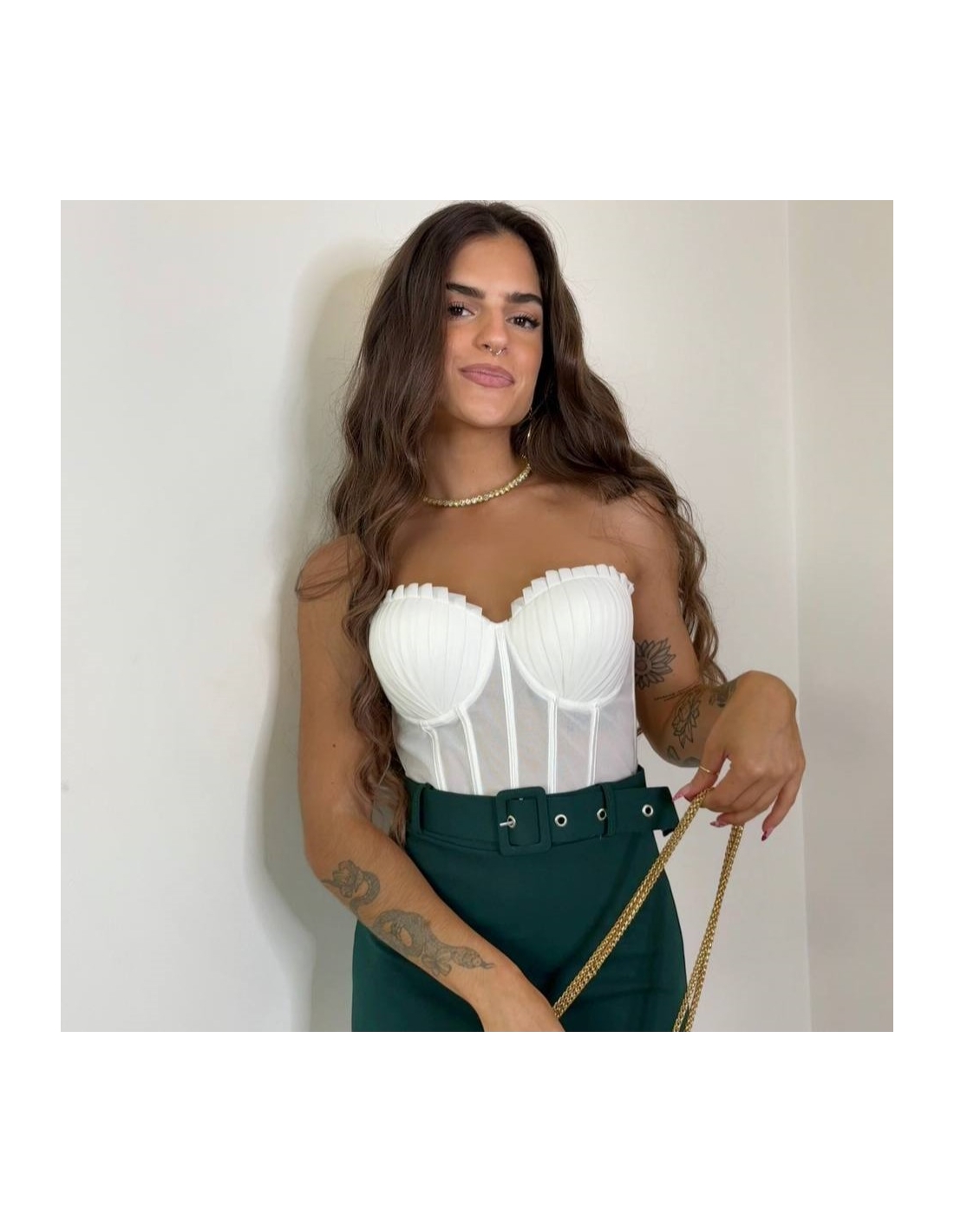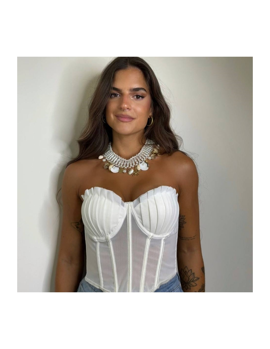 Coset varillas en tono blanco. Casco incorporado. Regulable con corchetes en parte trasera. Posibilidad de usar con tirantas regulables a tono.