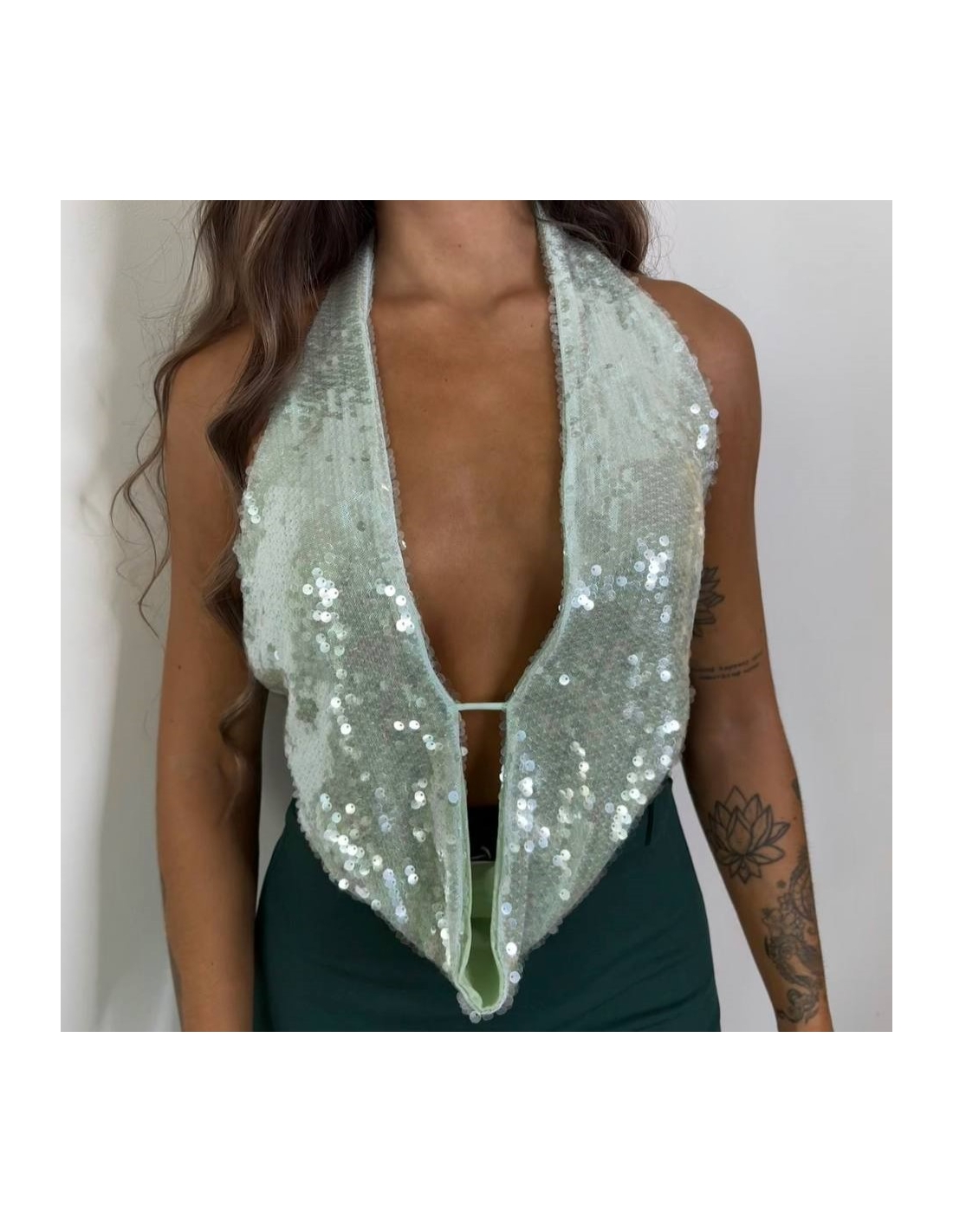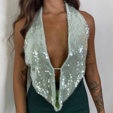Top lentejuelas en tono verde. Escote fluido. Regulable con lazada a tono en espalda. Con forro interior a tono. Talla única