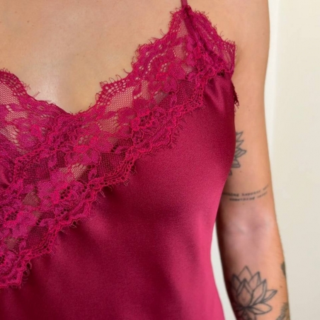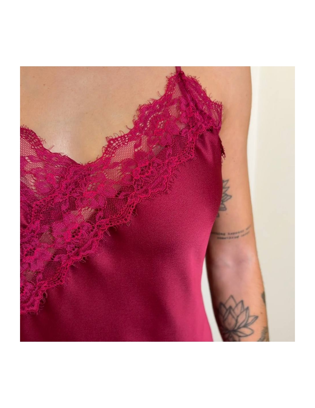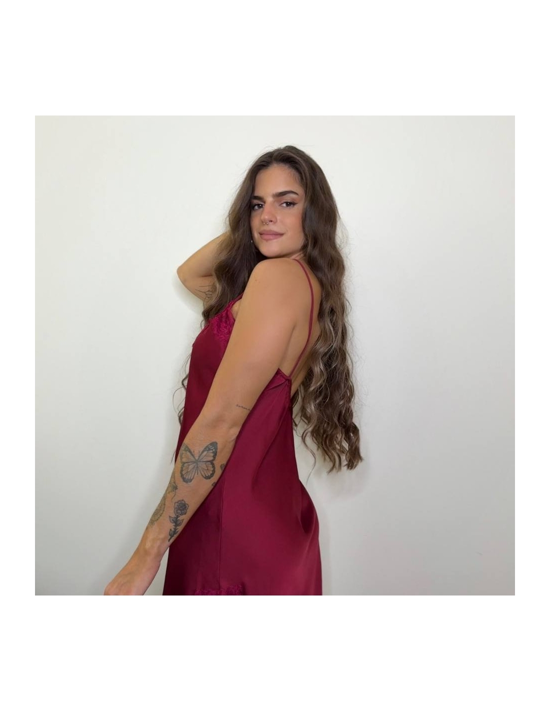Vestido lencero midi. Tirantas finas a tono. Escote V con detalle encaje. Fluido. Talla única