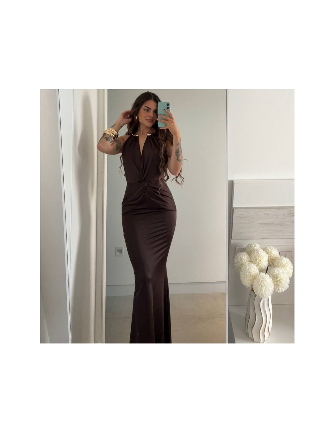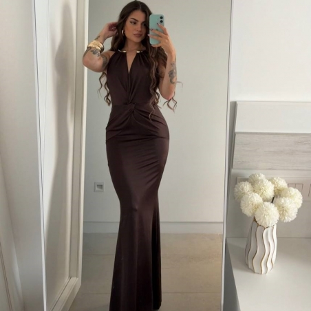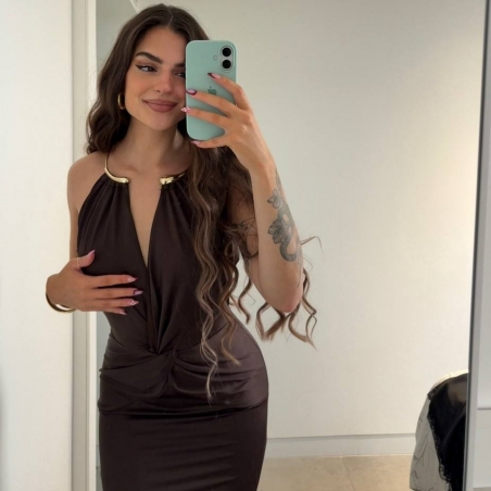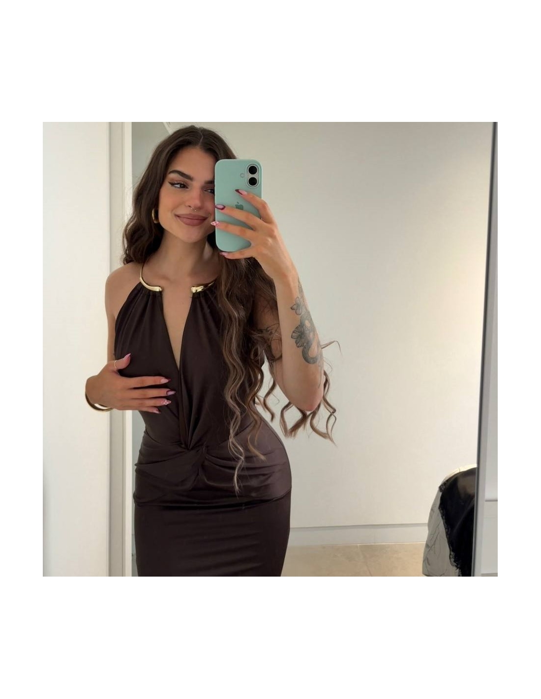 Vestido gargantilla aro dorado de escote fluído y tejido acabado satinado. Nudo fruncido central.  Talla única.