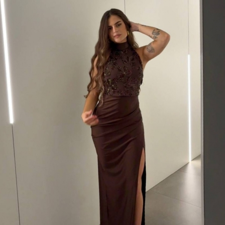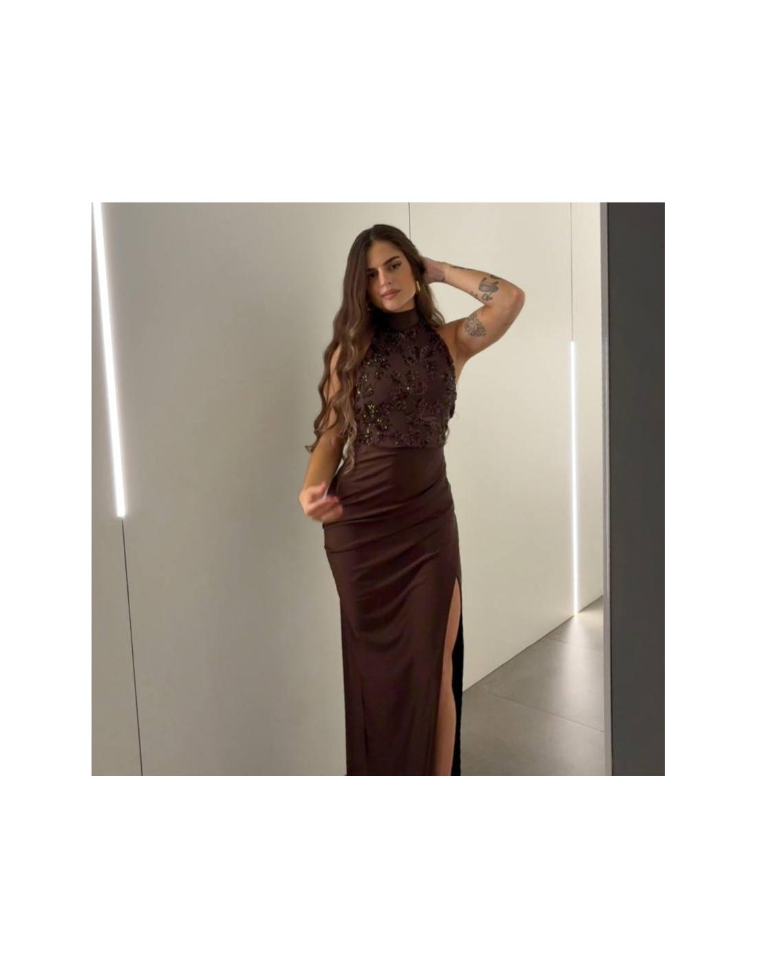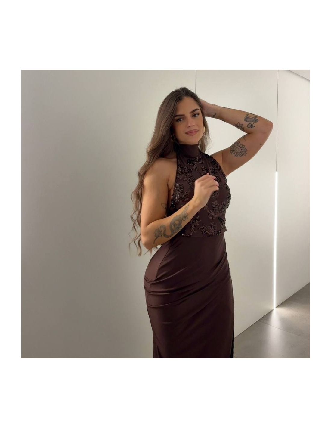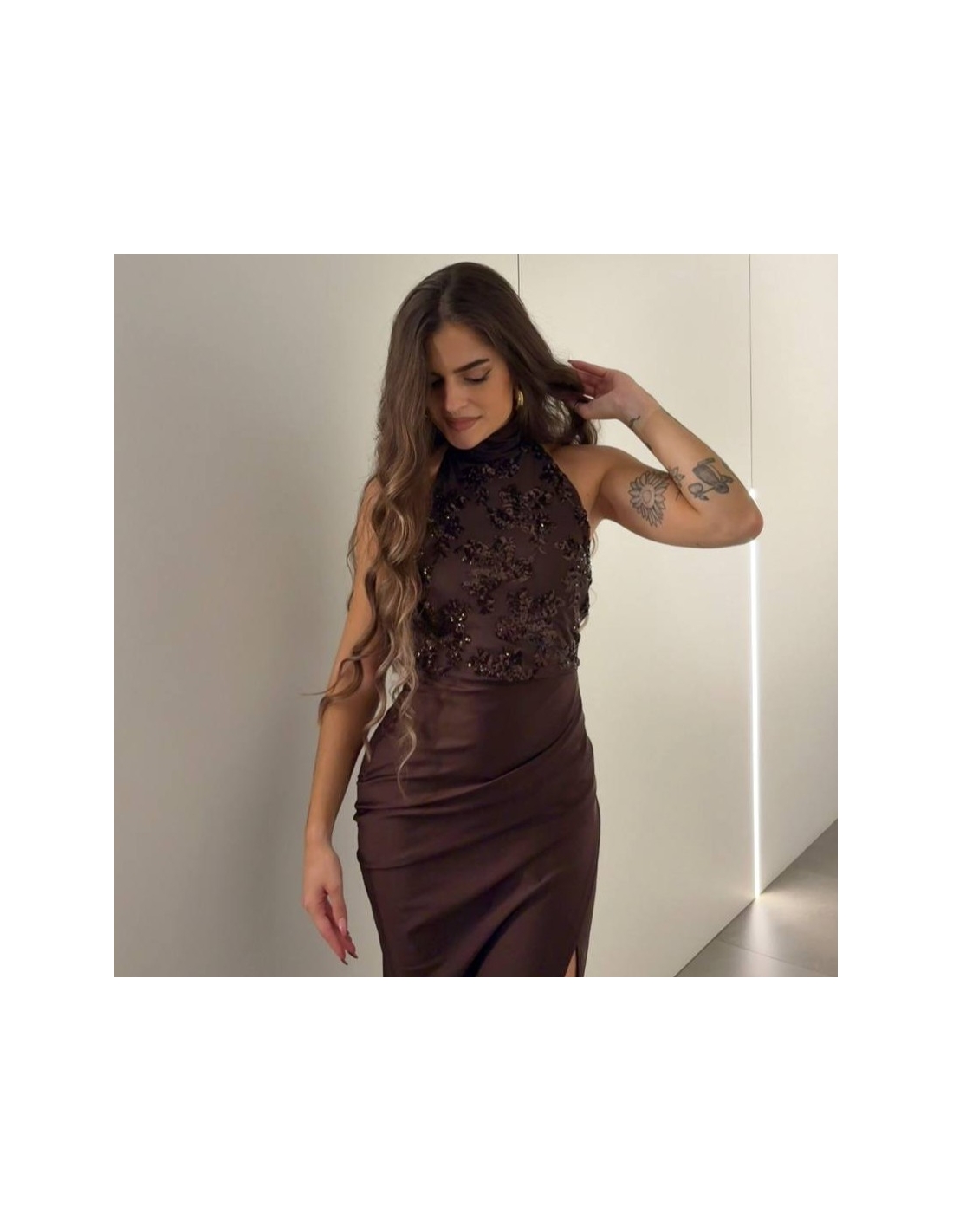Vestido halter lentejuelas en tono marrón chocolate. Tejido acabado satinado. Regulable con lazada al cuello. Escote en espalda. Talla única