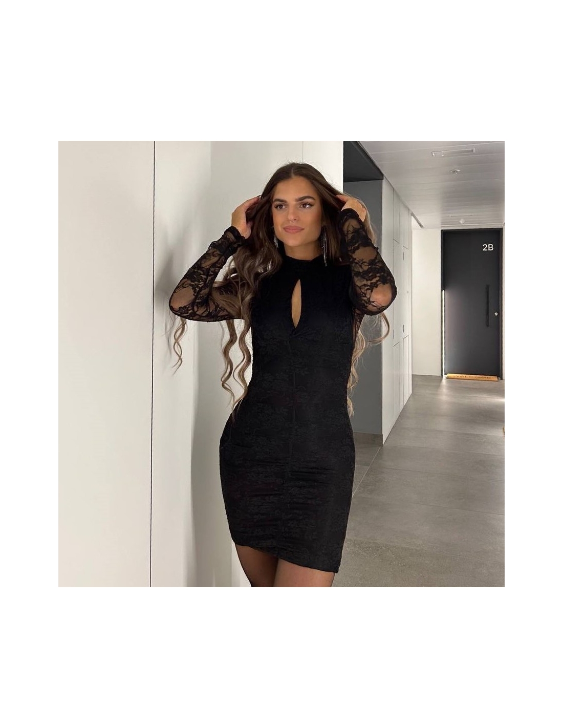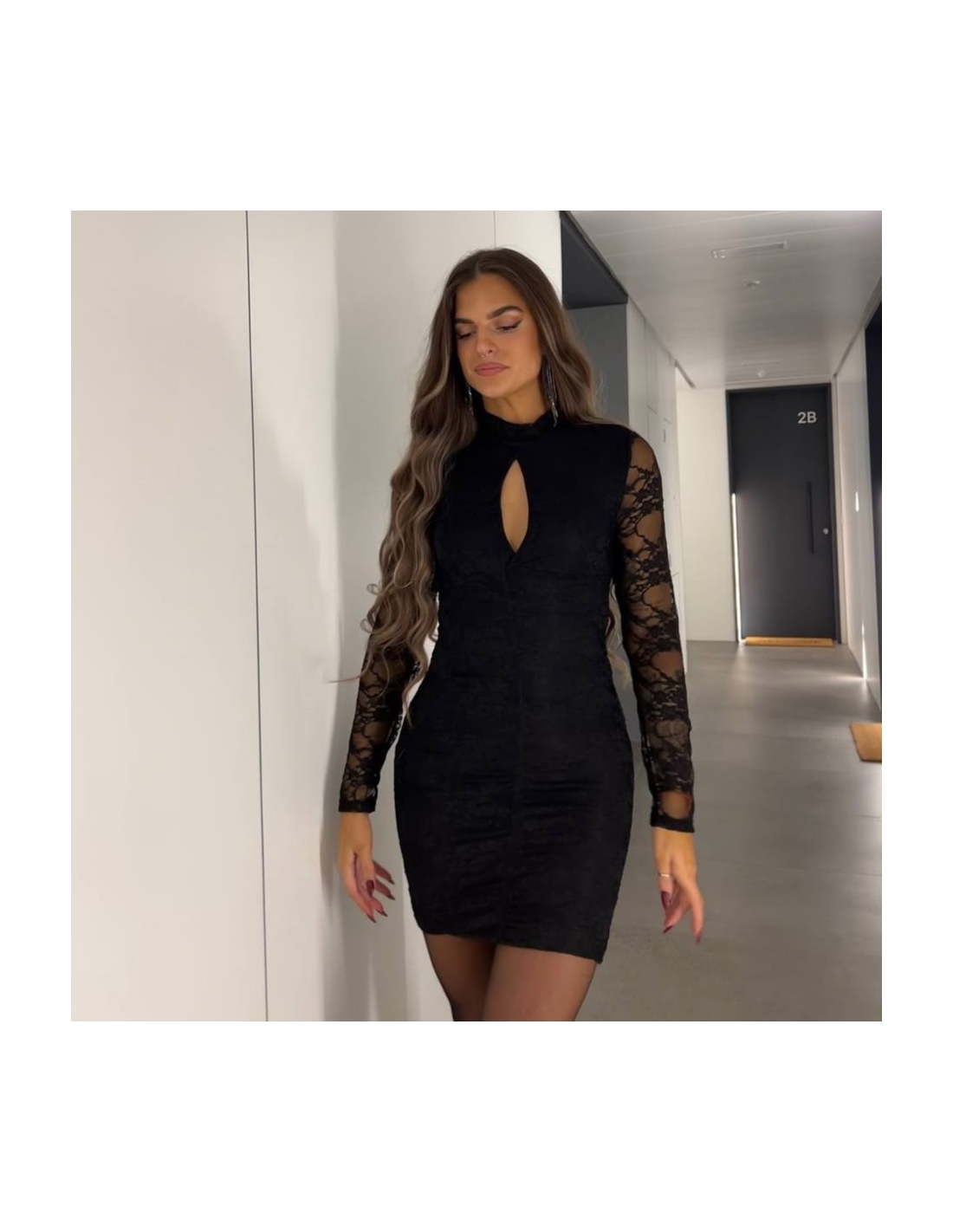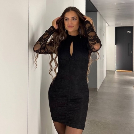 Vestido corto encaje en tono negro. Abertura en escote. Con forro interior a tono. Fruncido. Talla única
