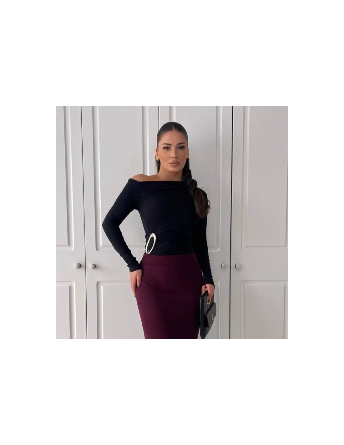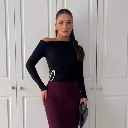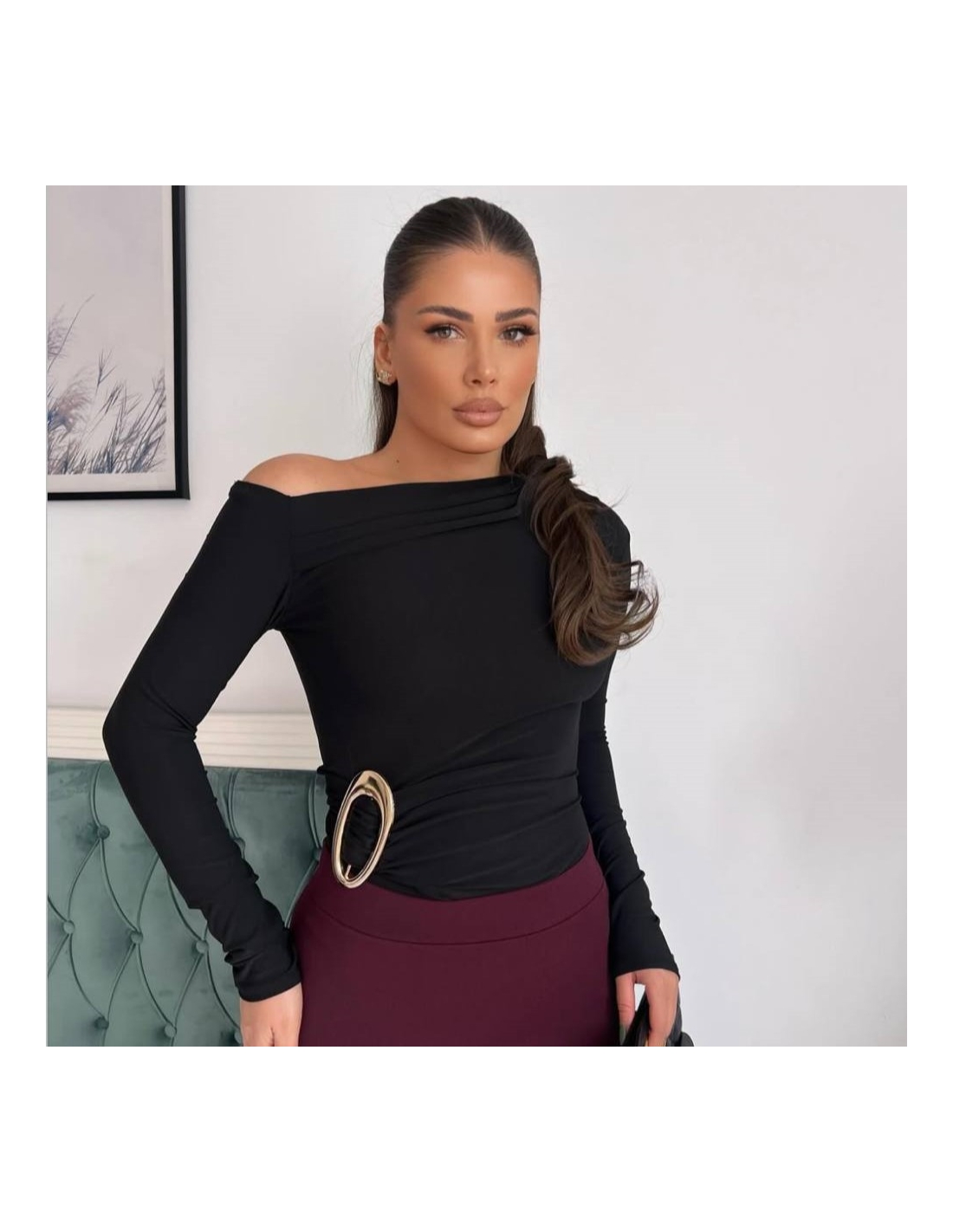 Top fruncido ajustado con accesorio dorado. De manga larga. Corte asimétrico en escote. Talla única