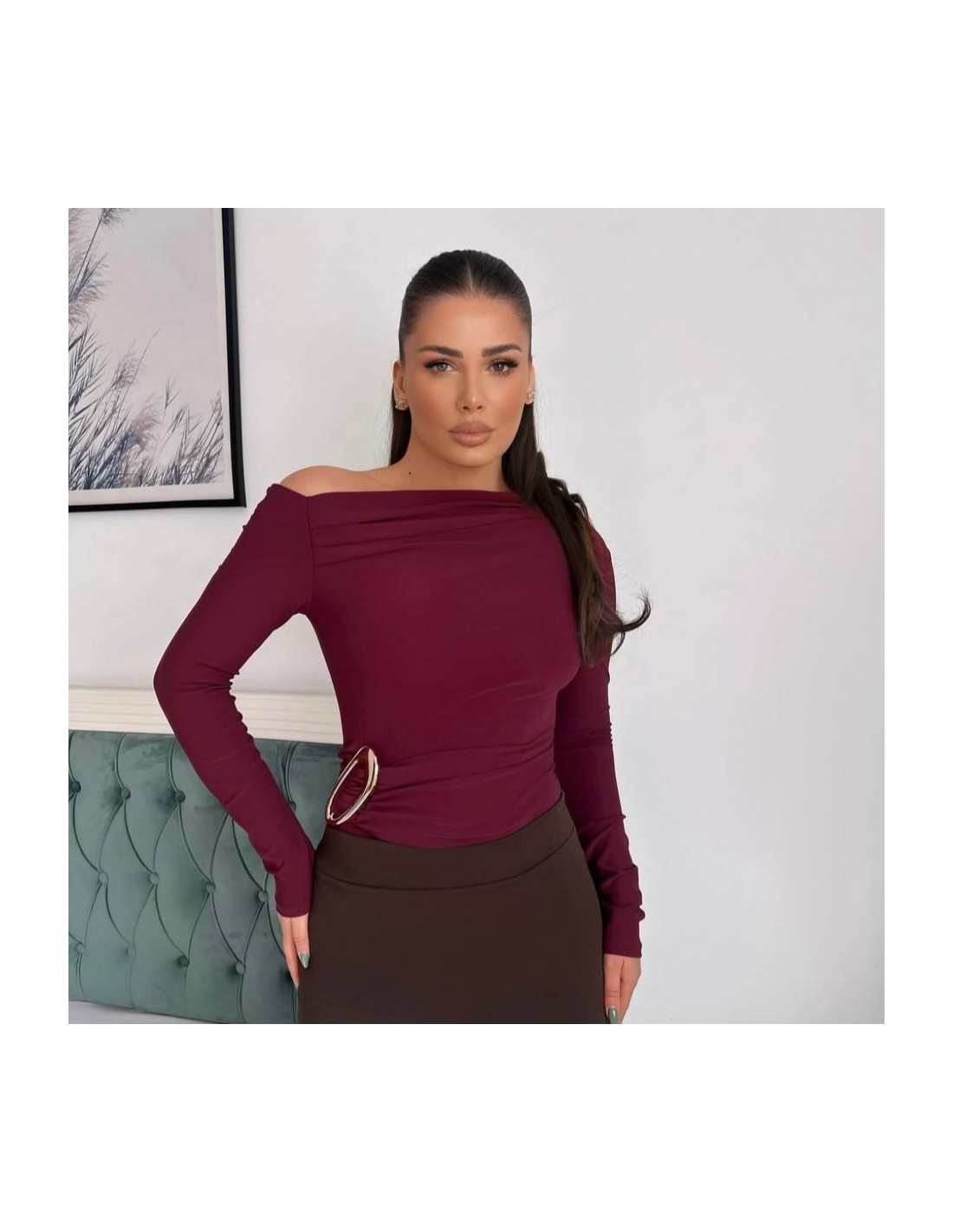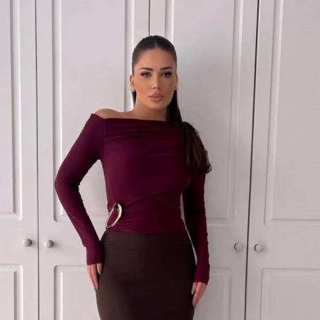 Top fruncido ajustado con accesorio dorado. De manga larga. Corte asimétrico en escote. Talla única