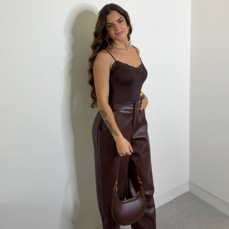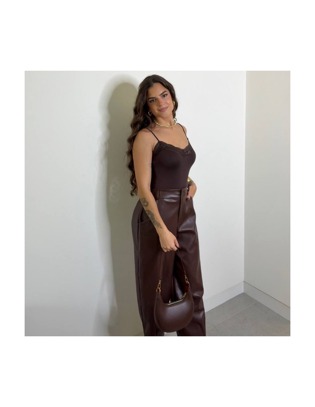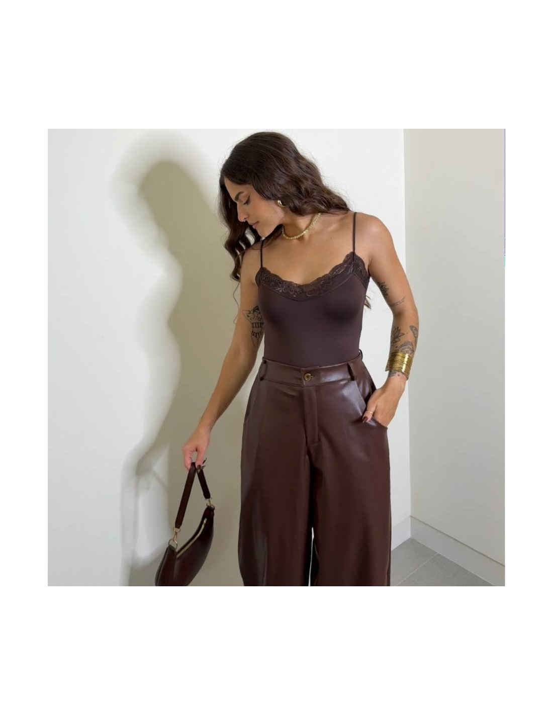 Body de tiranta fina elástica. Tejido de licra y borde escote de encaje. Talla única.