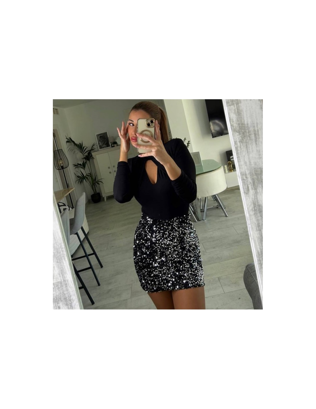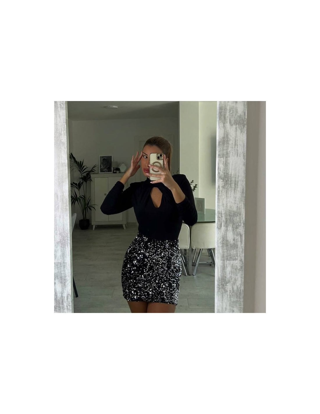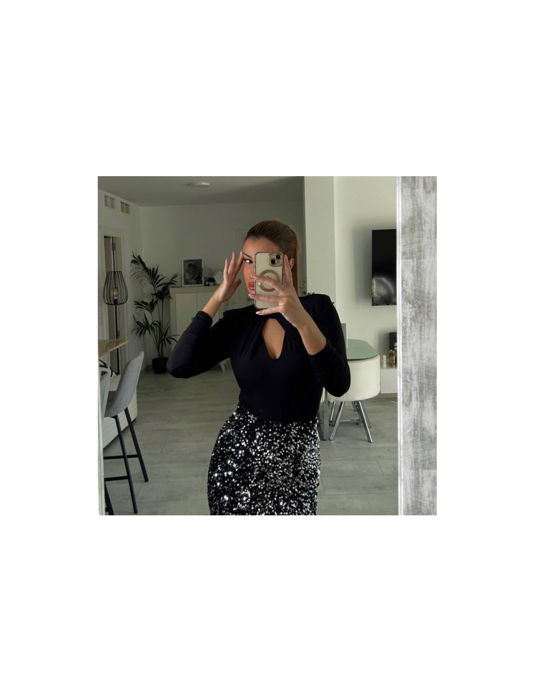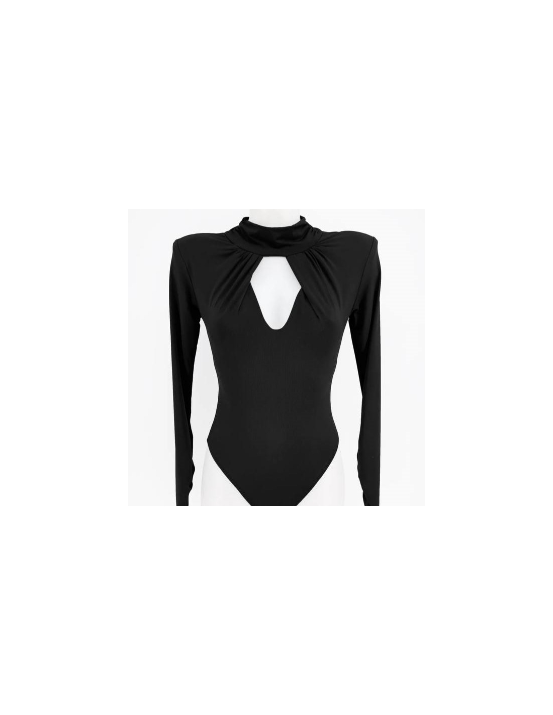 Body ajustado negro con abertura delantera en escote. De manga larga. Regulable con lazada trasera. Elástico. Talla única