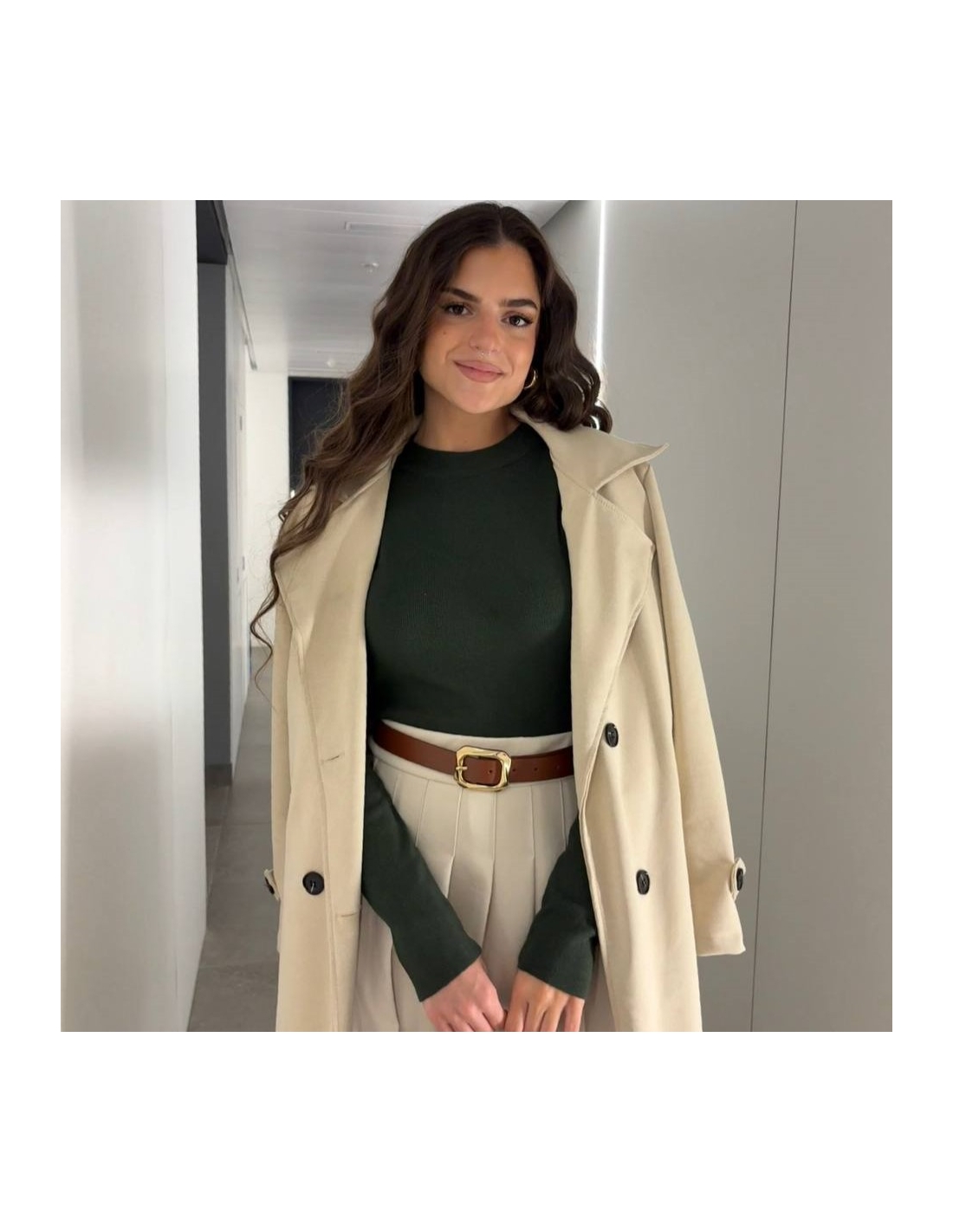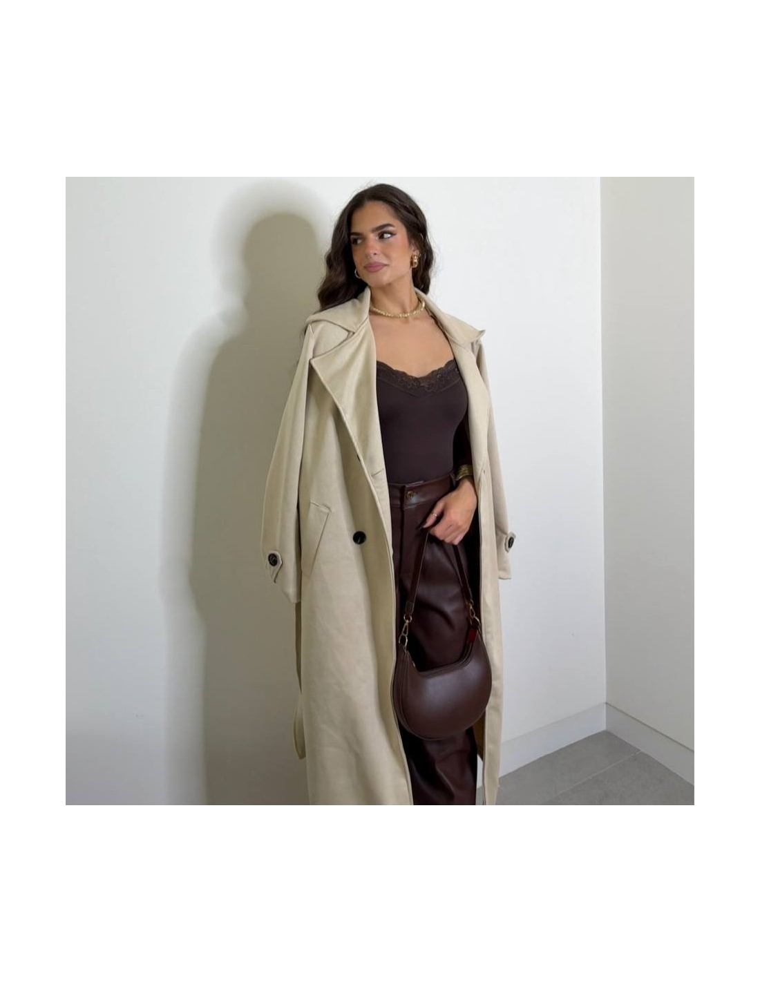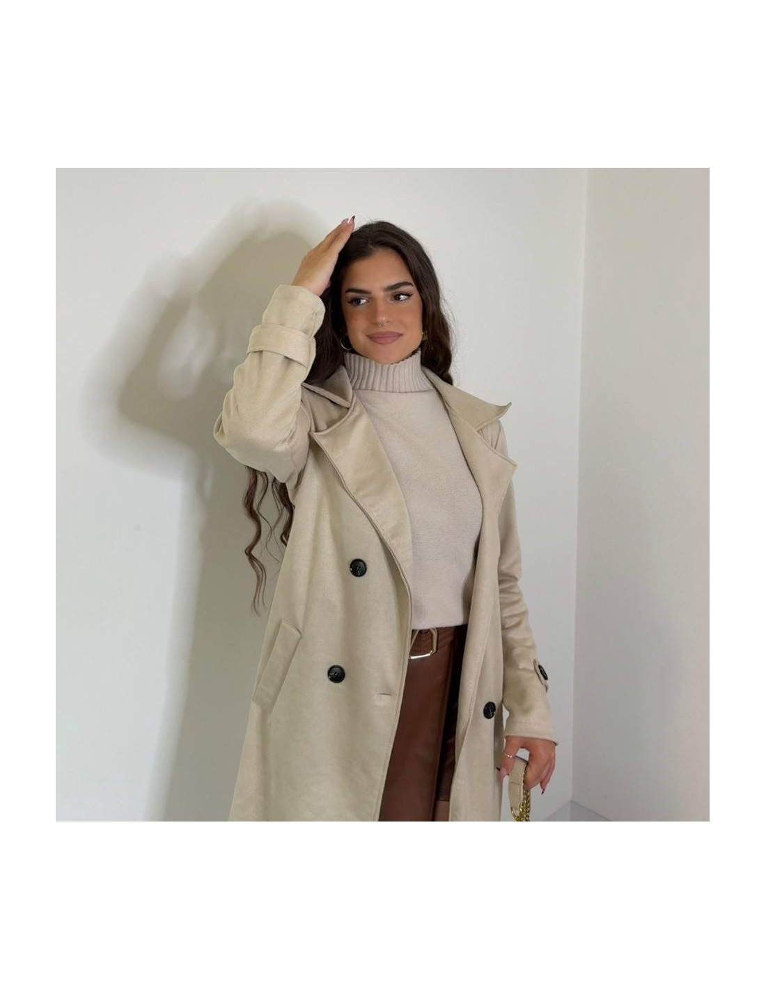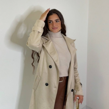 Abrigo largo en tono crema con cinturón a tono. Cuello de solapa. De manga larga. Talla única