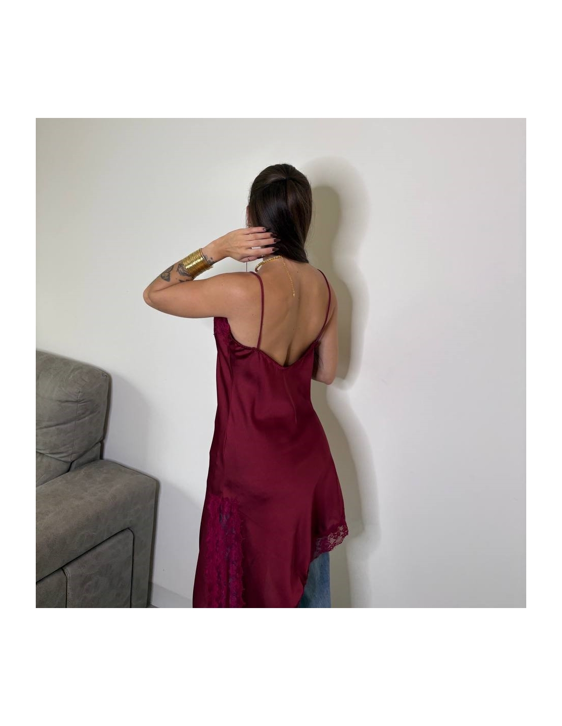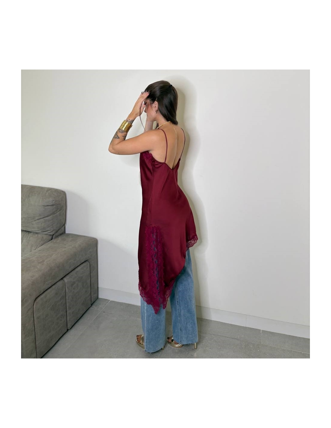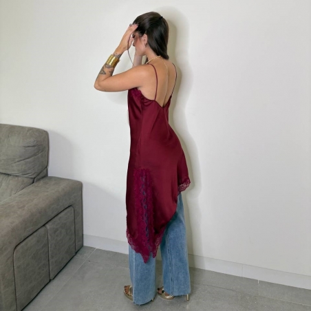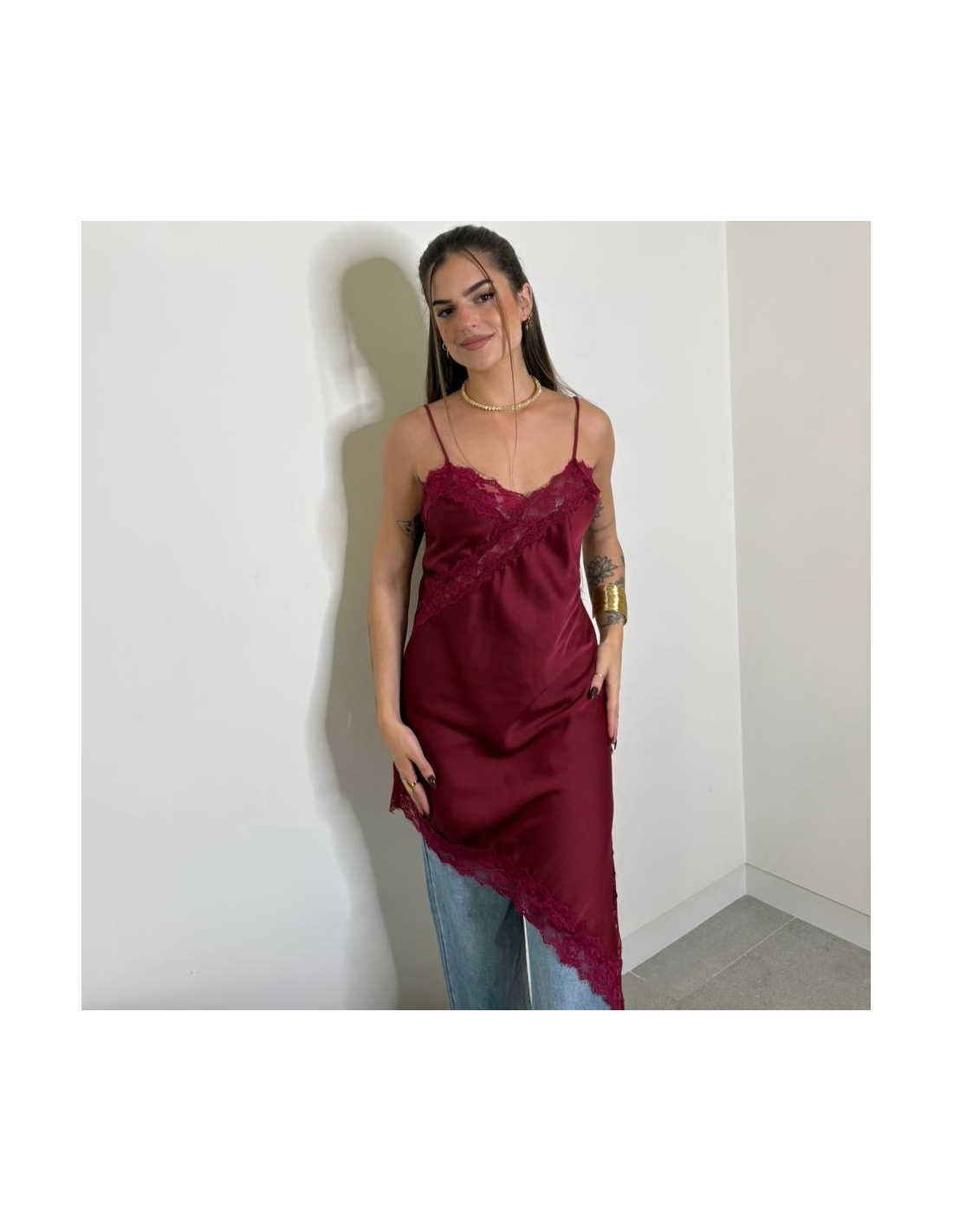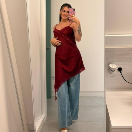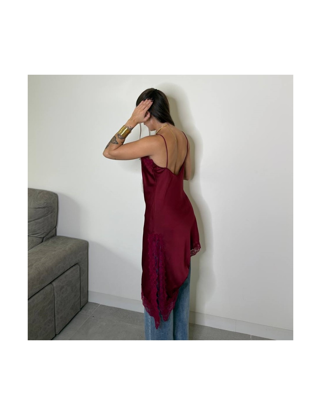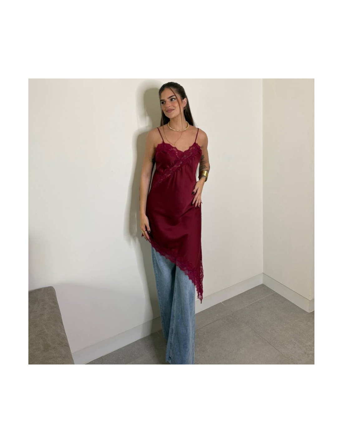 Vestido lencero midi. Tirantas finas a tono. Escote V con detalle encaje. Fluido. Talla única