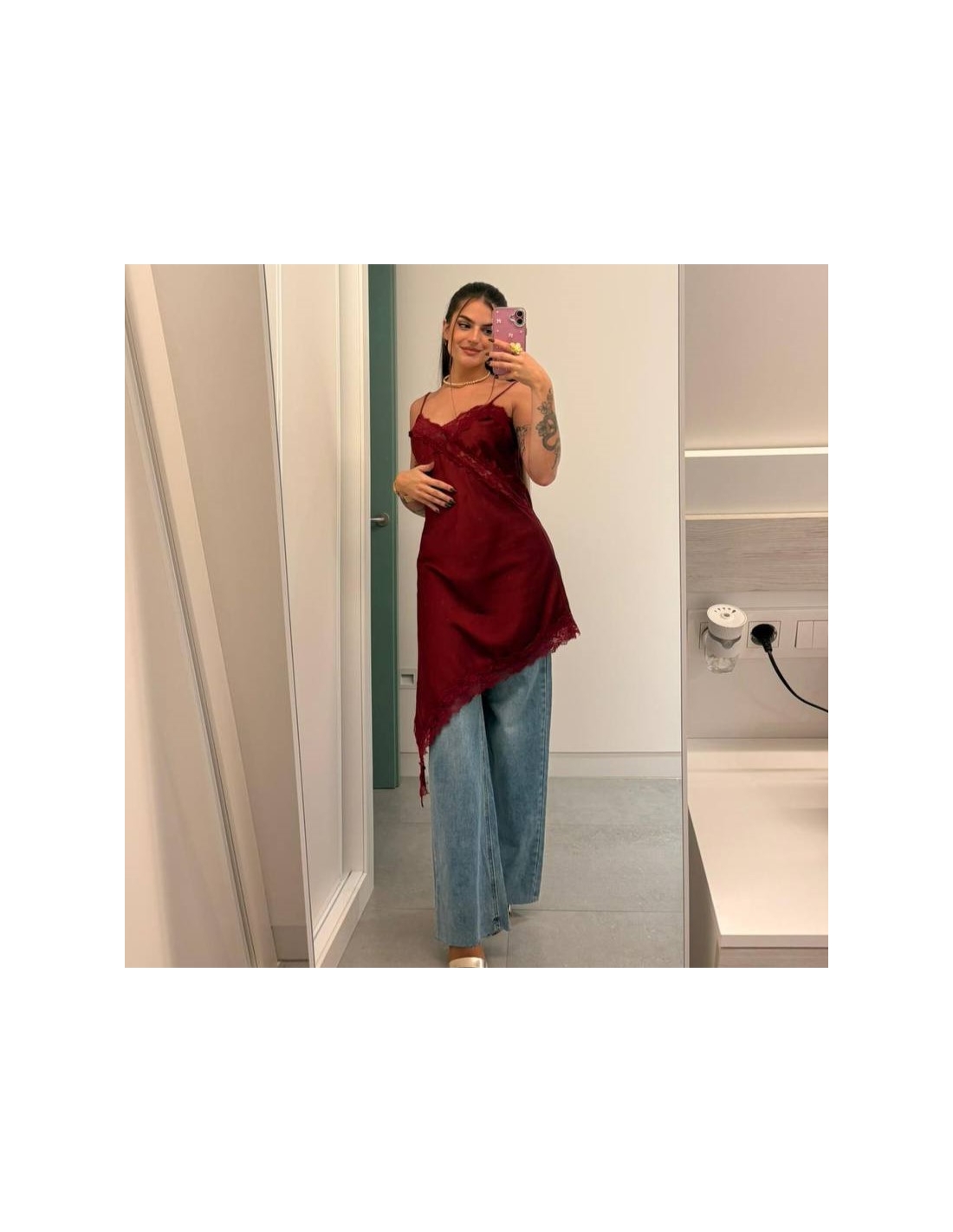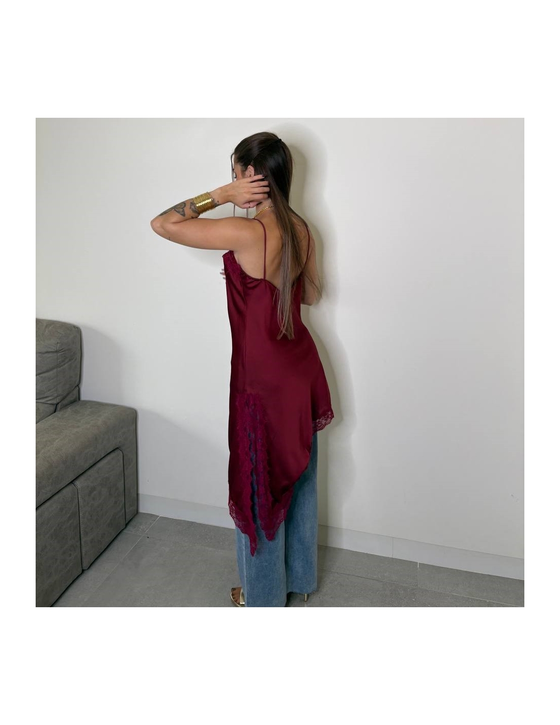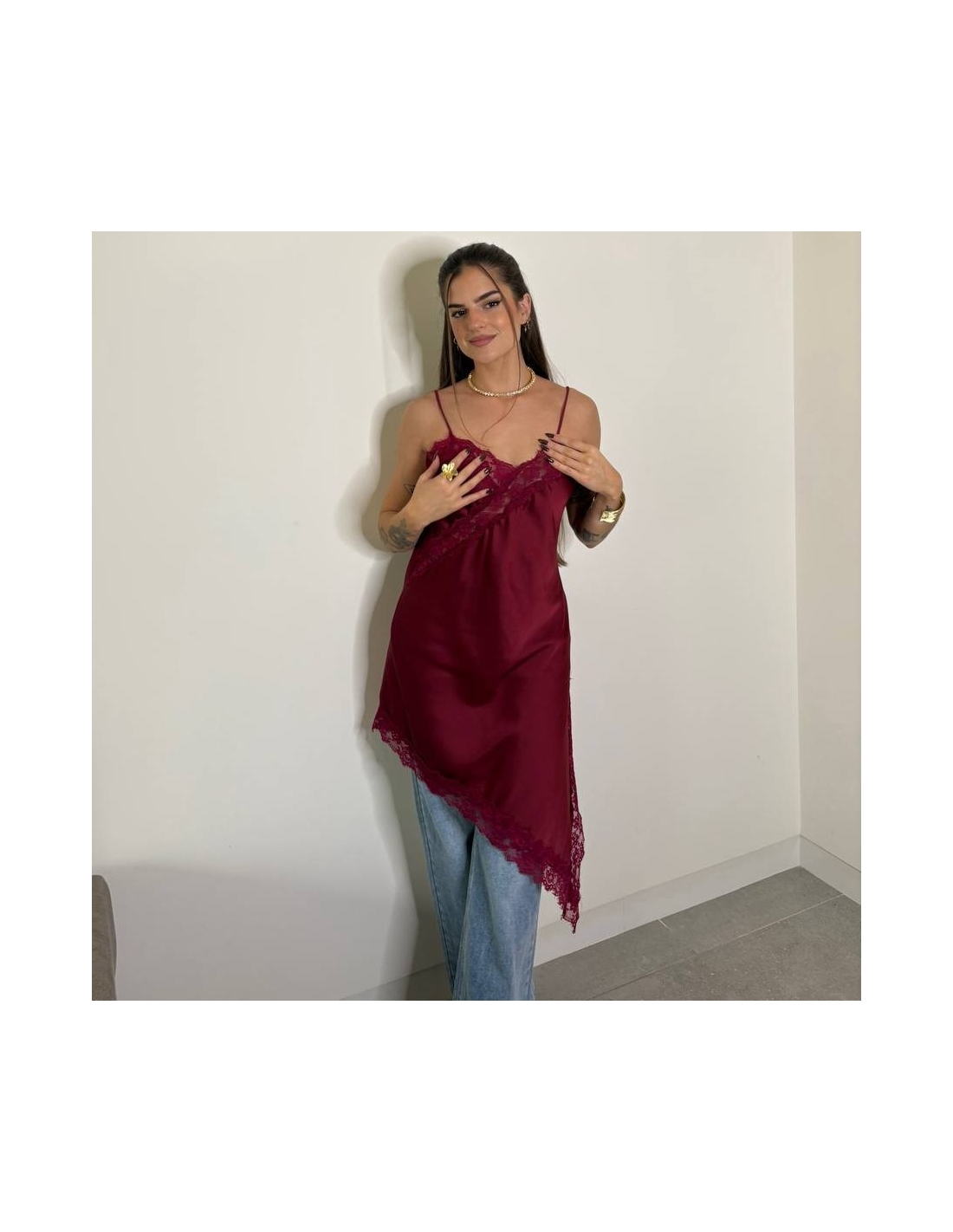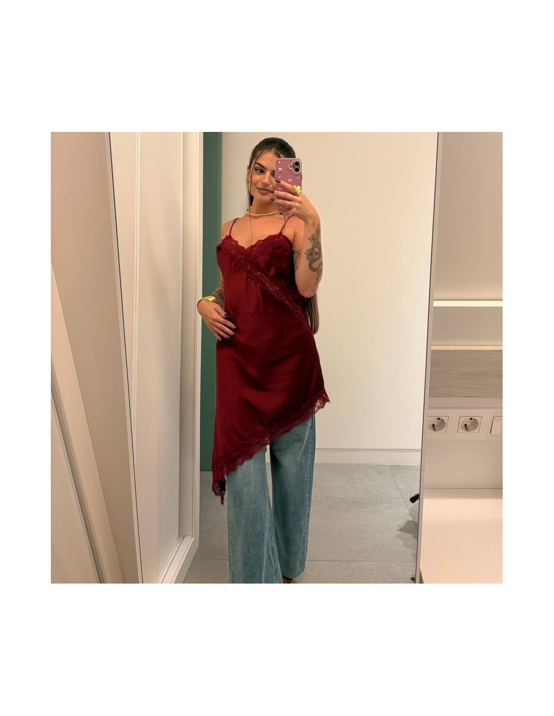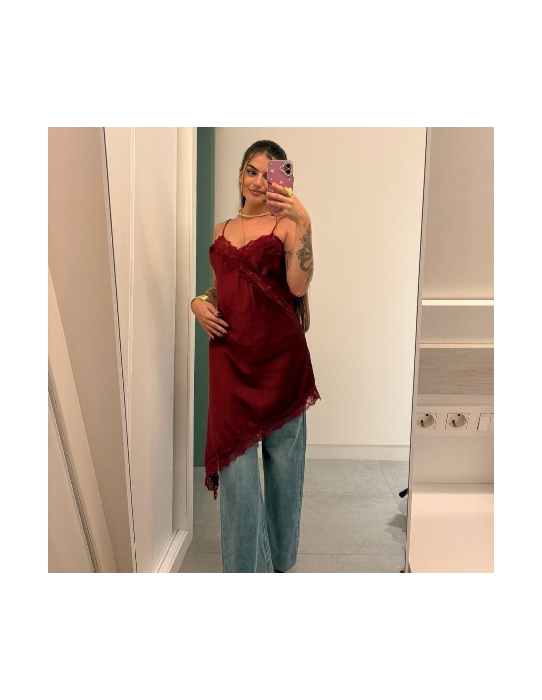 Vestido lencero midi. Tirantas finas a tono. Escote V con detalle encaje. Fluido. Talla única