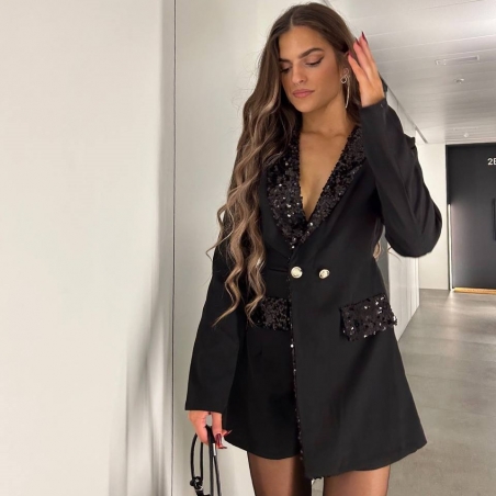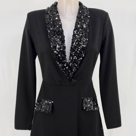 Mono corto blazer con solapa de lentejuelas a tono. BOTONES EN COLOR NEGRO NODELO 2025. Talla única.