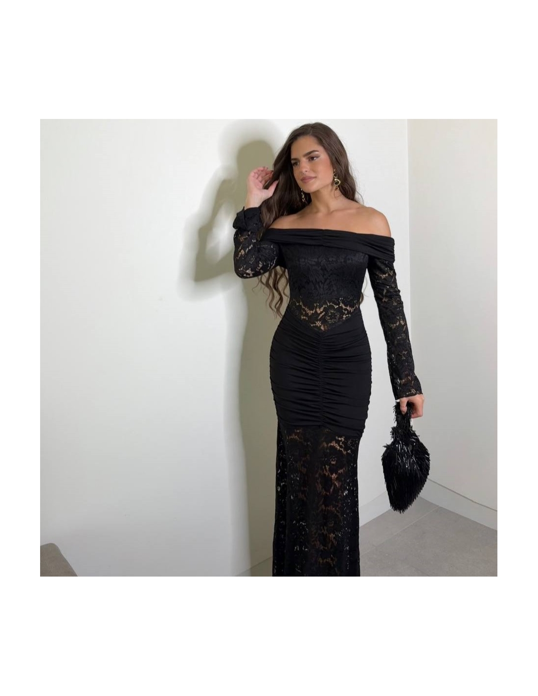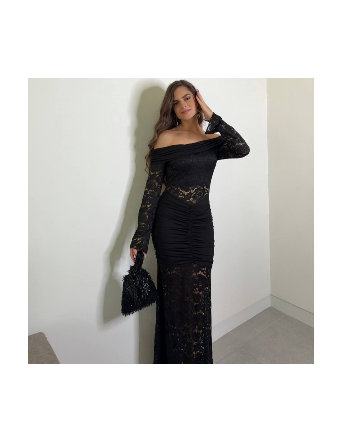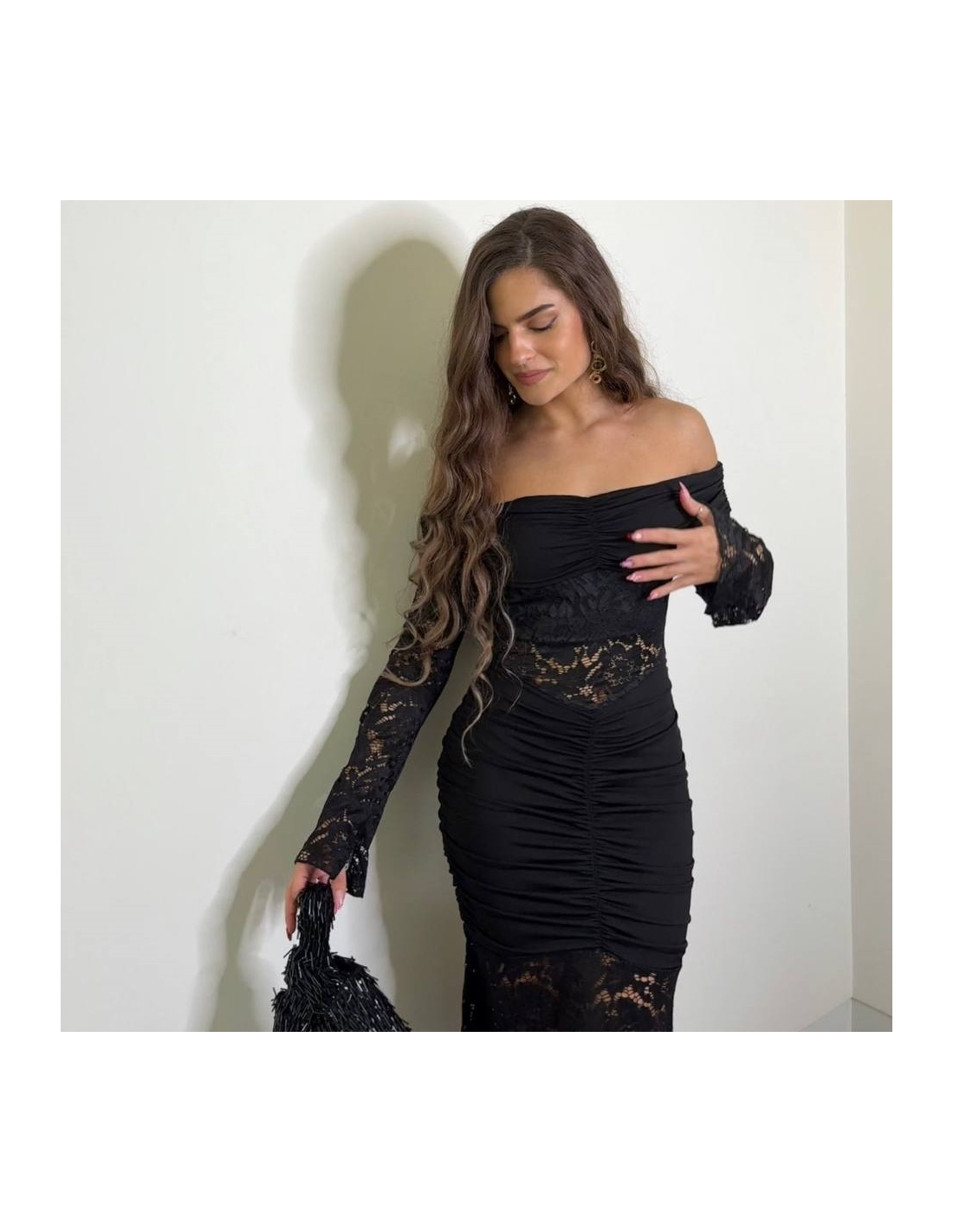Vestido fruncido de encaje negro y escote barco. Talla única.
