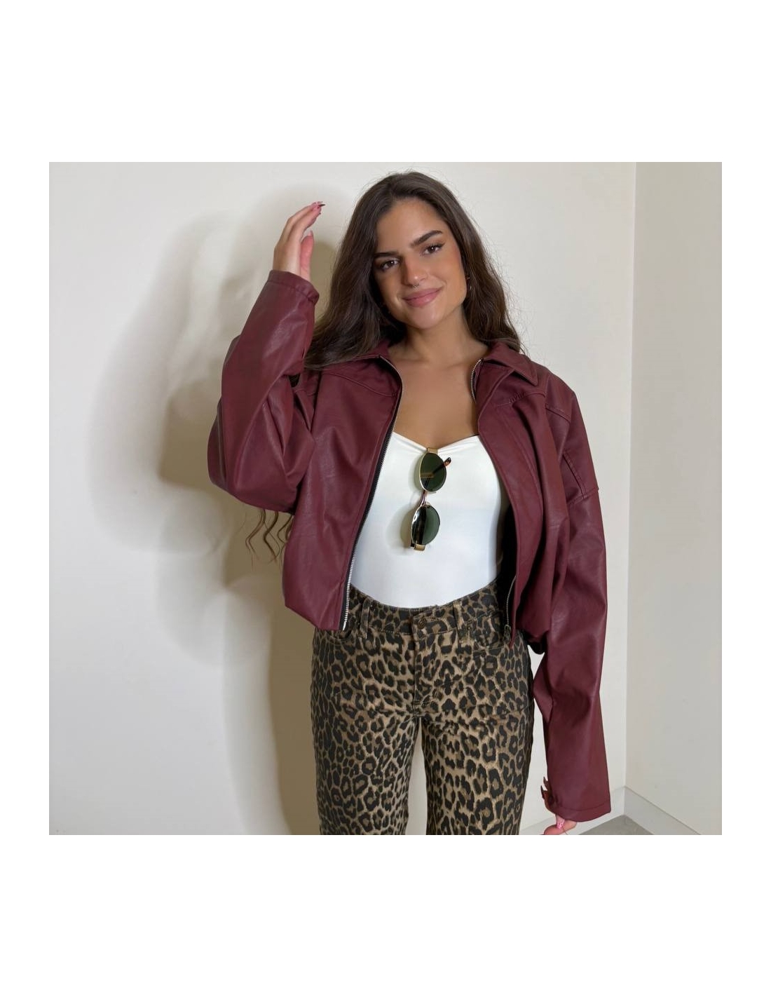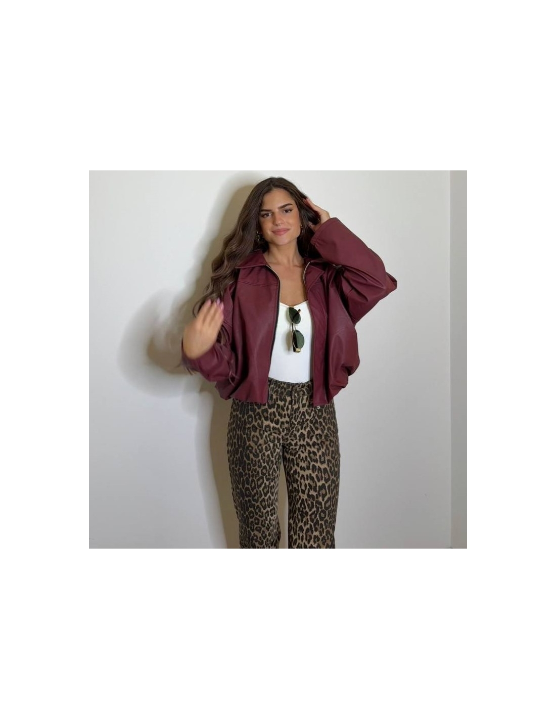 Bomber efecto piel burdeos. Con forro interior a tono. De manga larga. Cierre delanero con cremallera y botones. Talla única