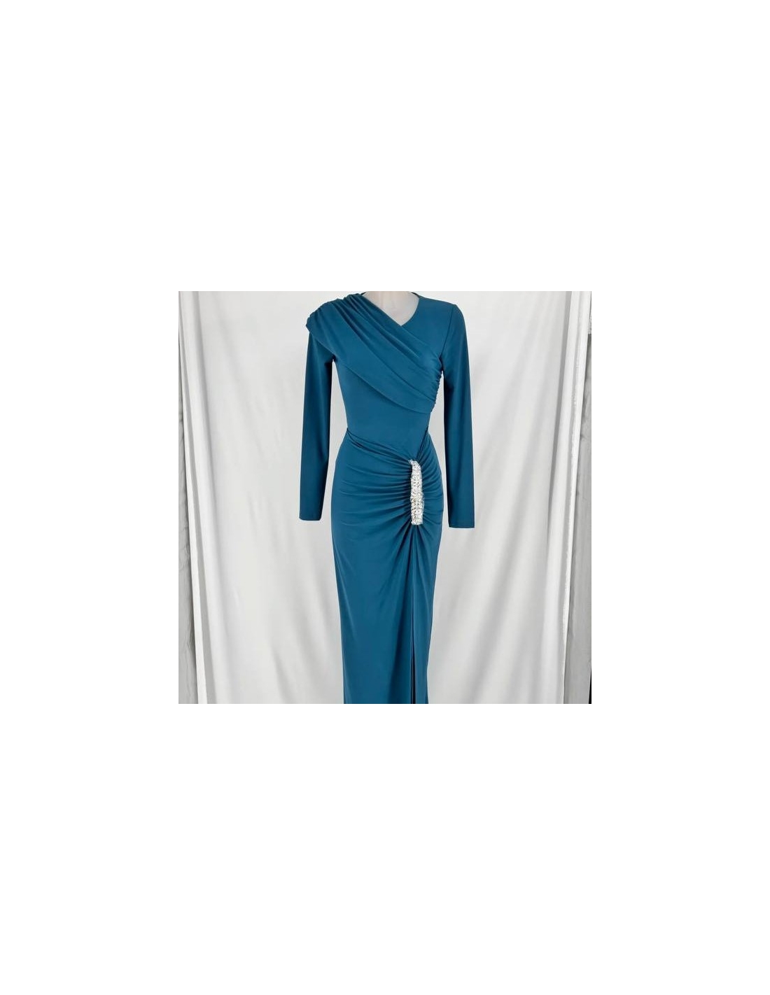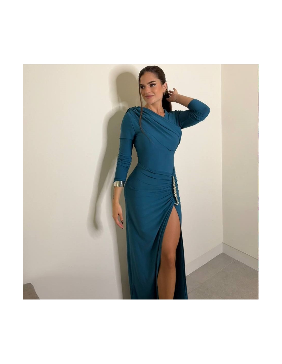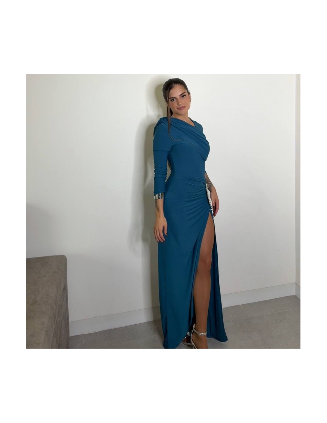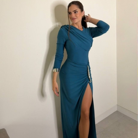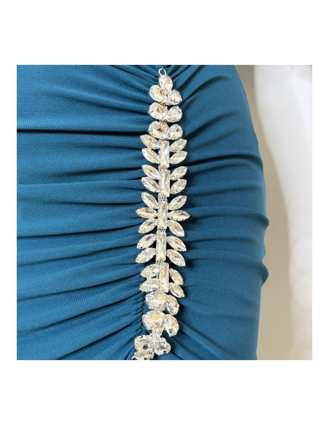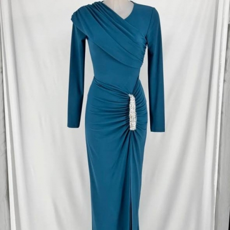 Vestido largo fruncido con hombreras. Abertura parte inferior lateral. Con detalle joya brillo. Talla única.