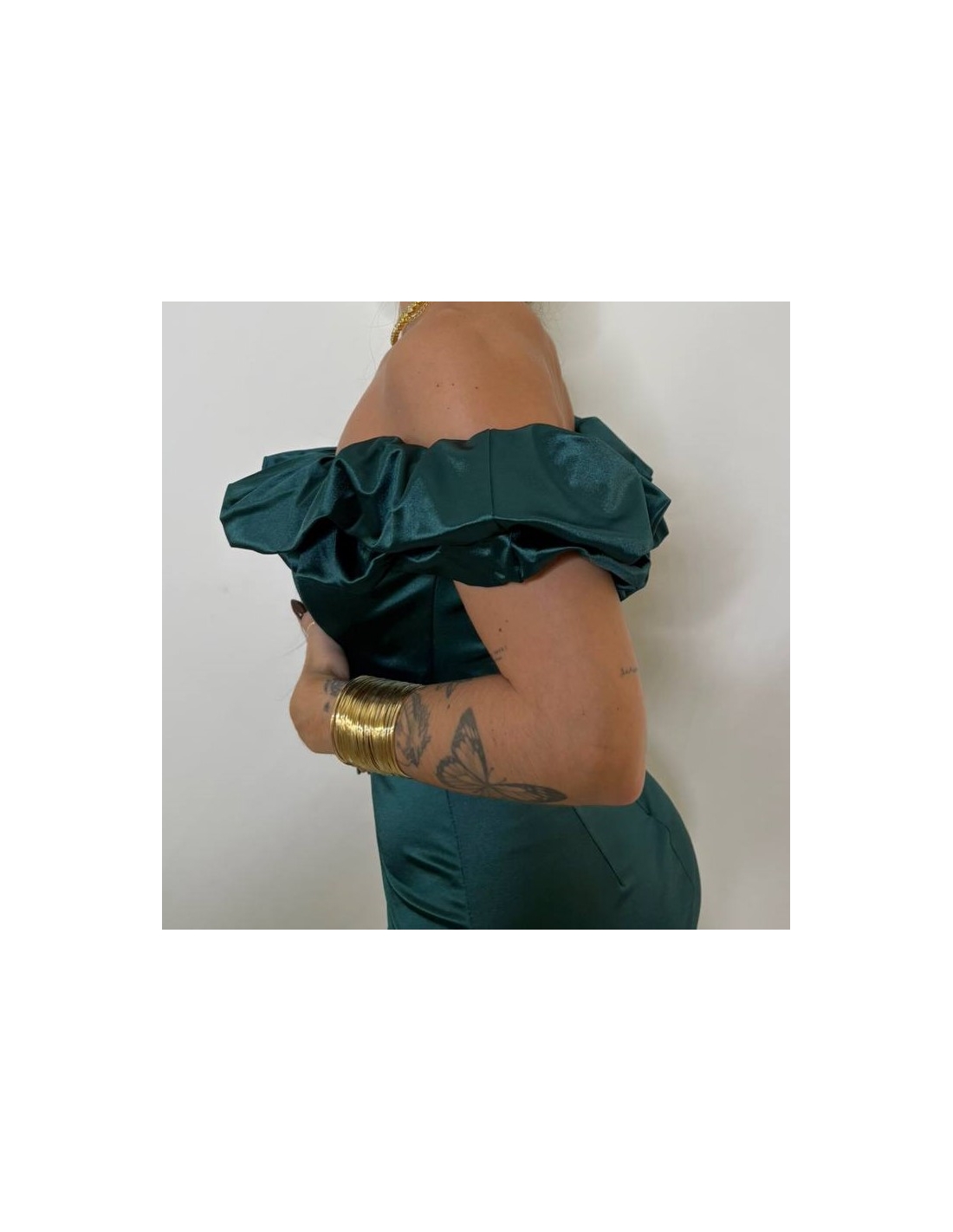 Vestido satén corto en tono verde esmeralda. Volante en escote. Cierre trasero con cremallera oculta. Ideal para talla XS-S. Talla única