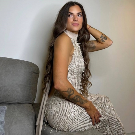 Mono flecos largo de lentejuelas. De campana. Regulable con lazada al cuello. Con forro a tono. Talla única